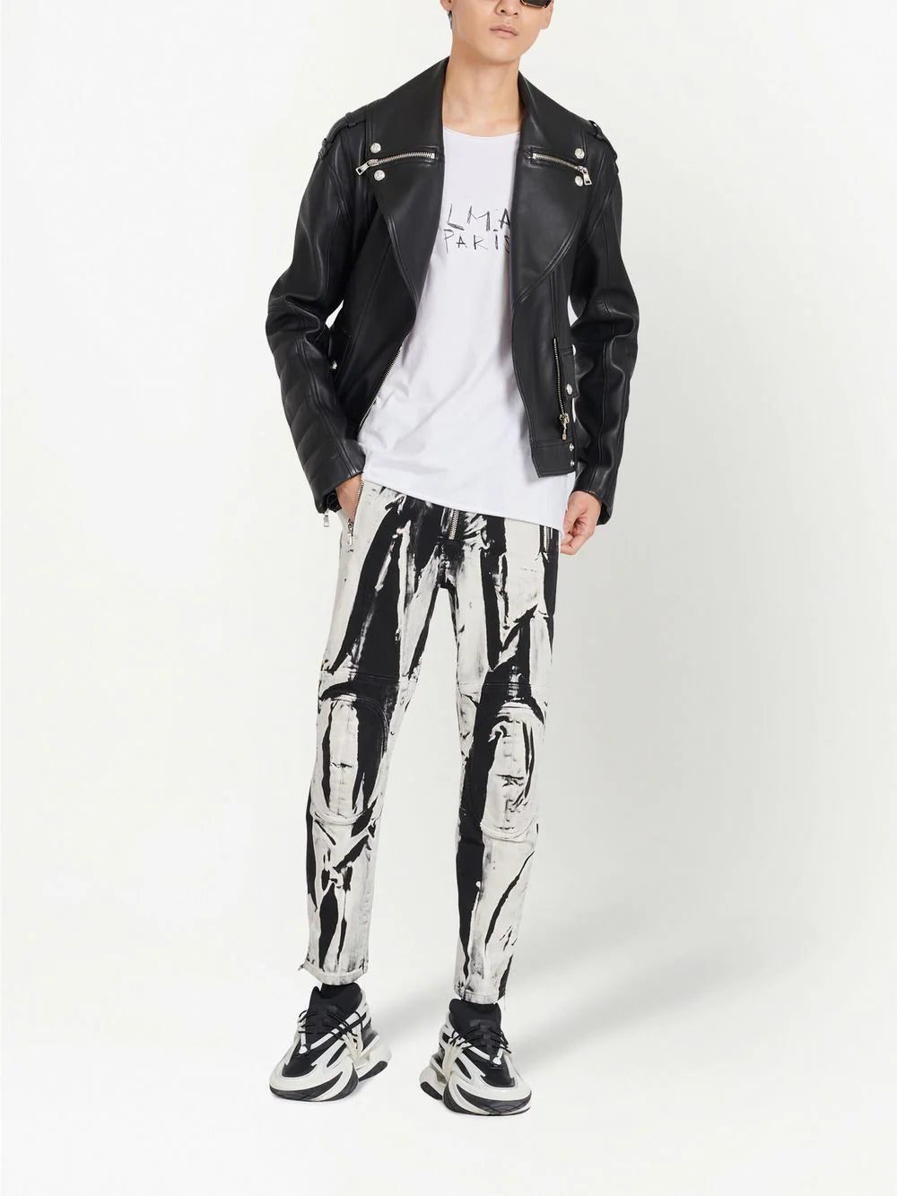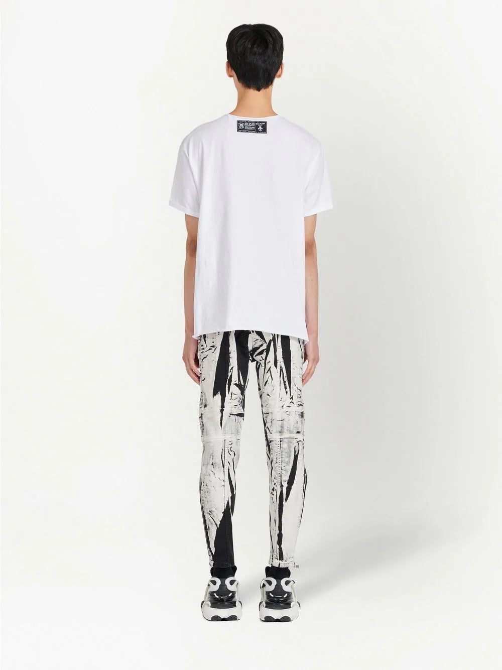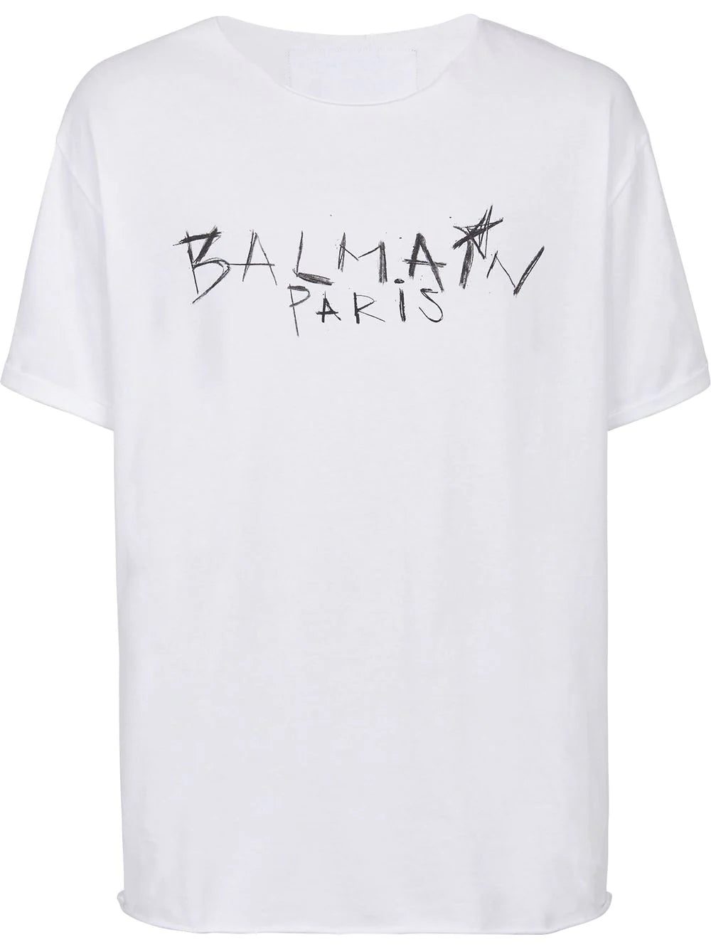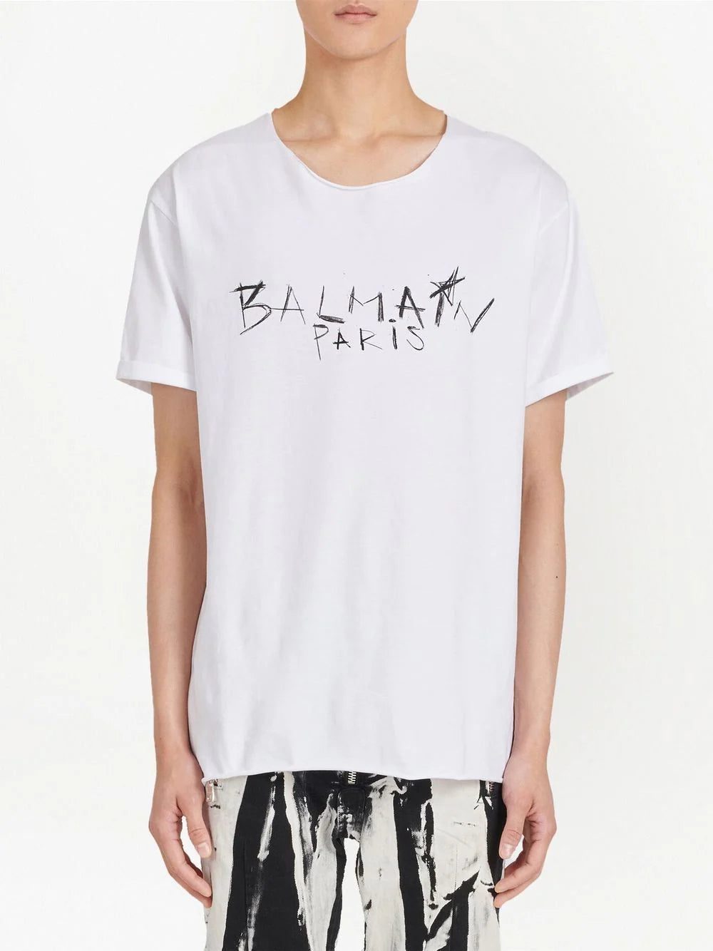 Off white/black cotton logo-print cotton T-shirt from Balmain featuring raw-cut finish, logo print to the front, round neck, short sleeves and rolled trim.