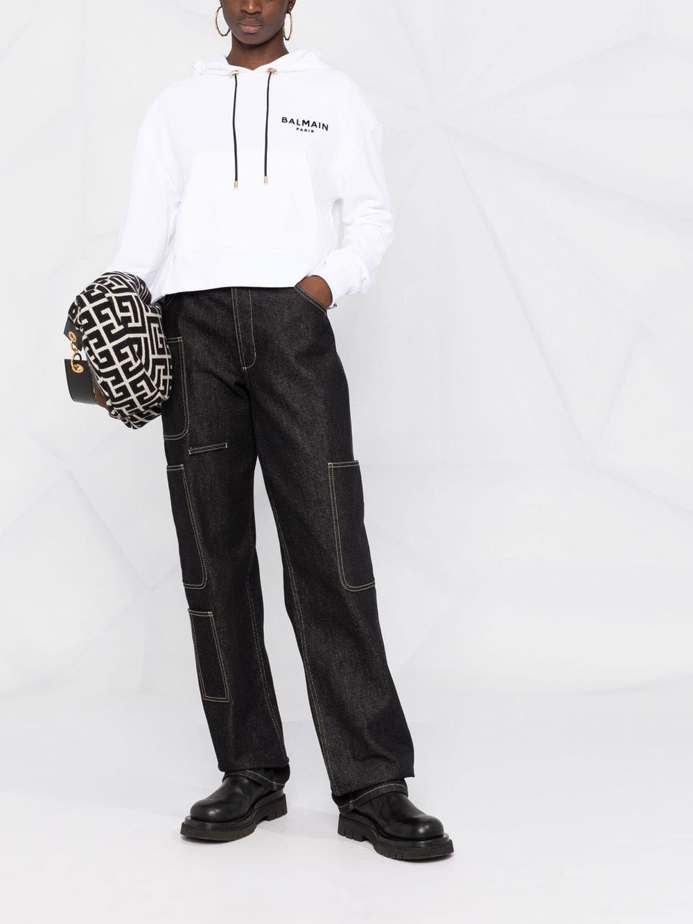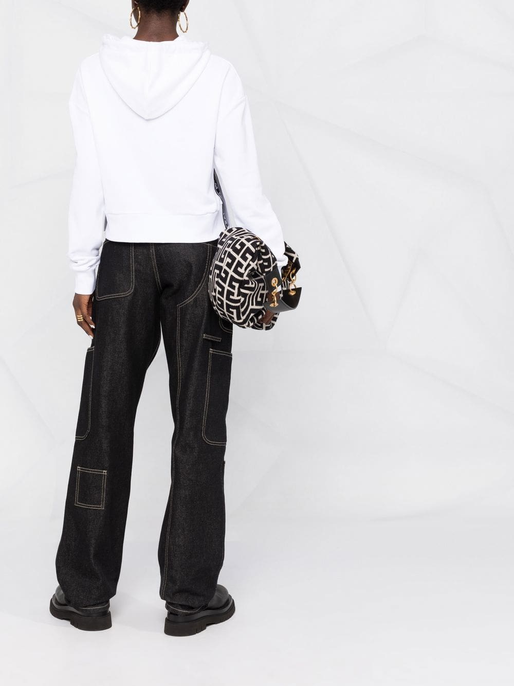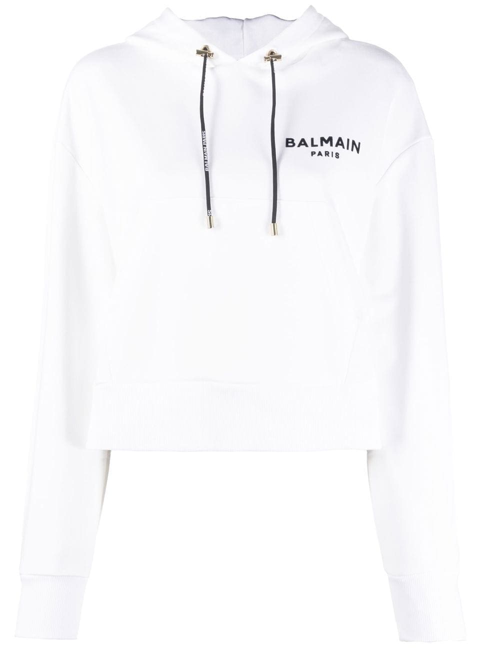 white cotton drawstring hood front pouch pocket ribbed-knit edge drop shoulder long sleeves