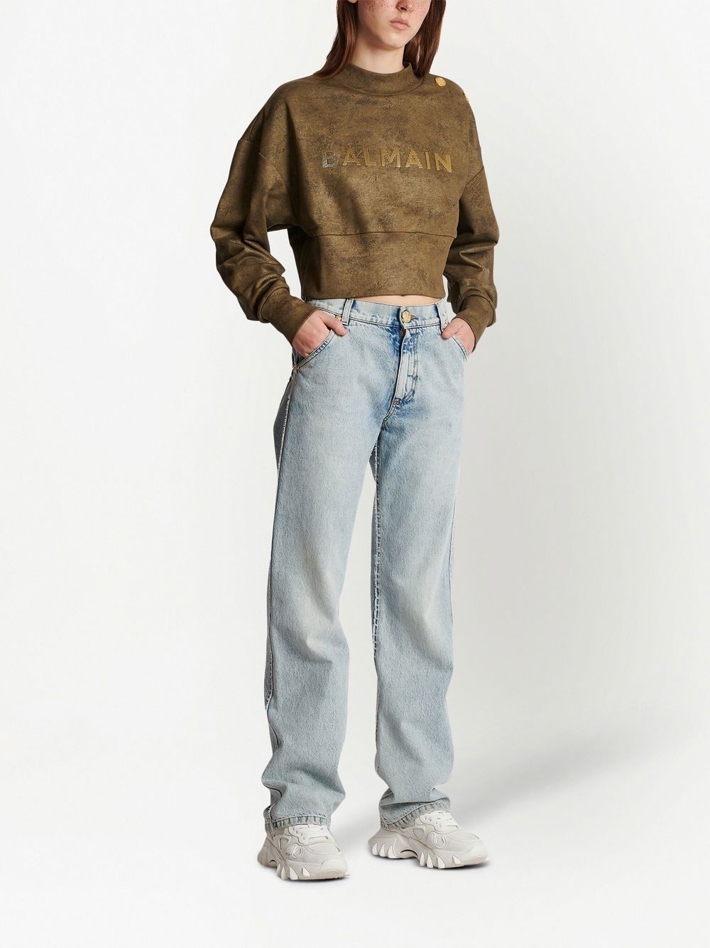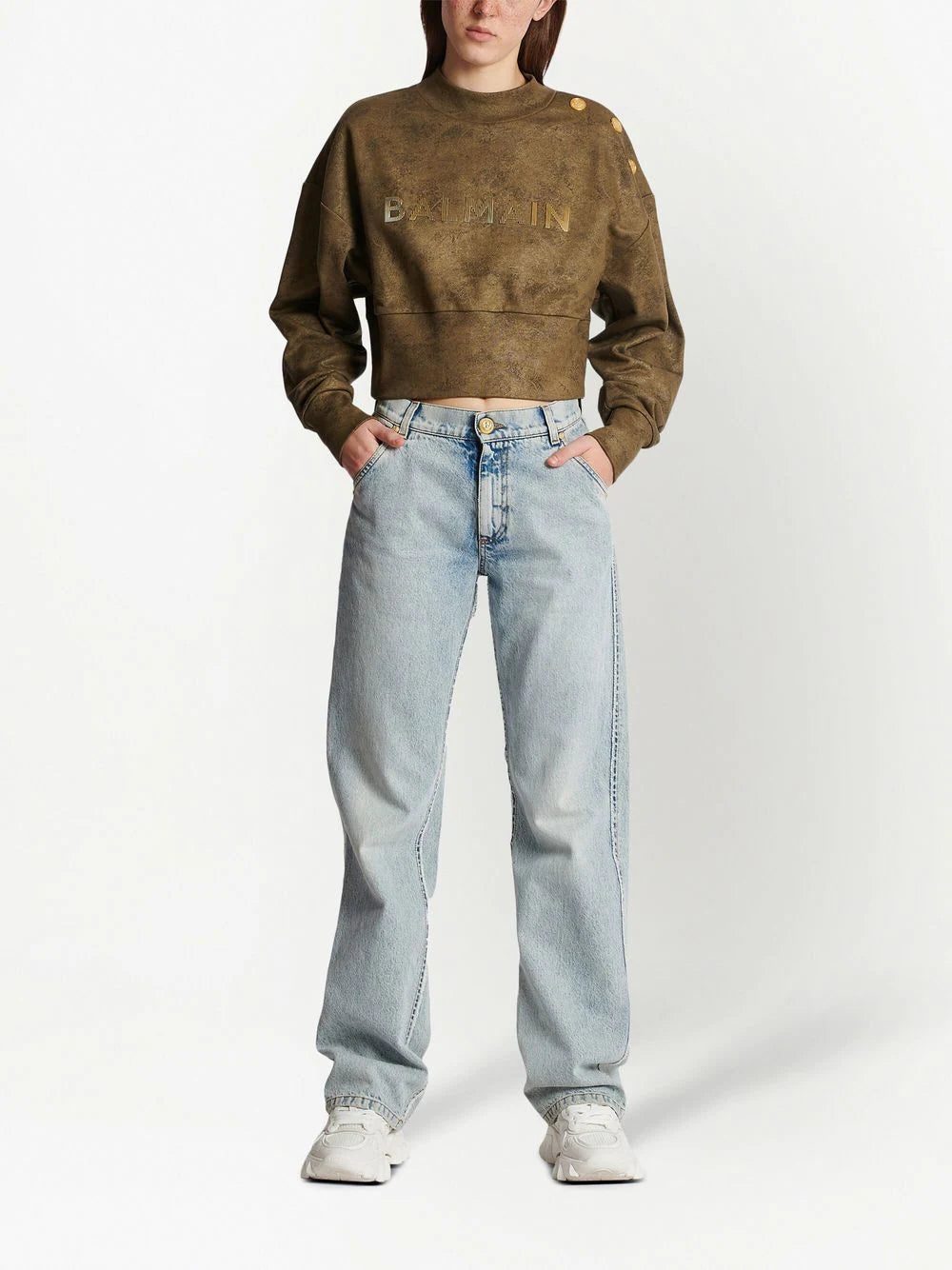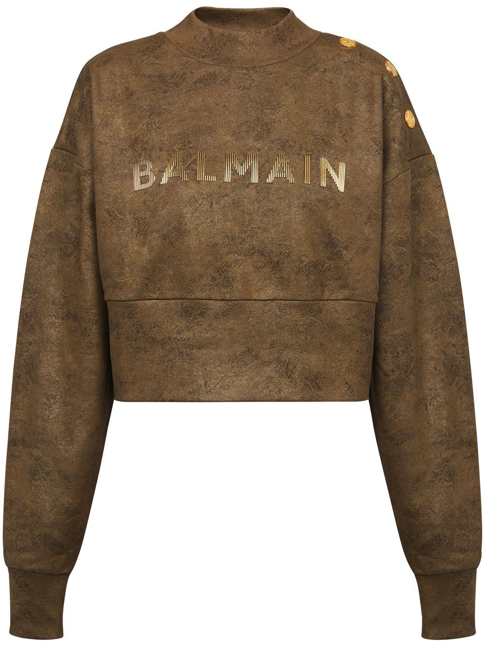 logo-print detail sweatshirt from Balmain featuring button fastening at the shoulder, cognac brown, organic cotton, ribbed detailing, logo print to the front, round neck, long sleeves and straight hem.