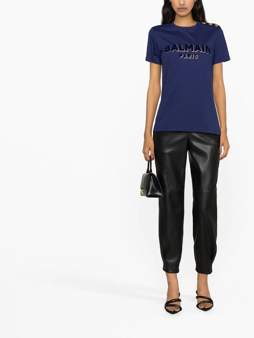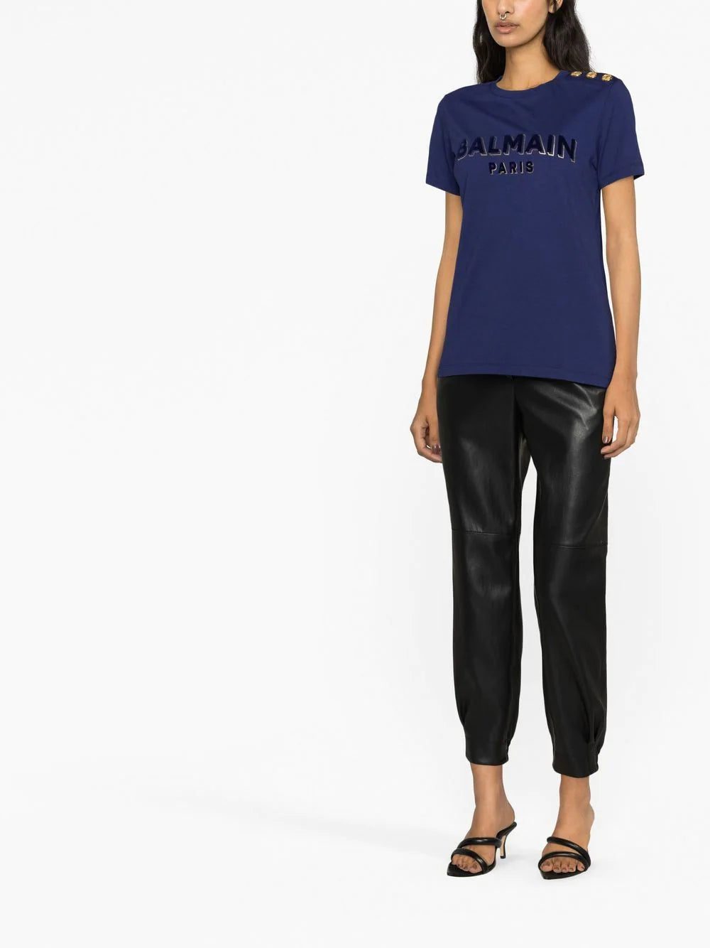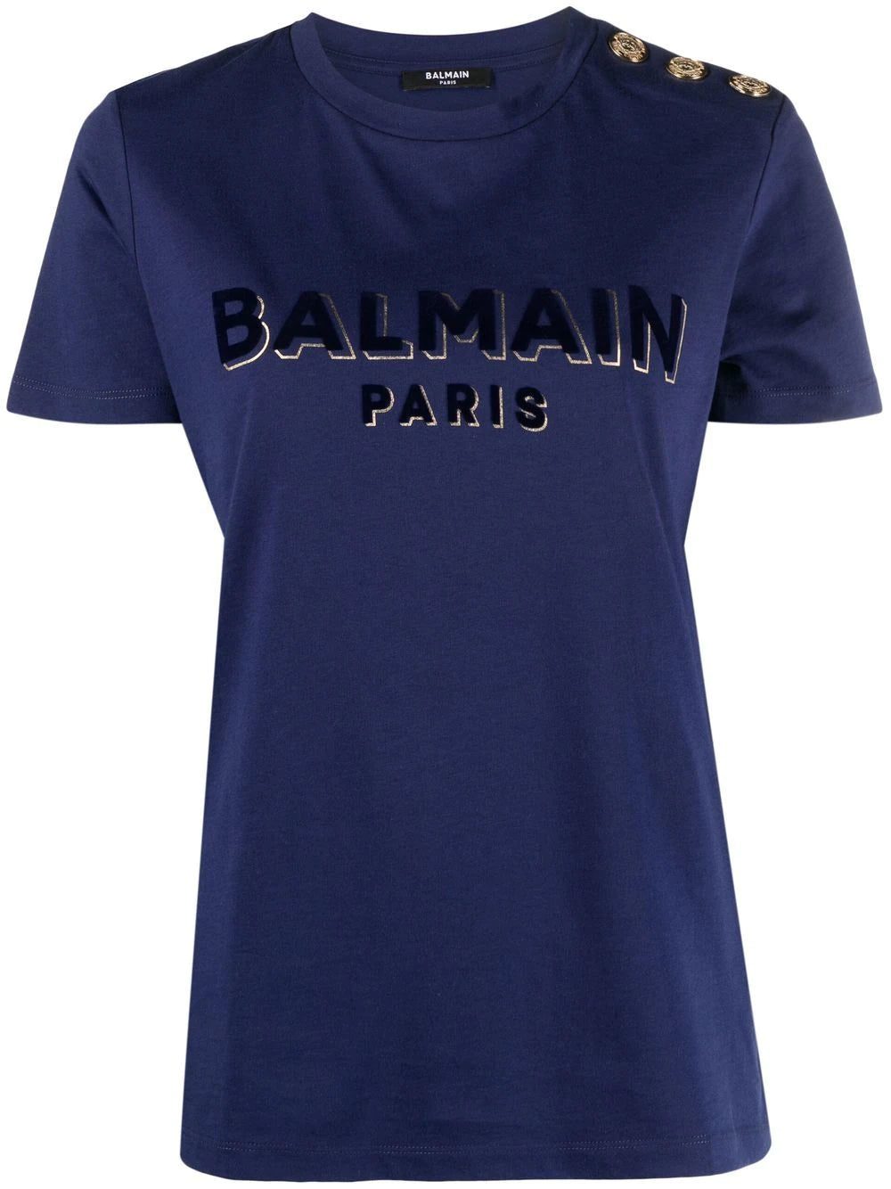 This navy blue cotton T-shirt by Balmain showcases a distinctly branded style. It's punctuated with a bold flocked logo and gold-tone shoulder buttons for a recognisable aesthetic.
