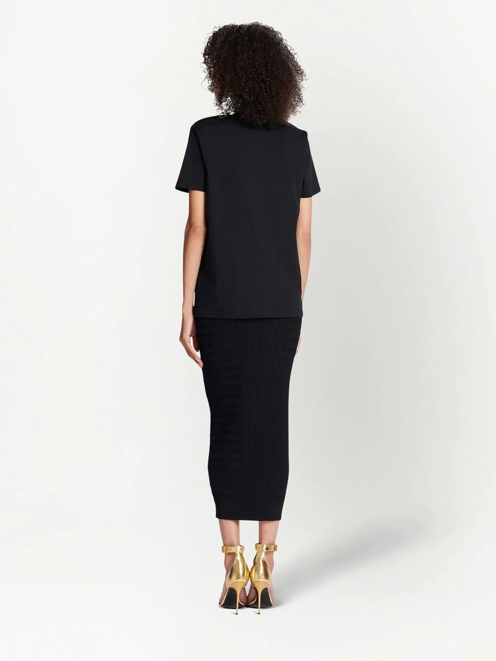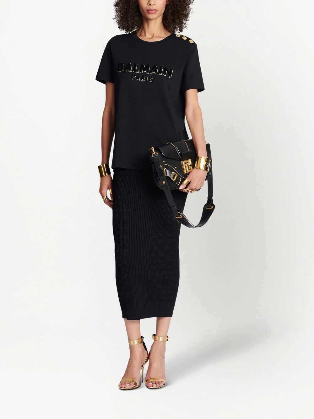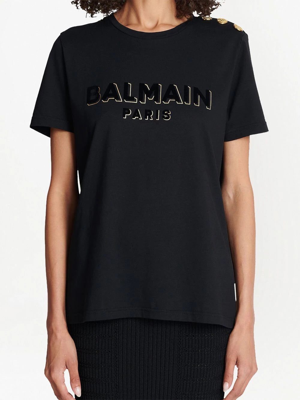 logo-print short-sleeve T-shirt from Balmain featuring black, gold-tone, cotton, logo print to the front, round neck, button fastening at the shoulder, short sleeves and straight hem.