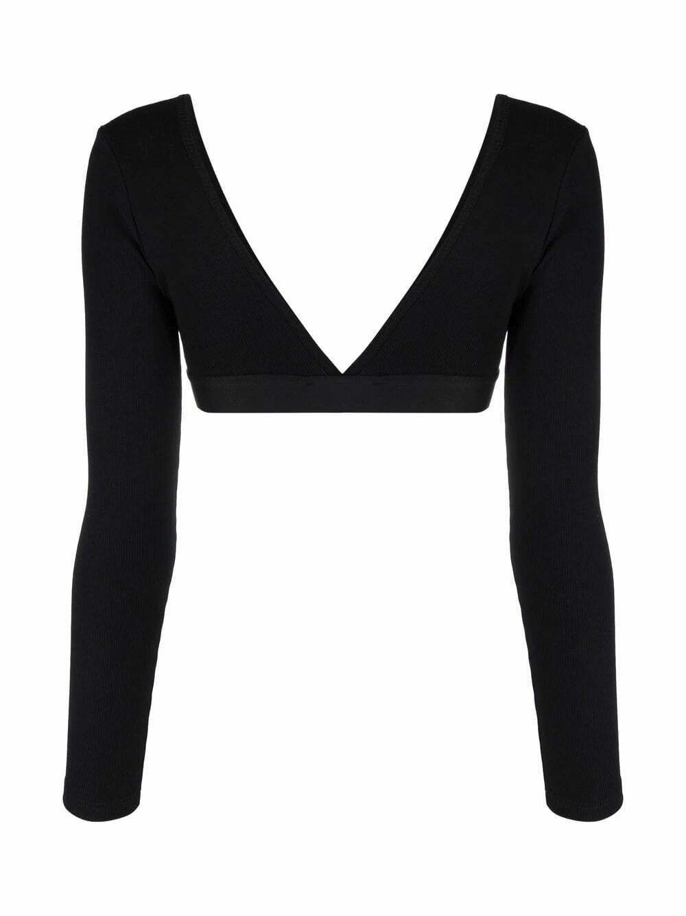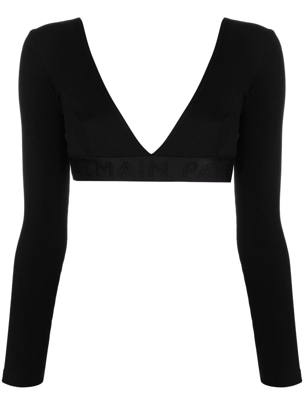 Black stretch cotton long-sleeve crop top from Balmain featuring cropped, V-neck and long sleeves.