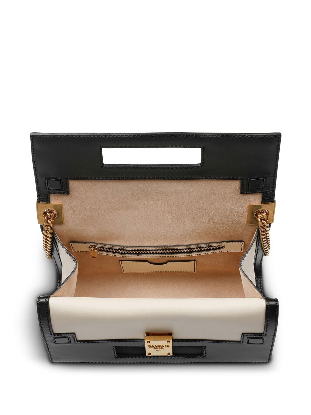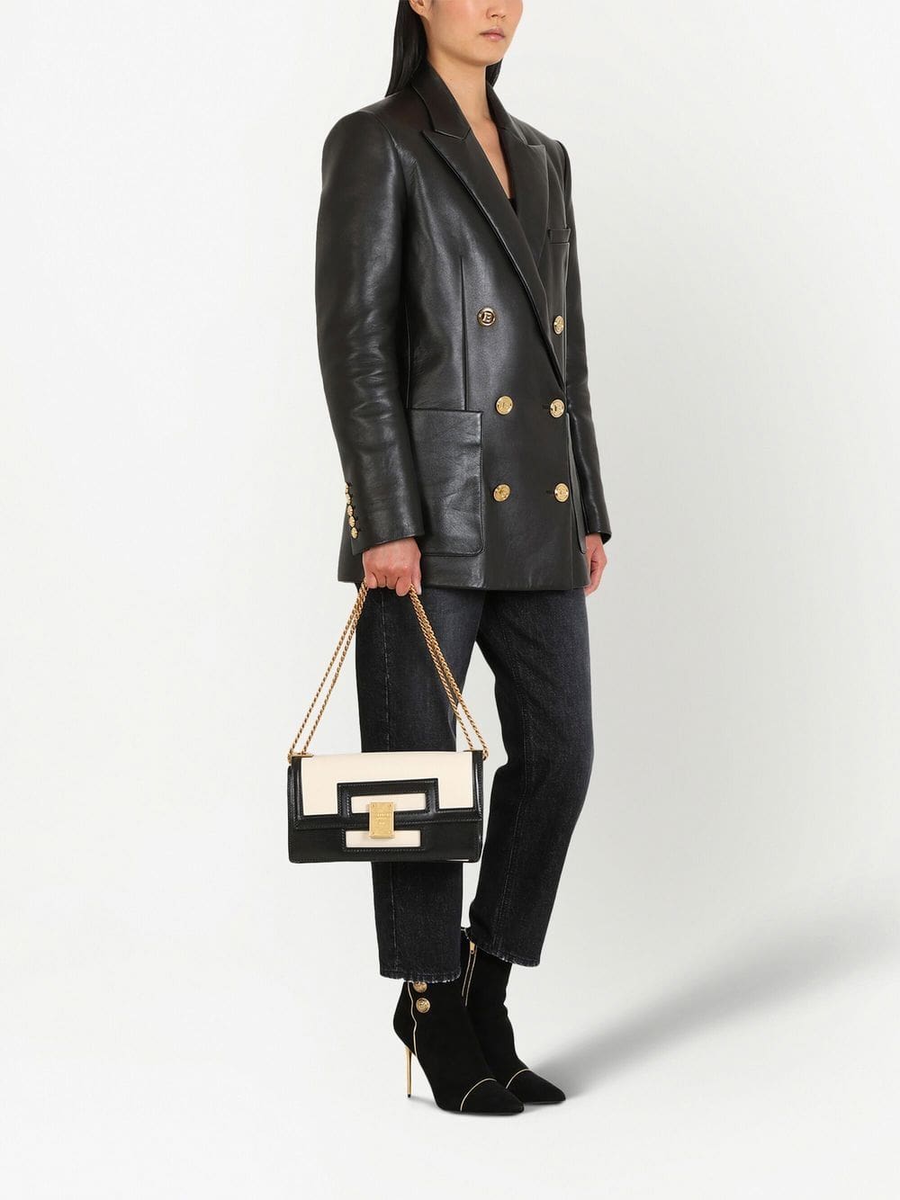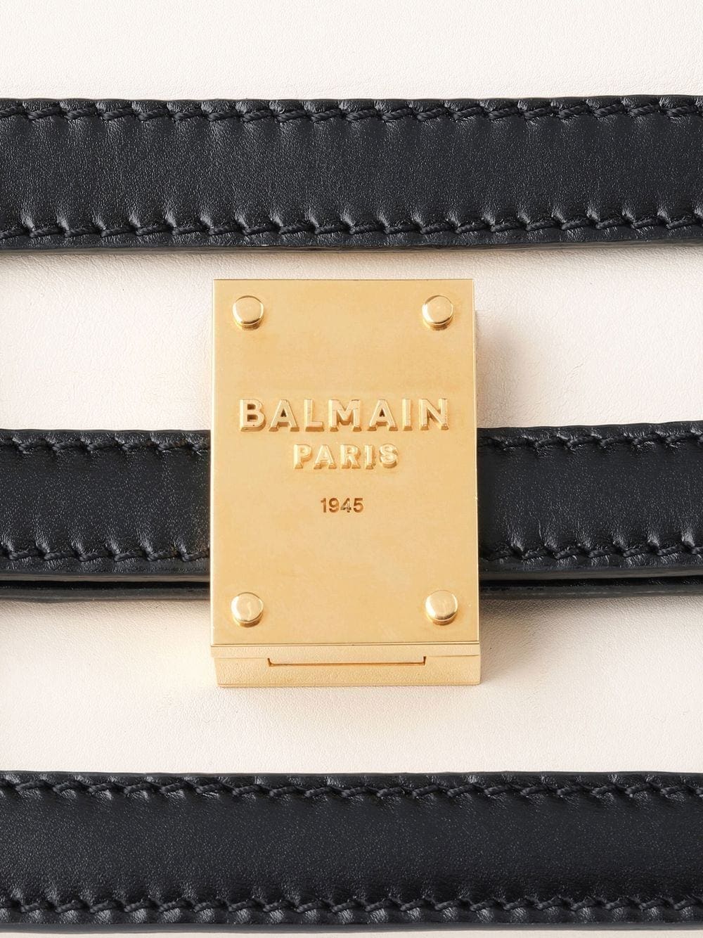 In a timeless white and black colourway, Balmain's 1945 Heritage bag evokes the Parisian house's identity and craftsmanship. Made from smooth calfskin and complete with gold-tone hardware, this accessory benefits from an adjustable strap that allows it to be worn in multiple ways.