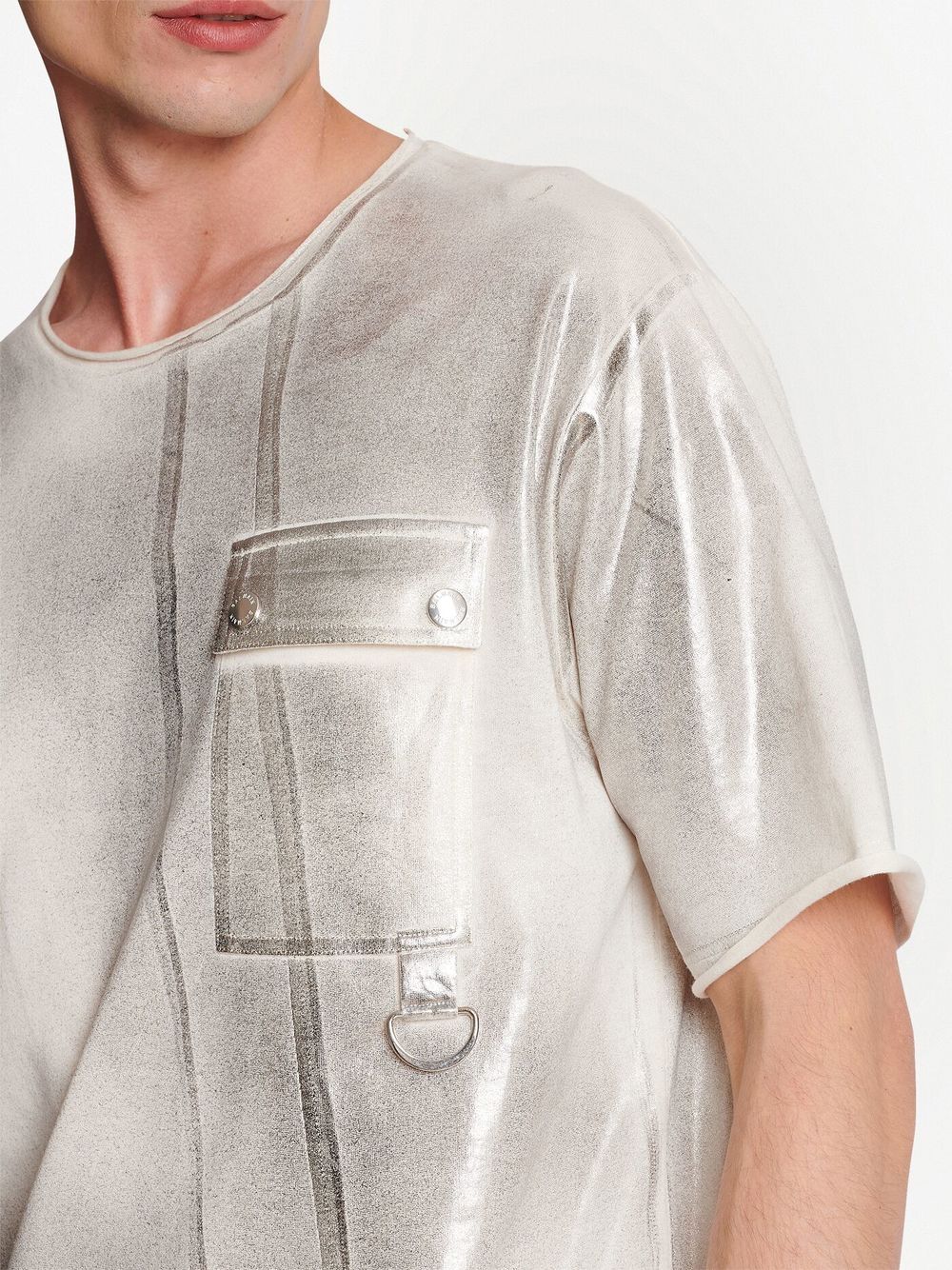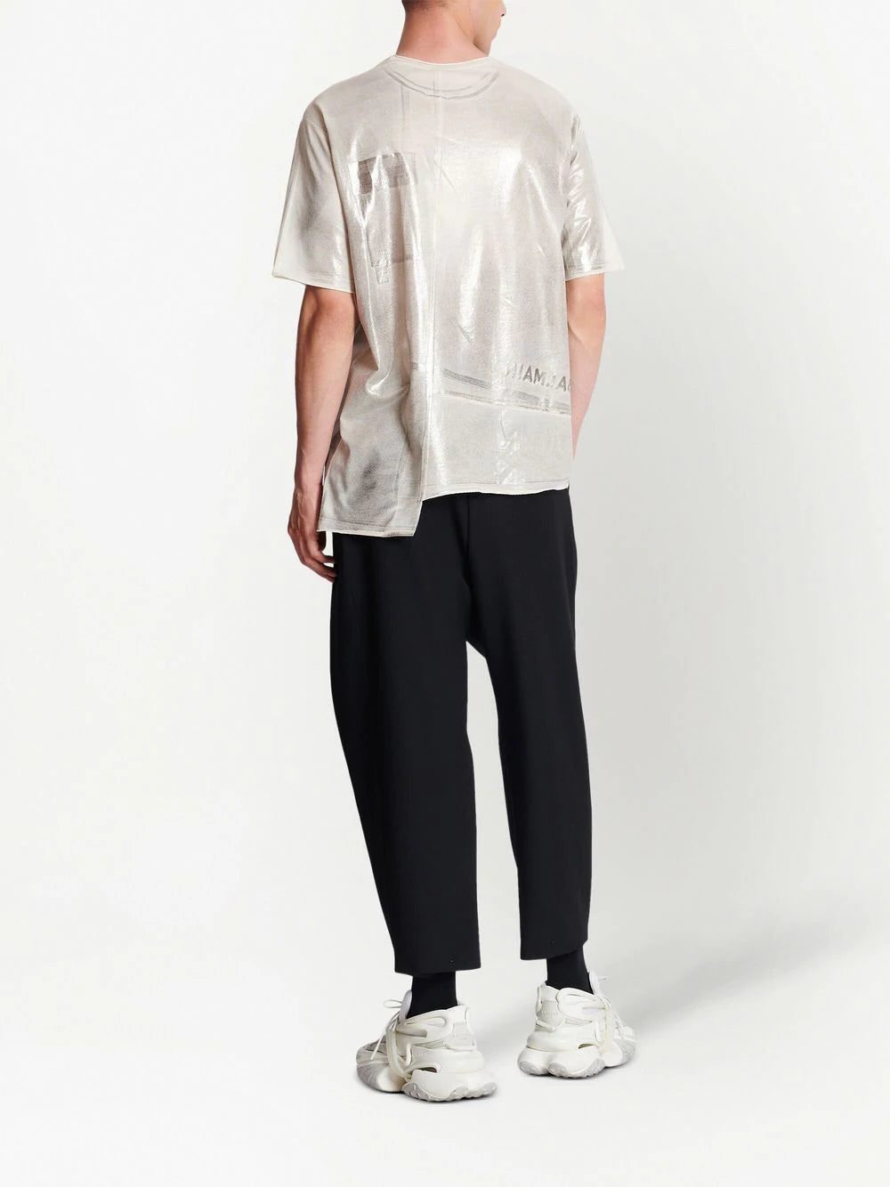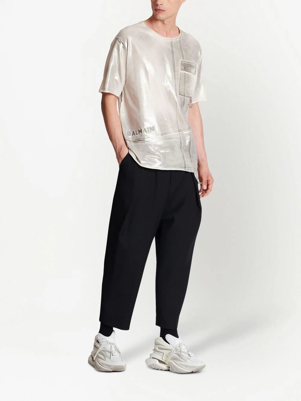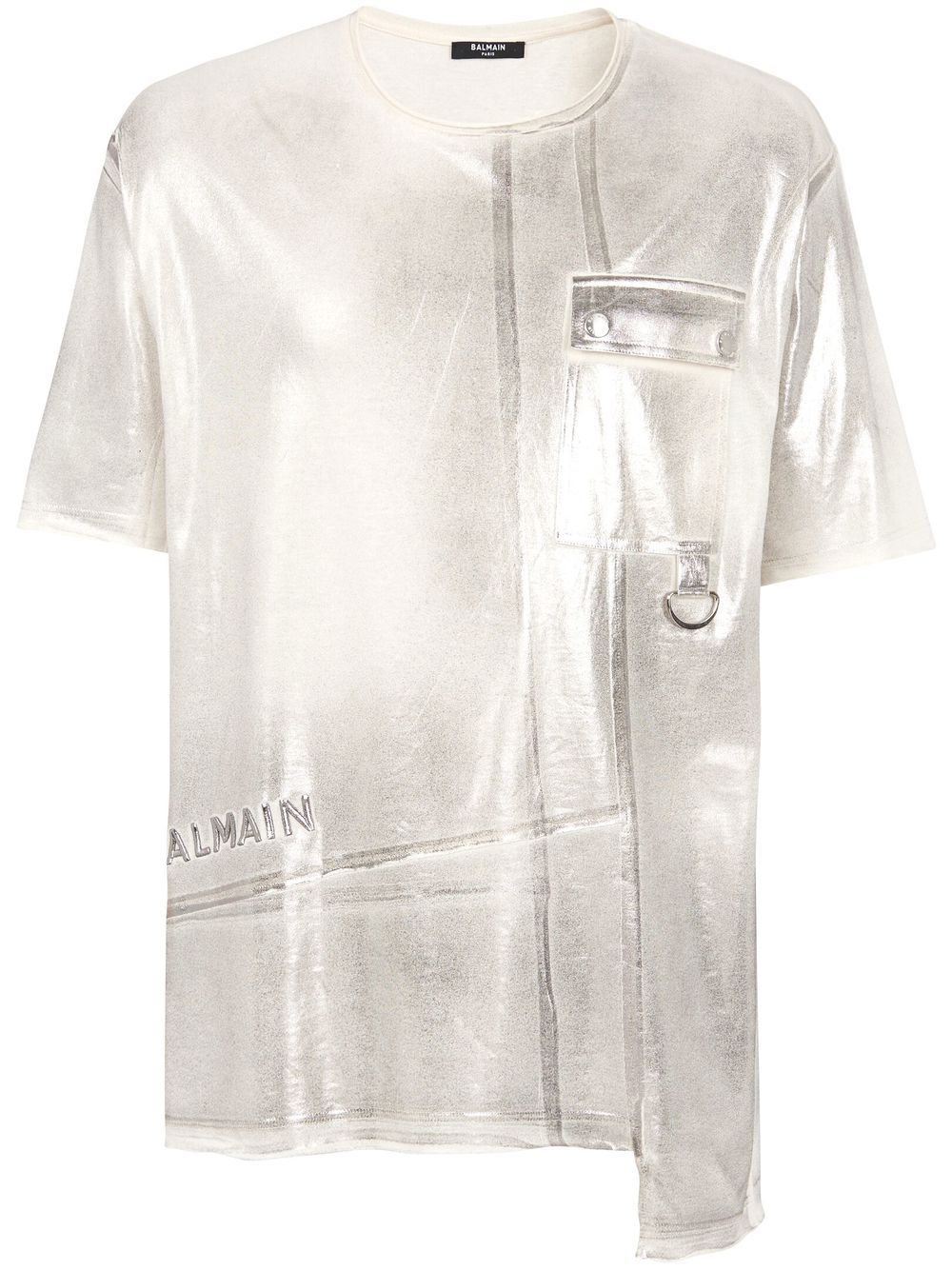metallic-effect pocket T-shirt from Balmain featuring silver, organic cotton, jersey knit, metallic effect, crew neck, short sleeves, chest flap pocket and straight hem. Conscious: This item is made from at least 50% organic materials.