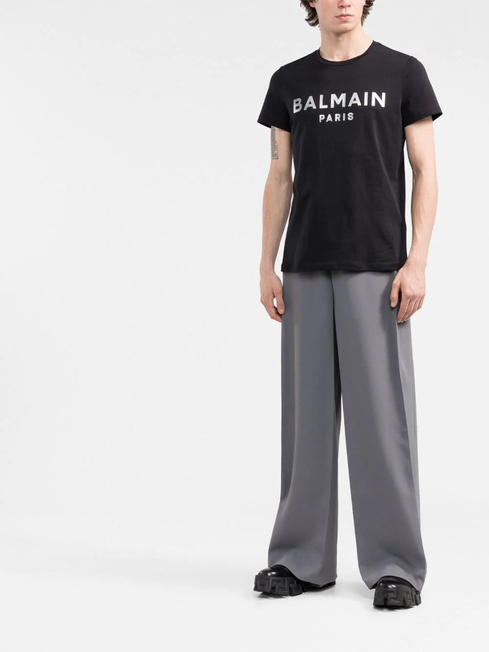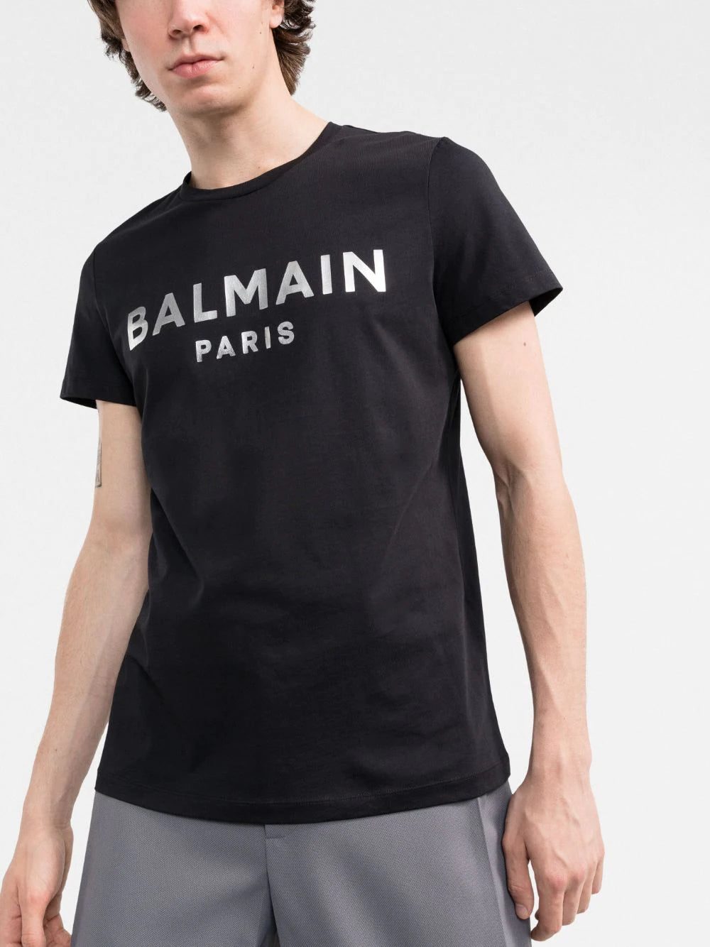 Balmain fuses their affinity for metallic accents with a knack for branded details on this cotton T-shirt, where their logo appears printed in a silver tone.