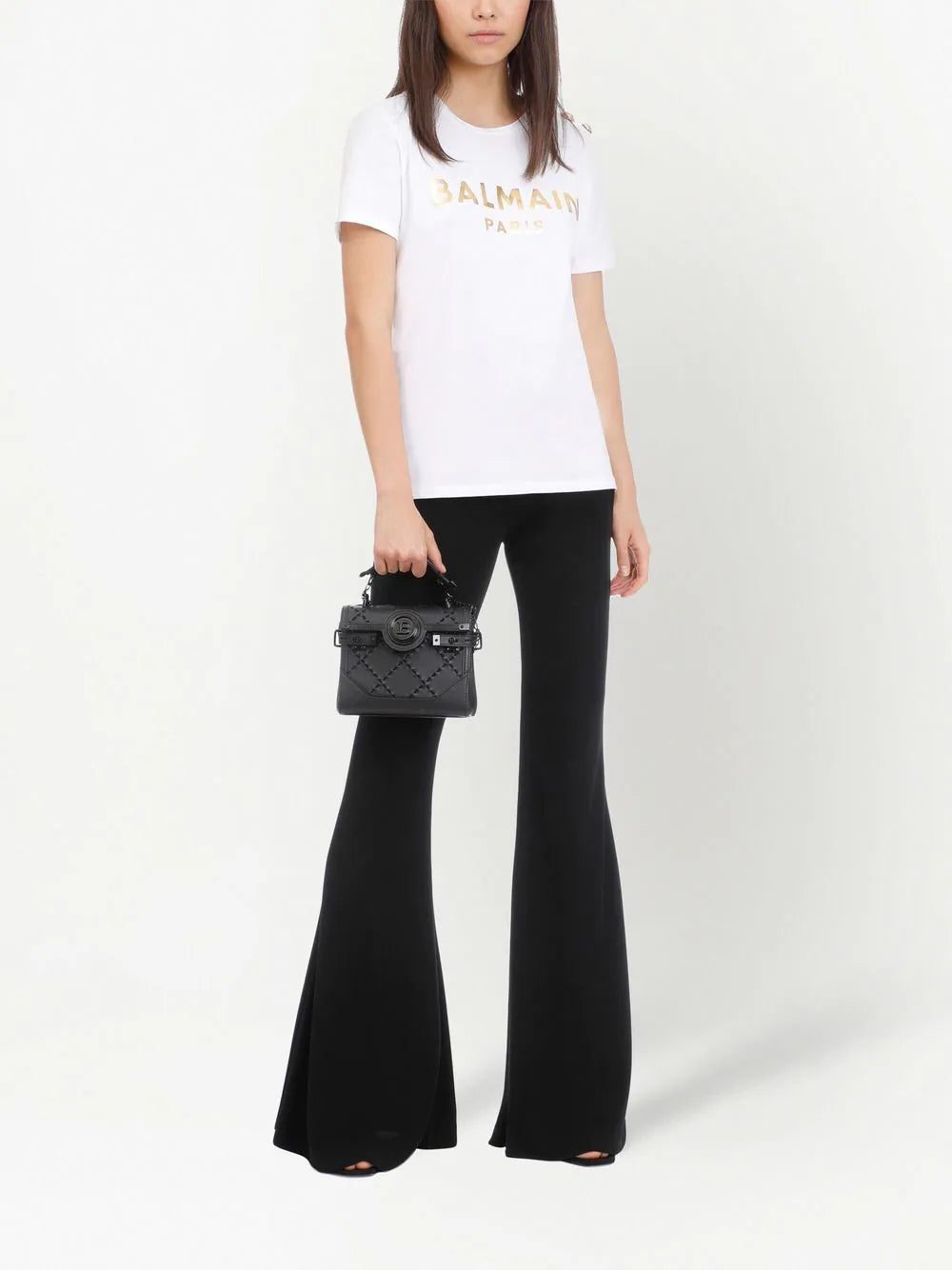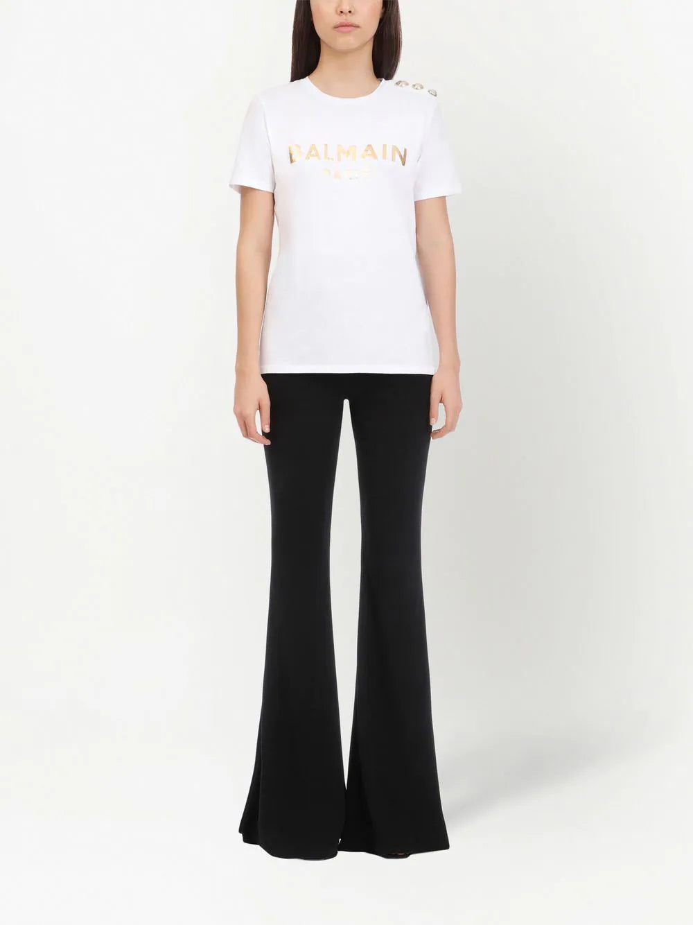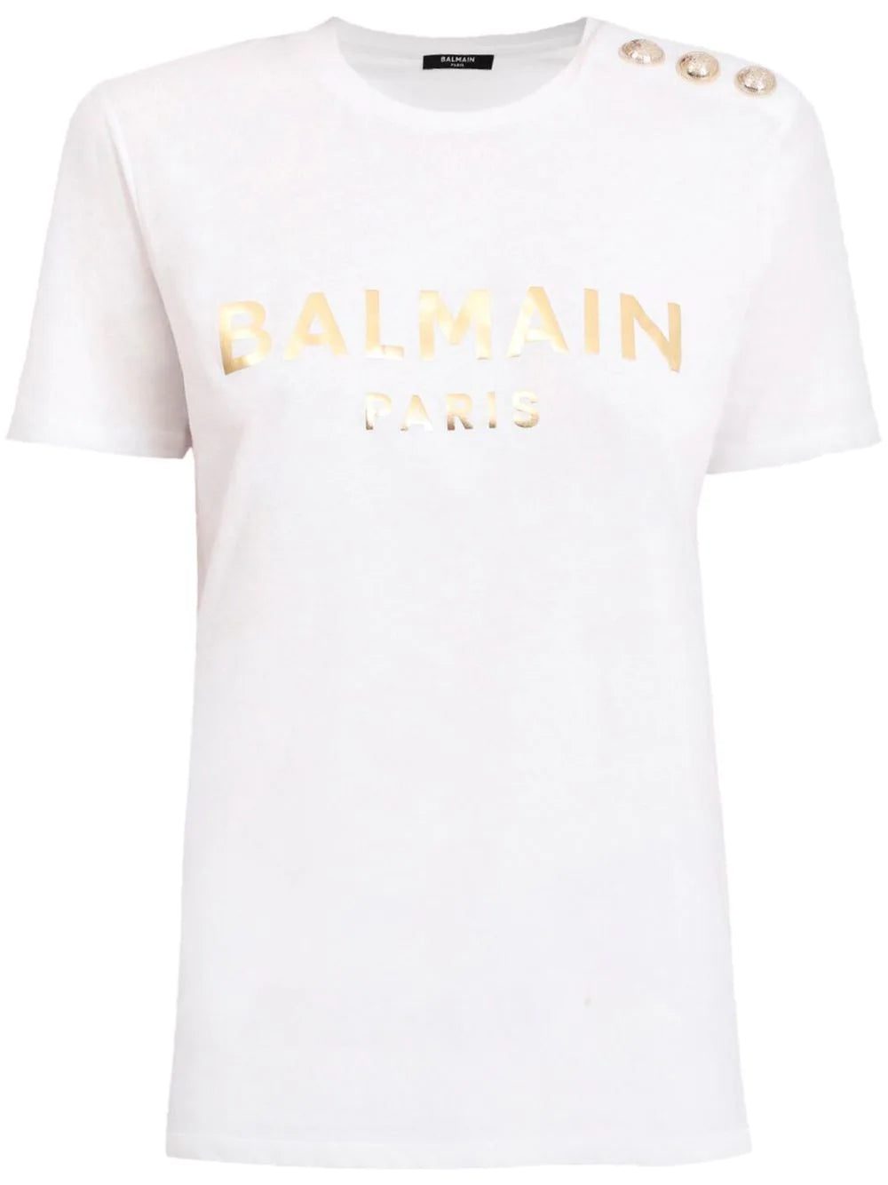 metallic-logo T-shirt from Balmain featuring white, gold-tone, cotton, logo print at the chest, metallic effect, round neck, short sleeves and straight hem.