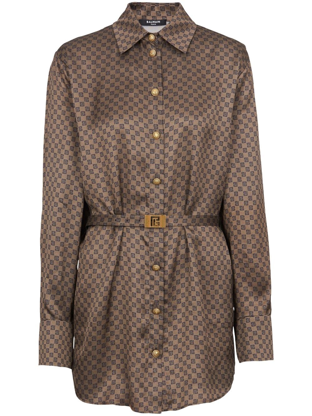 The PB monogram is an instantly identifiable insignia of the house, paying homage to the founder of the brand, Pierre Balmain. Here, the maze-like motif defines the construction of this brown shirt, lending an unmistakable look to the belted silhouette.