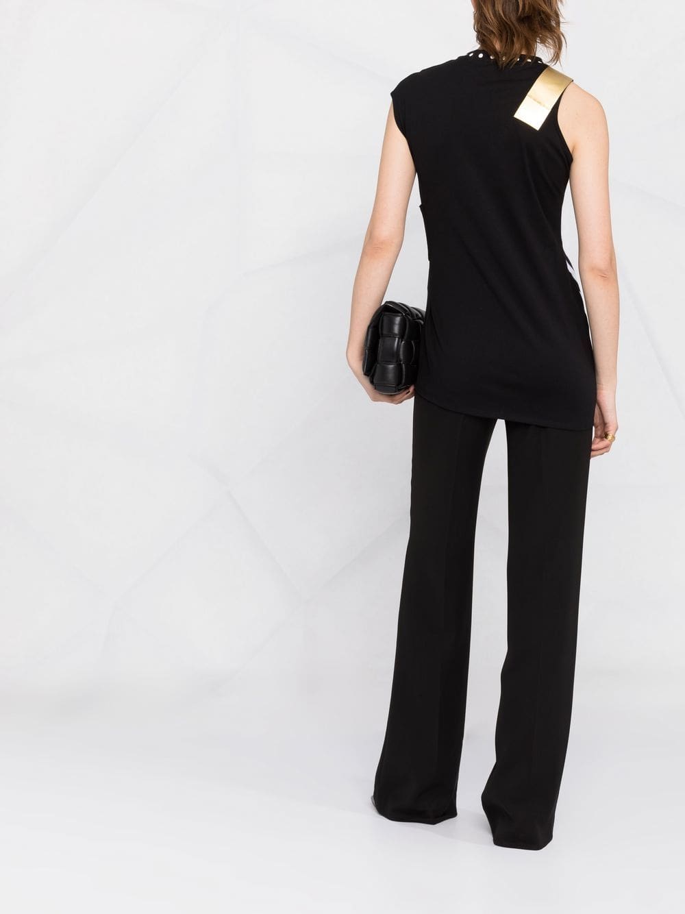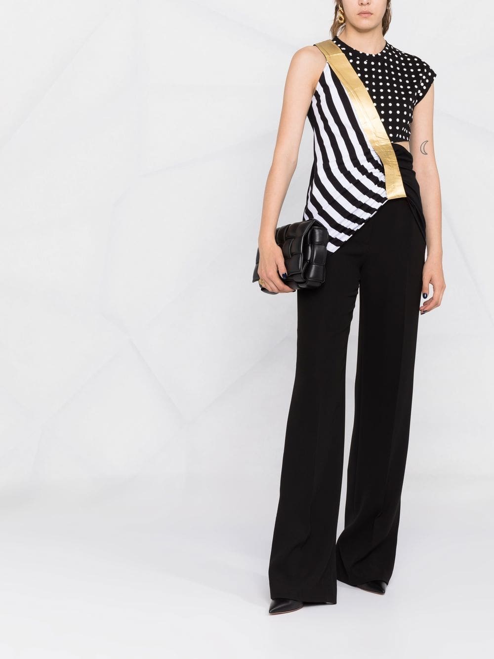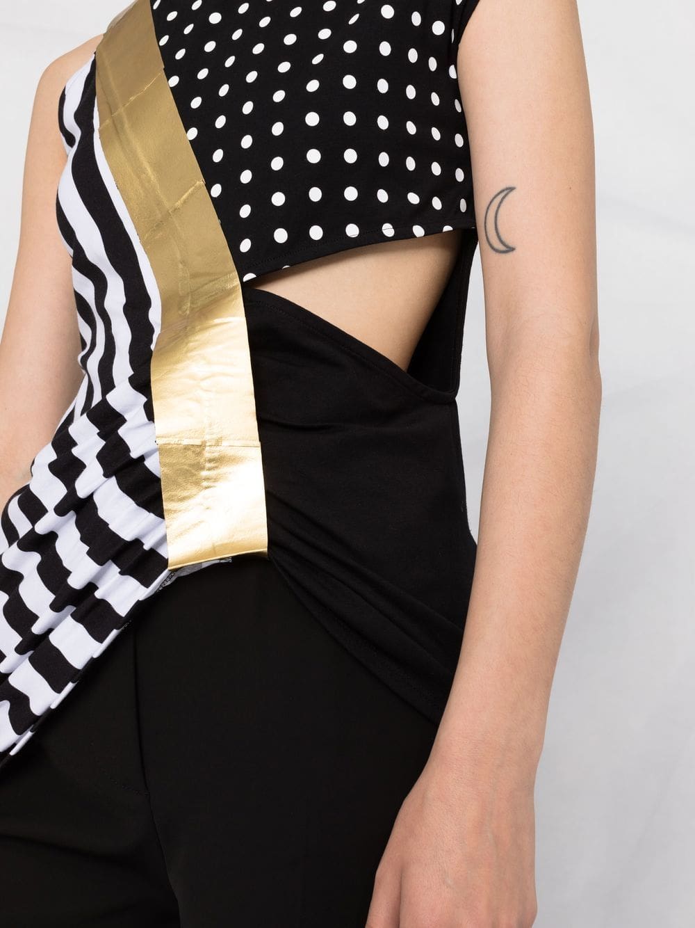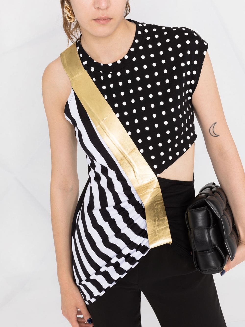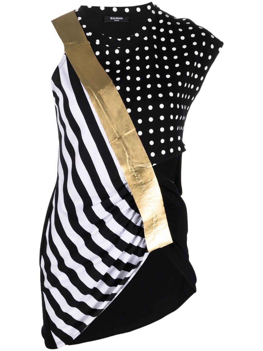 Showing the brand's bold style, this asymmetric top from Balmain's SS22 collection arrives with a mixed print of striped and polka dots, while a gold-tone band detail covers the front. Its design is crafted from cotton and features a black base colour.