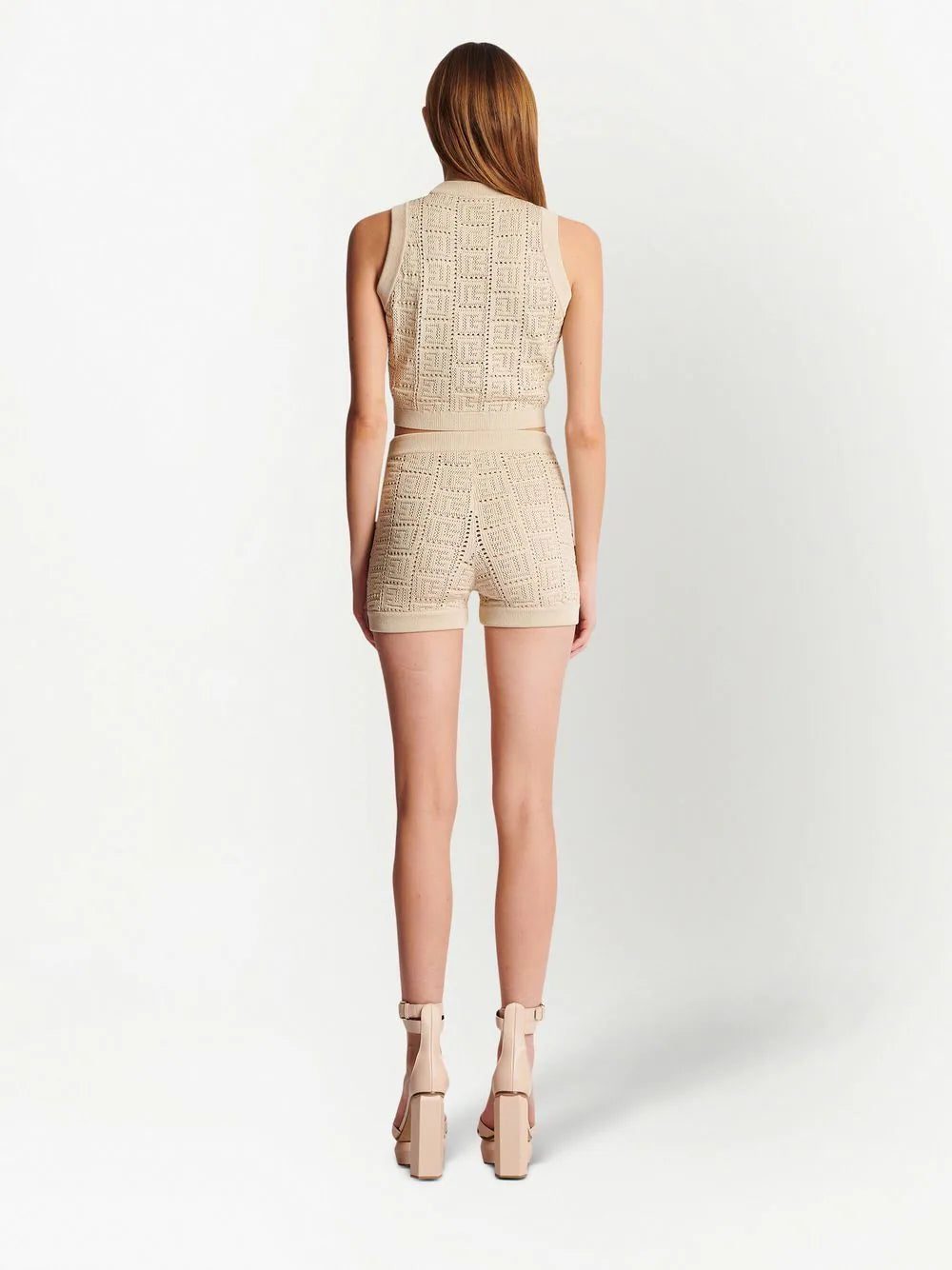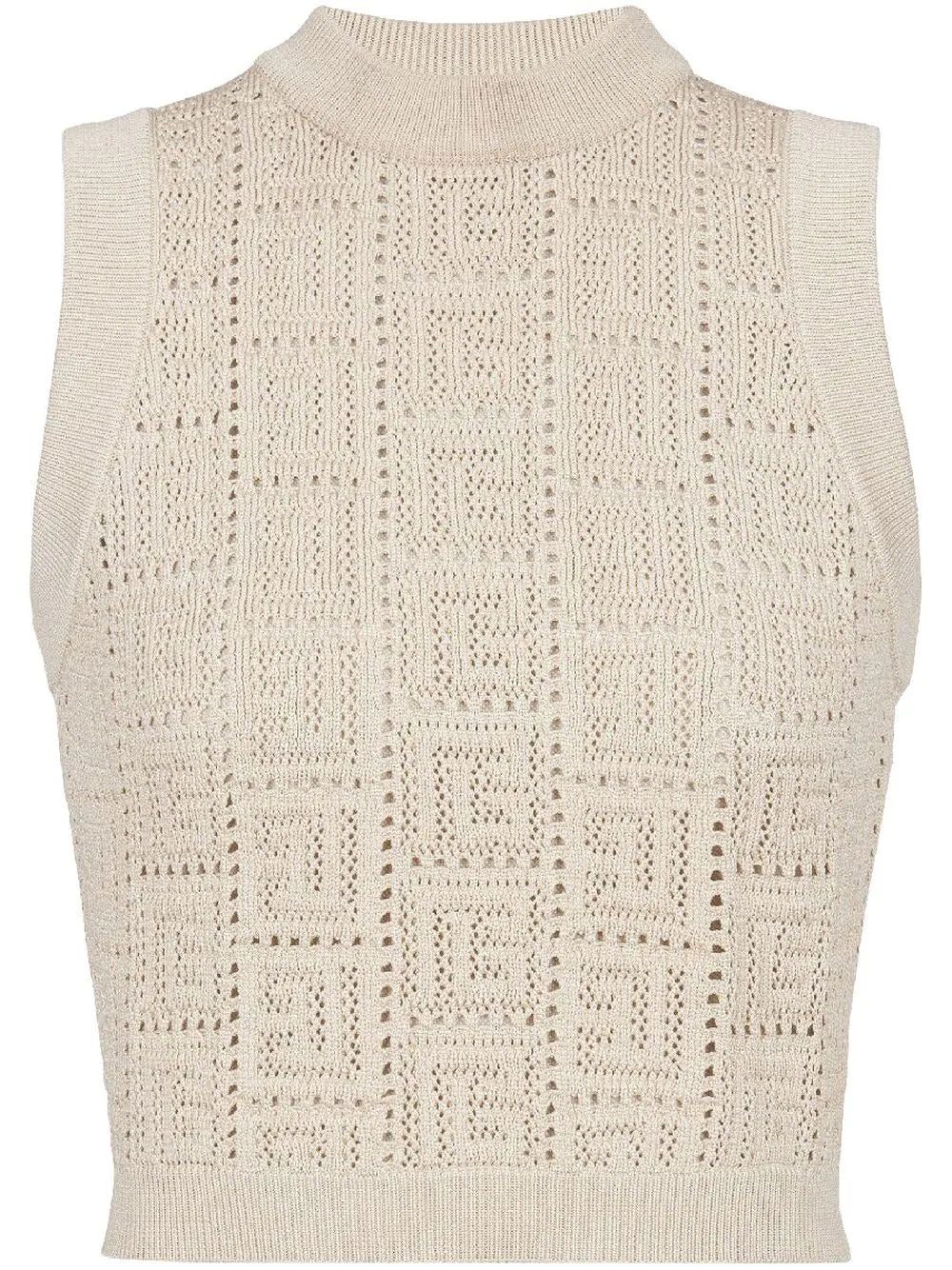Balmain takes a fresh approach to bold branding in this beige open-knit top. It's decorated throughout with a repeated monogram pattern that emphasises the confident mood.