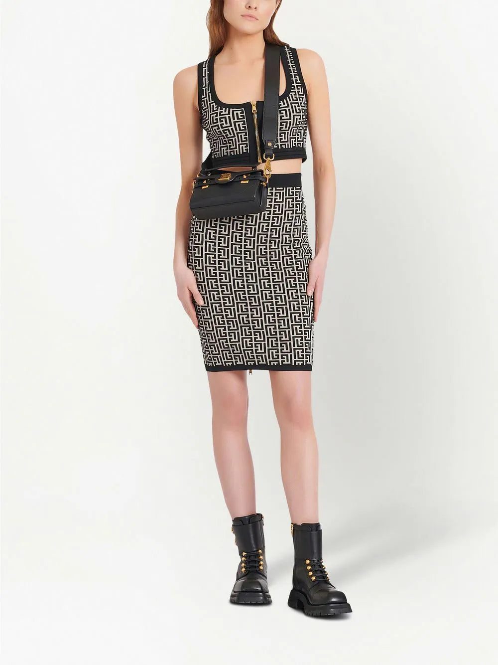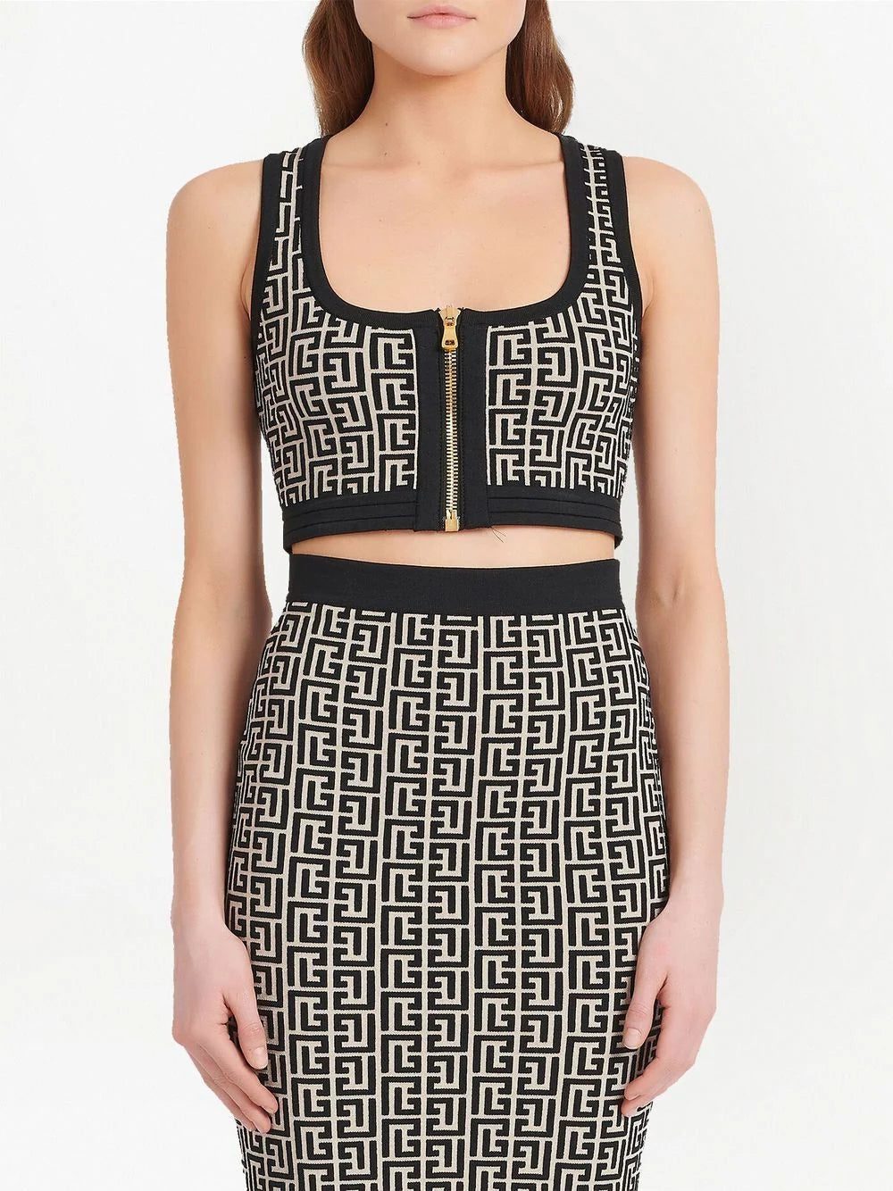 Black/white wool-blend monogram-pattern cropped top from Balmain featuring monogram pattern, contrasting trim, knitted construction, scoop neck, front zip fastening, sleeveless, straight hem and cropped.