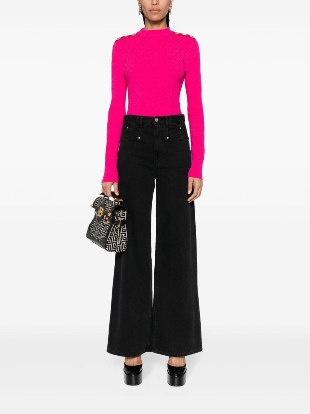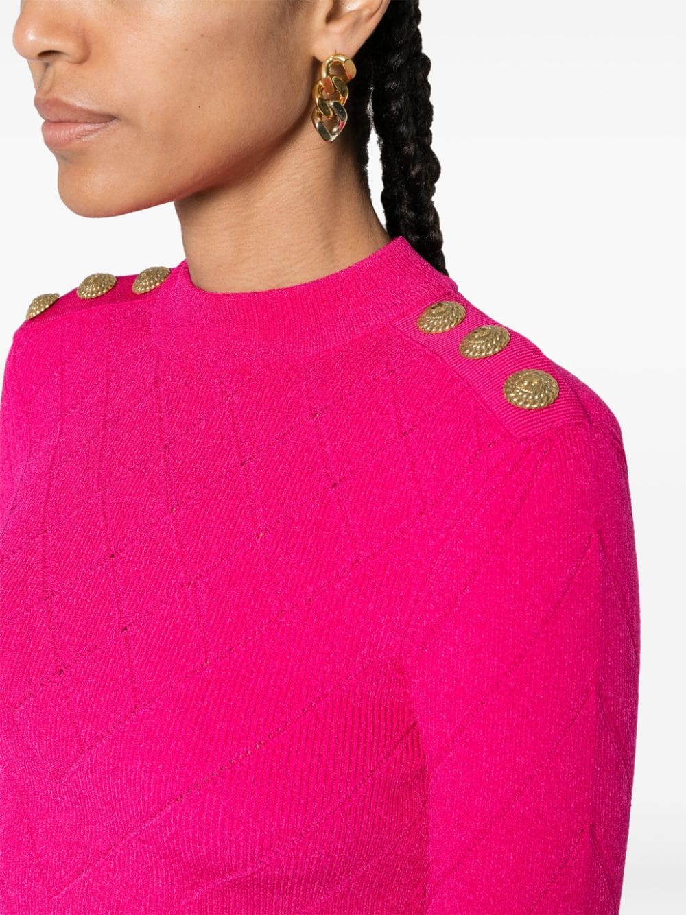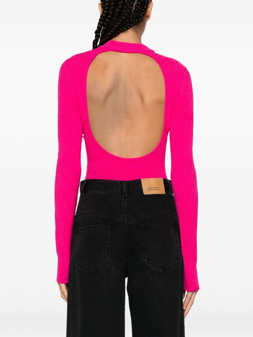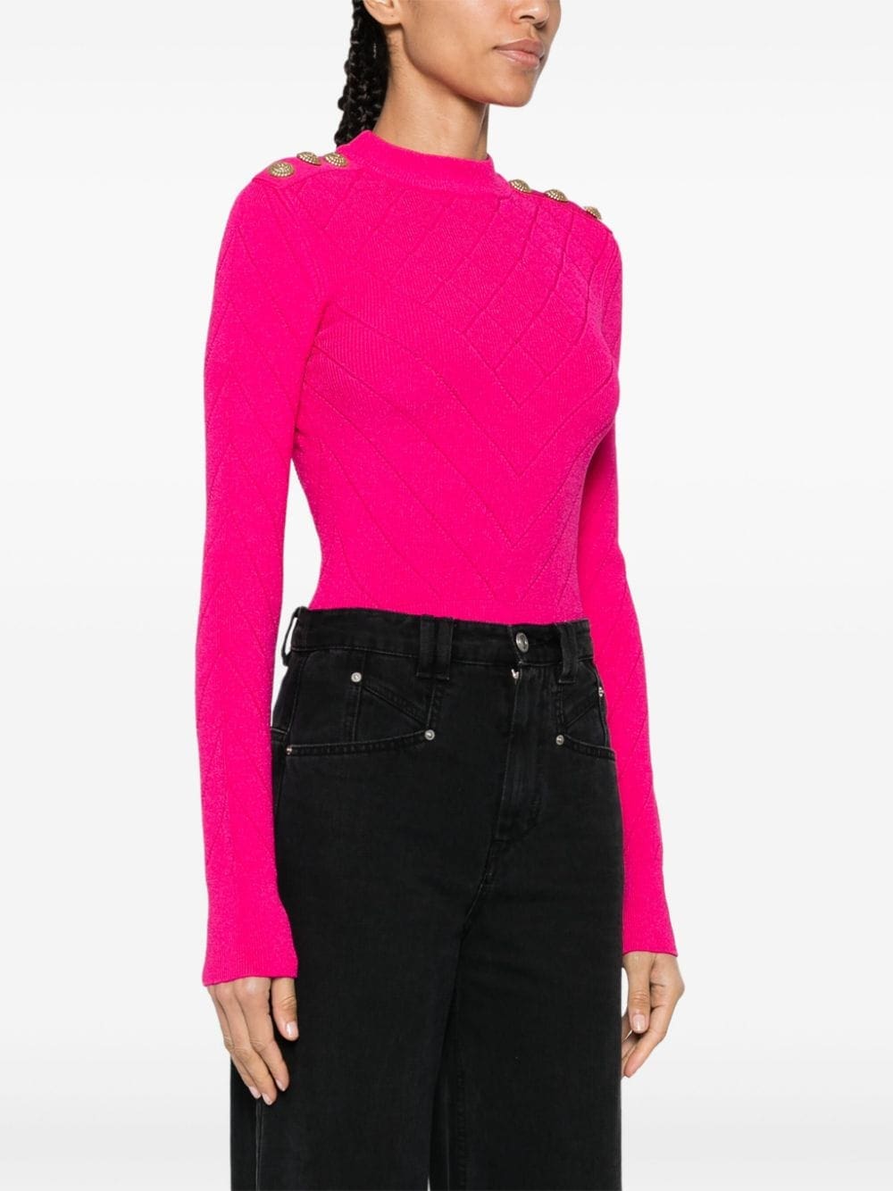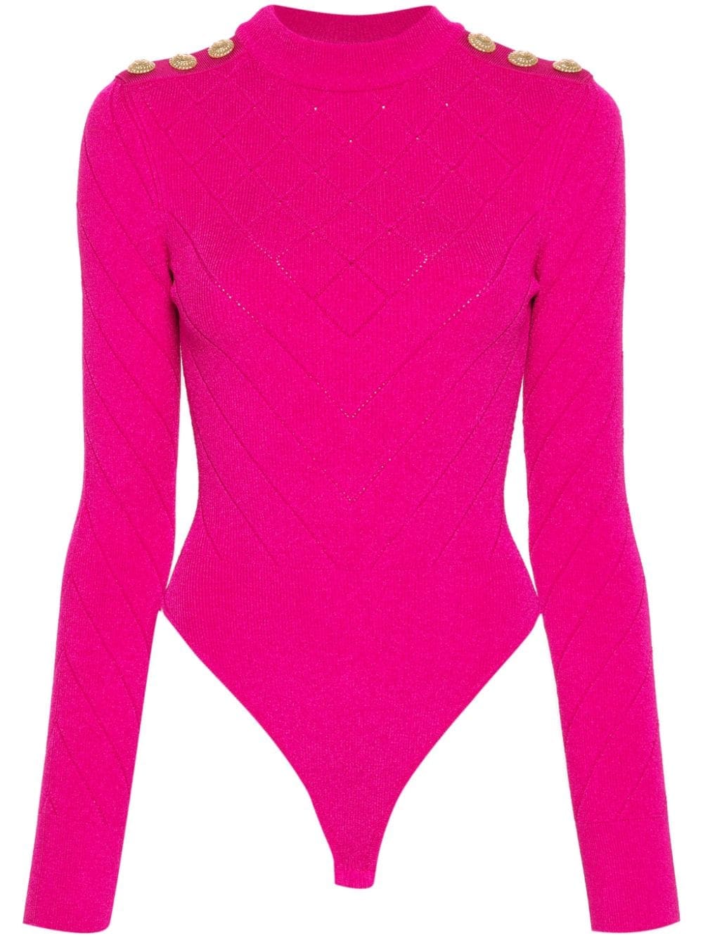 A statement combination of silhouette and embellishment, Balmain’s fuchsia bodysuit it ribbed-knit with metallic threads and a skin-baring open back then dotted with decorative gilded buttons along the shoulders. Diamond and chevron pointelle trims add considered detail.