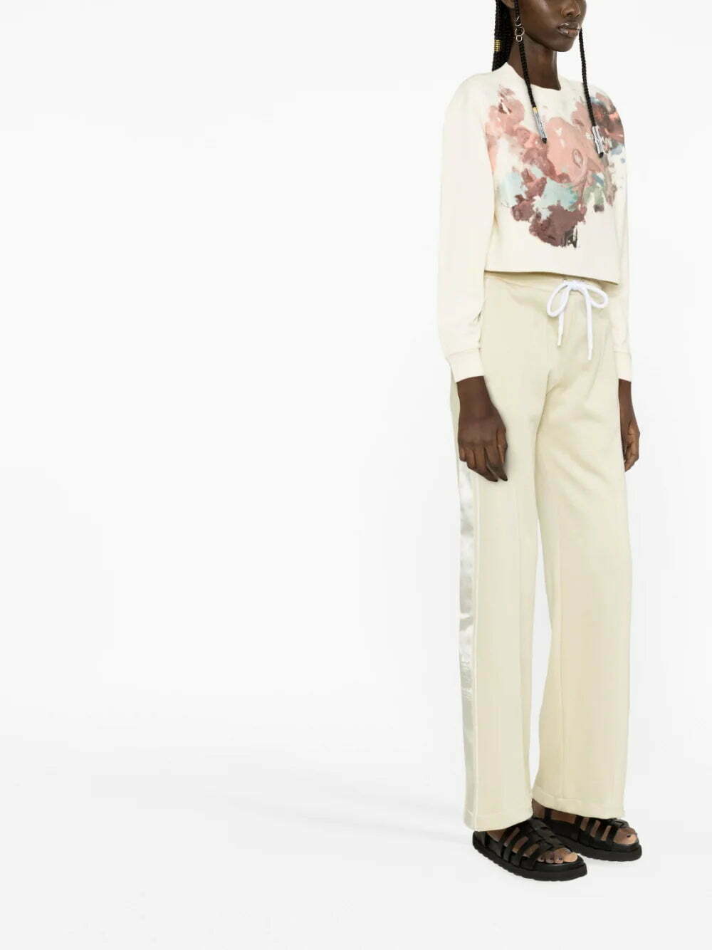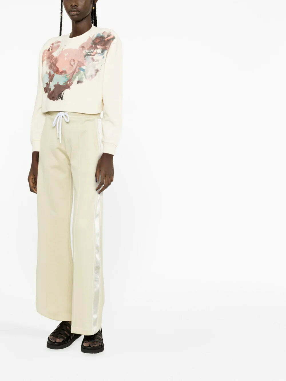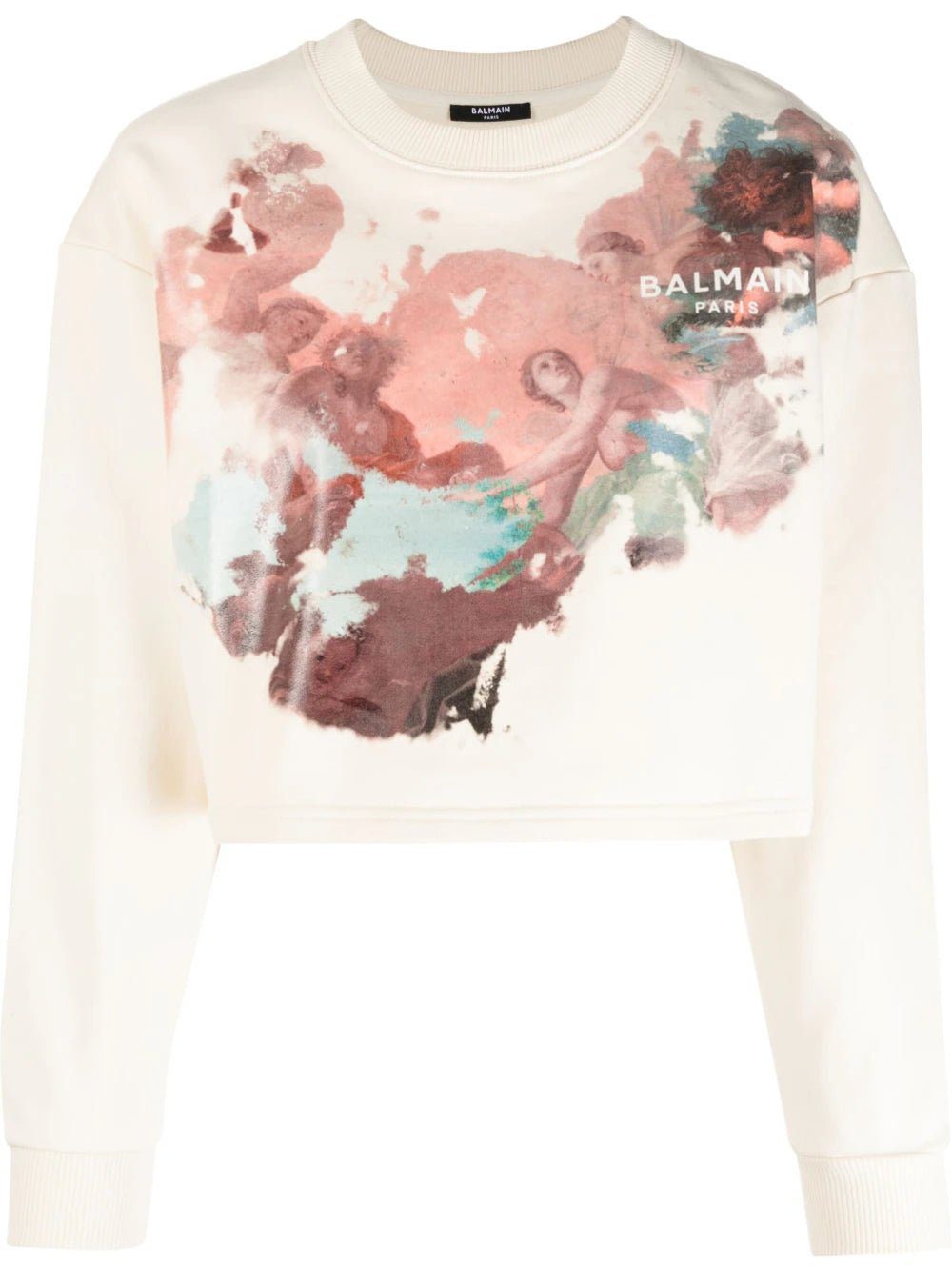 Renaissance-inspired artwork is juxtaposed with sporty streetwear separates throughout Balmain’s SS23 collection. This cropped sweatshirt is adorned with a watercolour-inspired Pastel print.