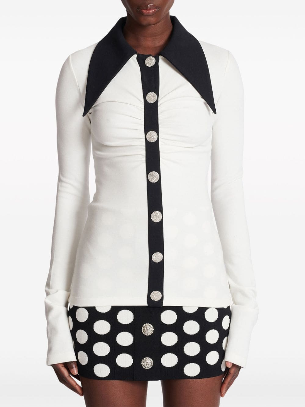 Balmain’s affinity for precise tailoring is showcased with this shirt. Presented in a black and white colourway, it’s detailed with rhinestone-embellished buttons and defined by its oversized pointed collar.
