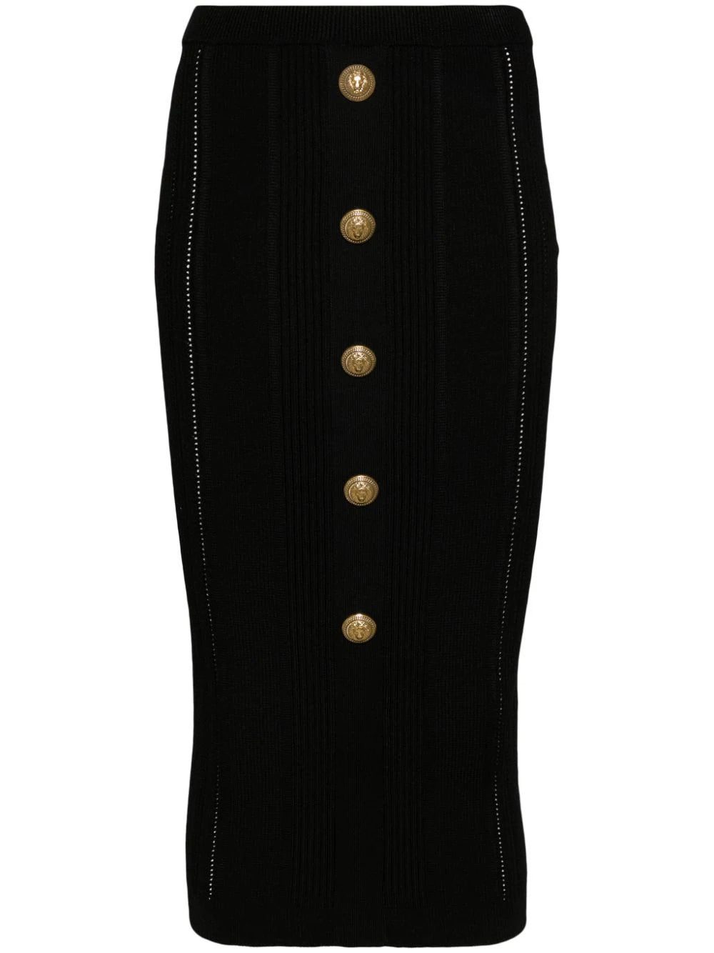 Adorned with gold-tone buttons for a quintessential Balmain flair, this black midi skirt is spun in Italy to a classic pencil silhouette. It sits high at the waist with an elasticated band and is fitted with perforated detailing at the sides.