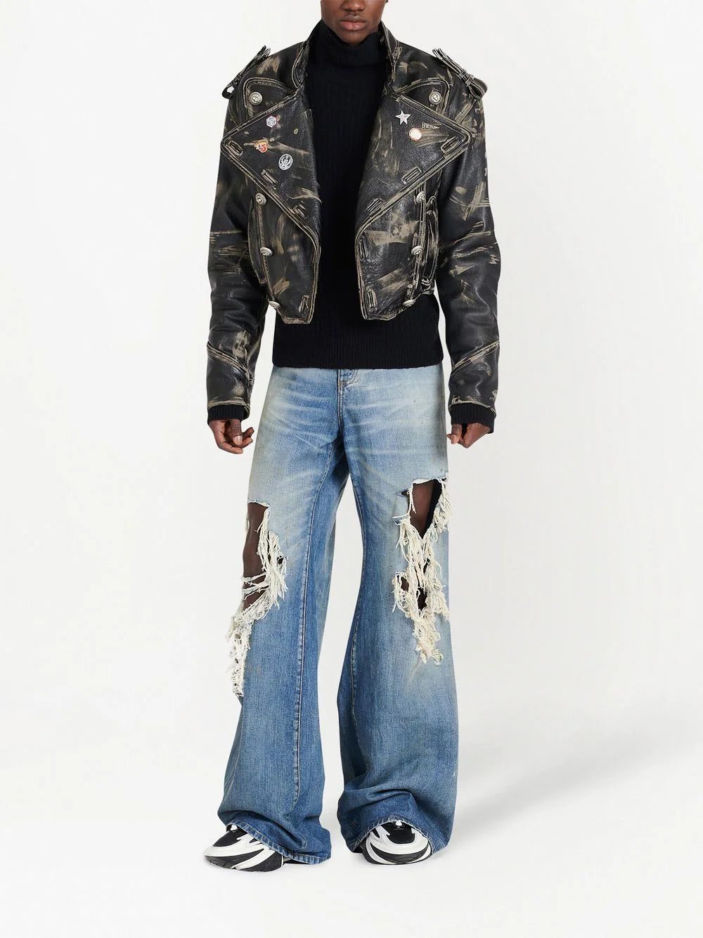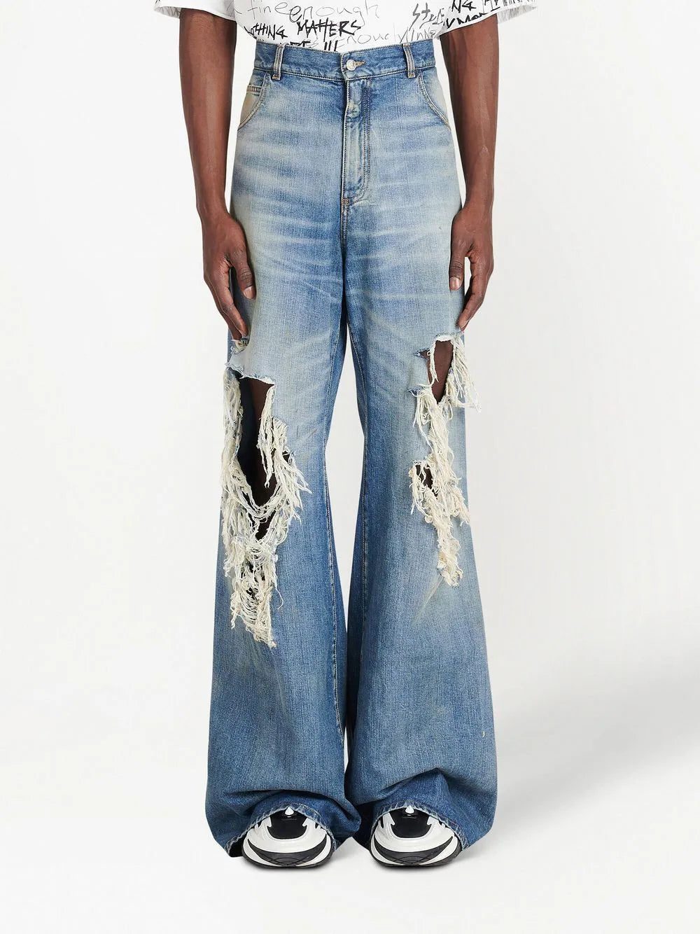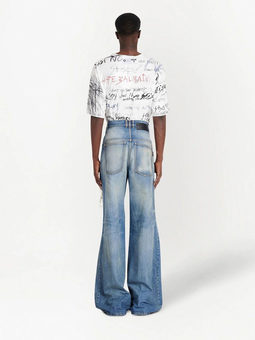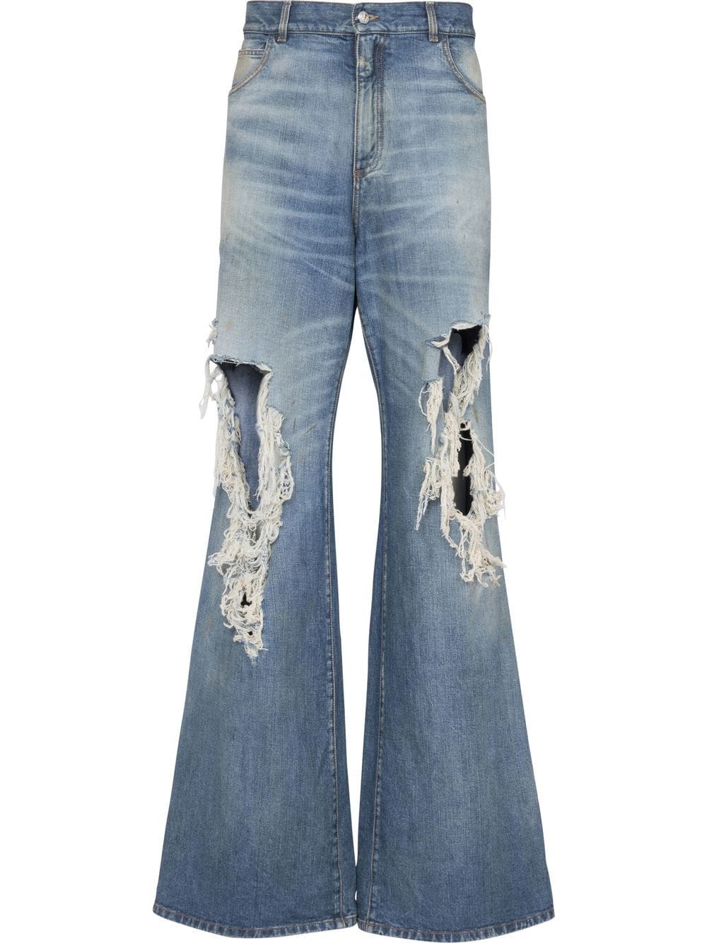 Blue cotton ripped faded flared bootcut jeans from Balmain featuring mid-rise, button fly fastening, classic five pockets, faded effect and logo patch to the rear.