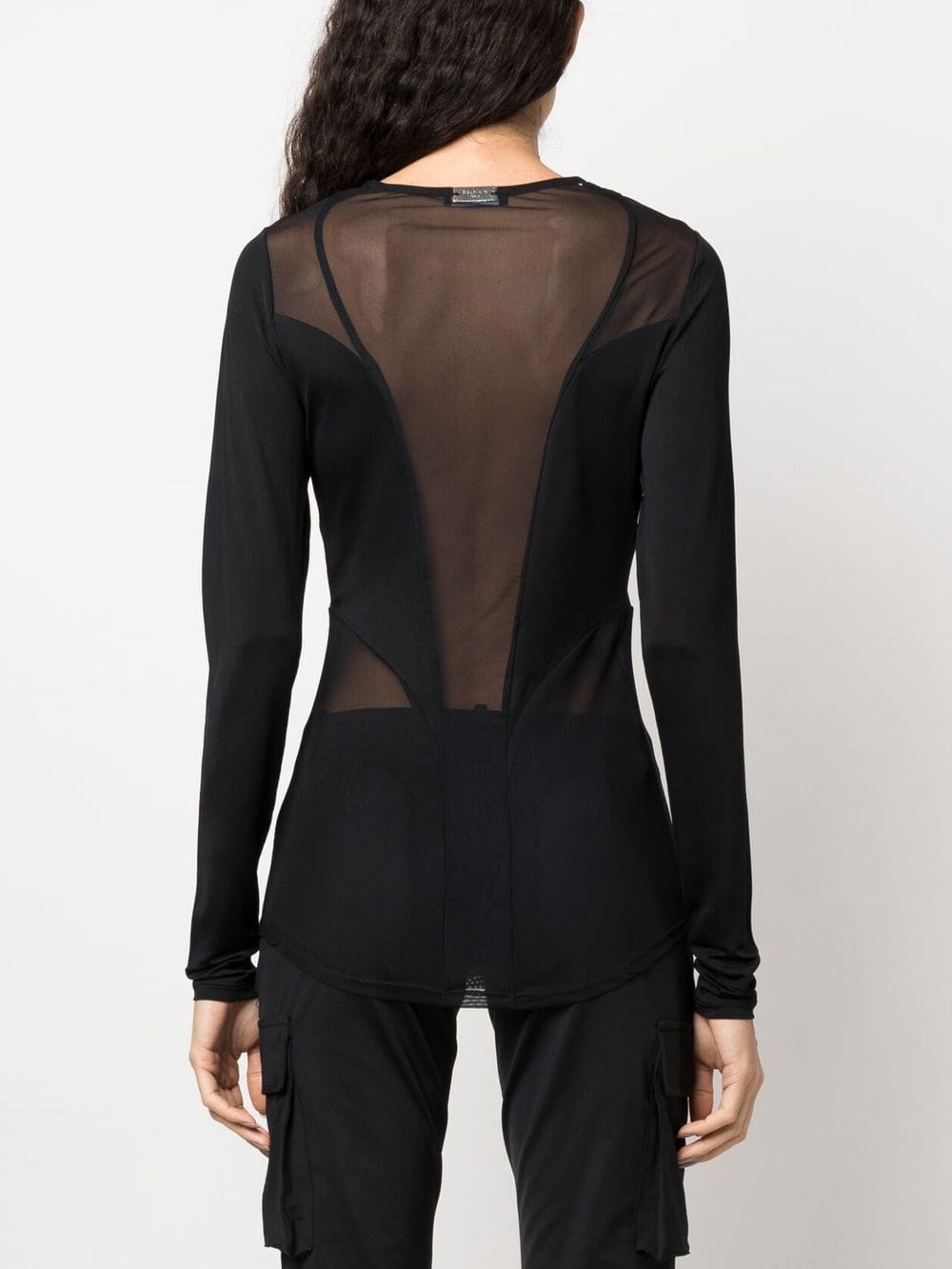Balmain is known for its avant-garde approach to design. This long-sleeved top is cut from semi-sheer fabric and detailed with strategically placed opaque panels that create a sculptural look.