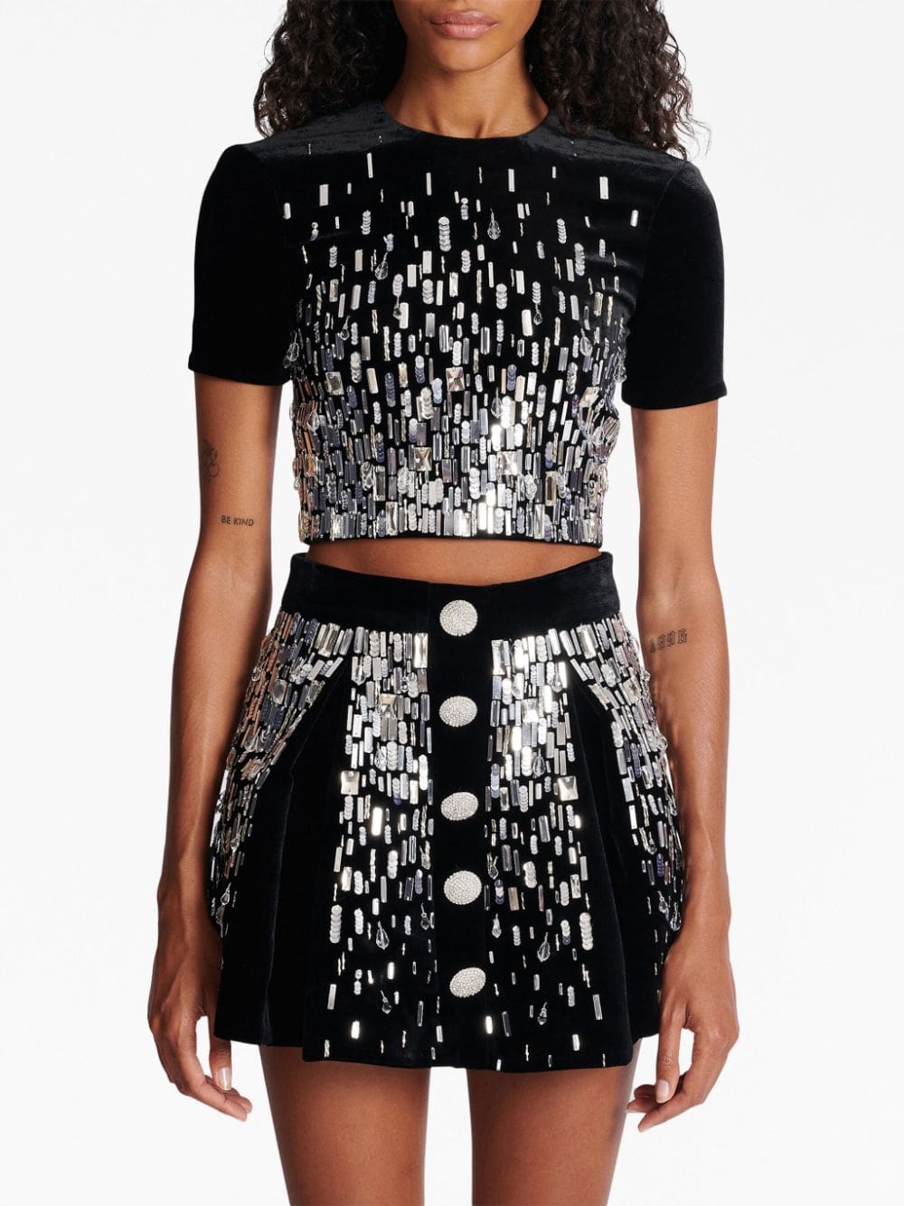 Balmain designs this cropped top to catch the light, achieved through the glimmering sequin embellishments that scatter from the hem upwards.