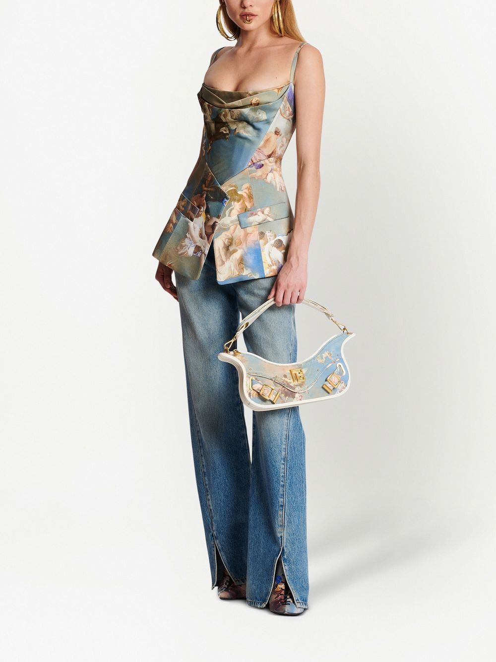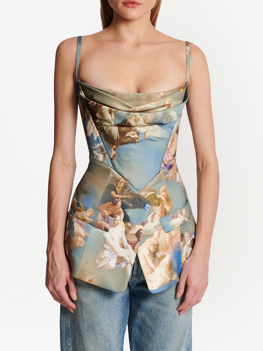 Strong, sculptural silhouettes, soft hues and Renaissance-inspired motifs take centre stage at Balmain for SS23. Boasting a draped, corset construction, this blue top is decorated throughout with printed artwork that recalls beloved styles of eras gone by.