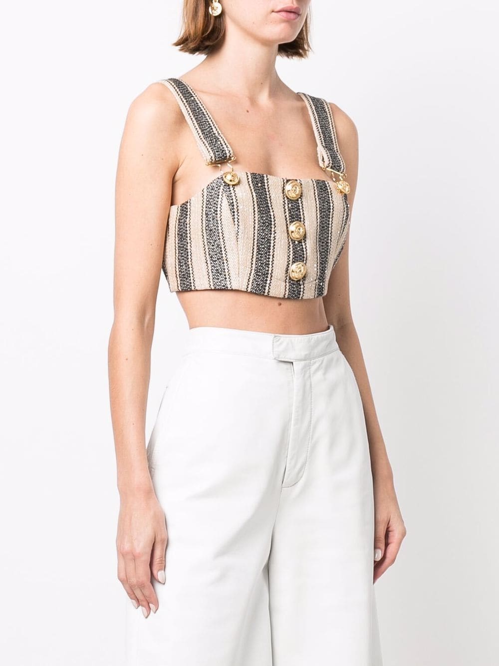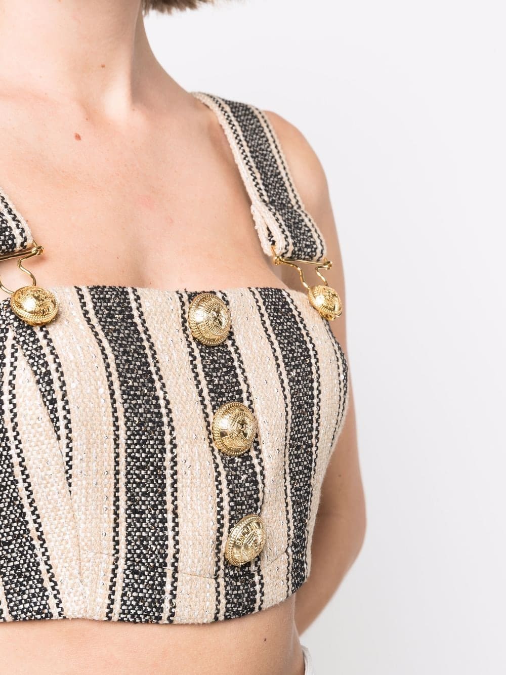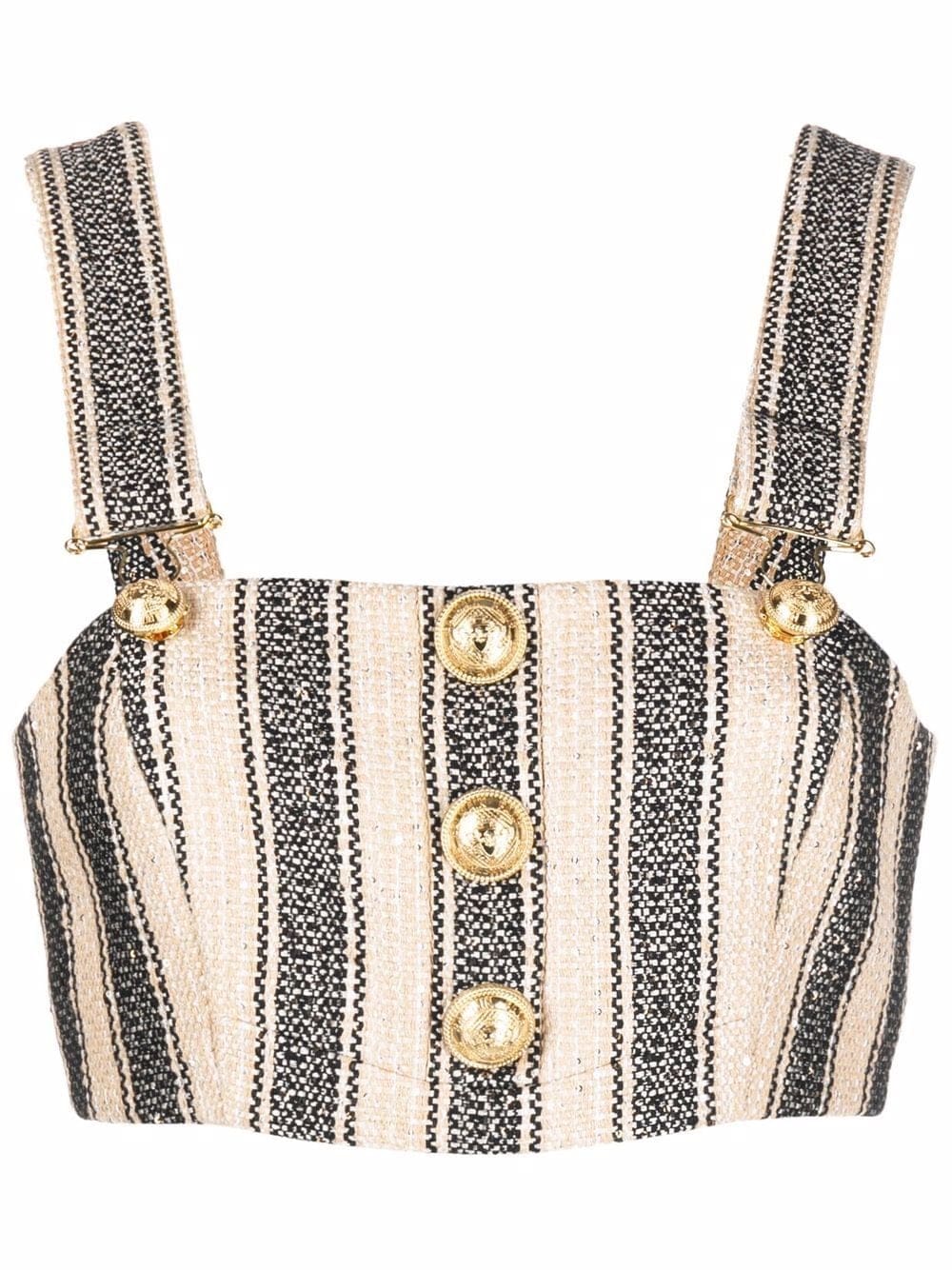 beige/black embossed gold-tone buttons vertical stripe pattern square neck square open back button-fastening straps cropped