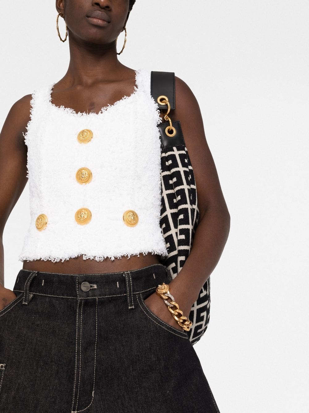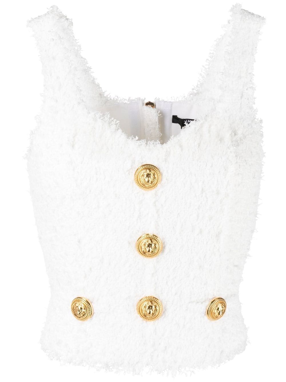 Defined by its softly textured tweed fabrication, this Balmain top is punctuated with signature gold-tone logo-embossed buttons, exhibiting the military influence that continues to characterise the brand's narrative.