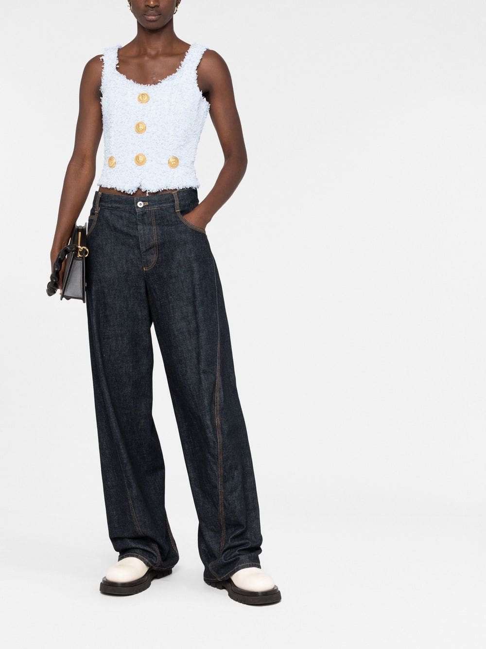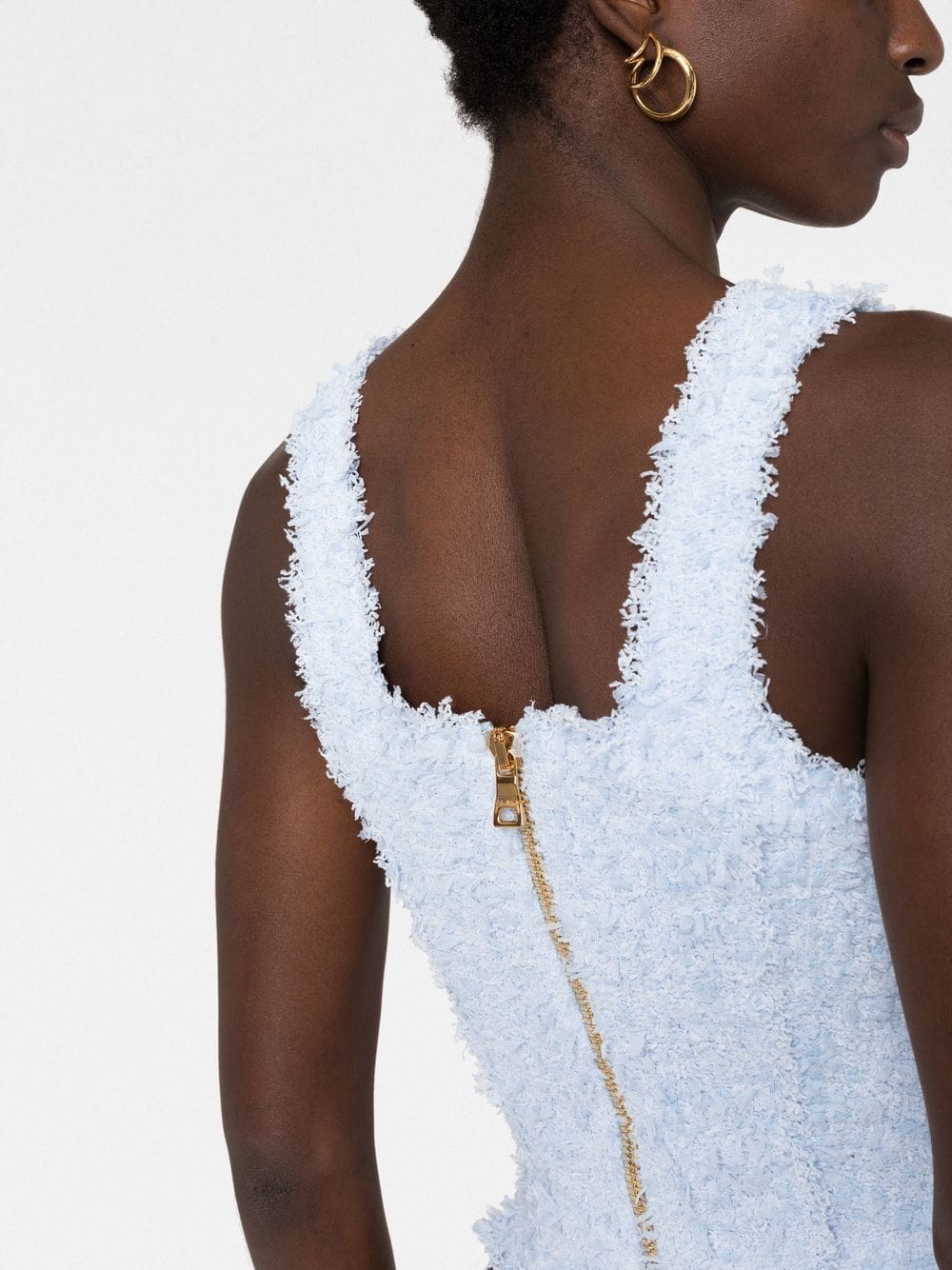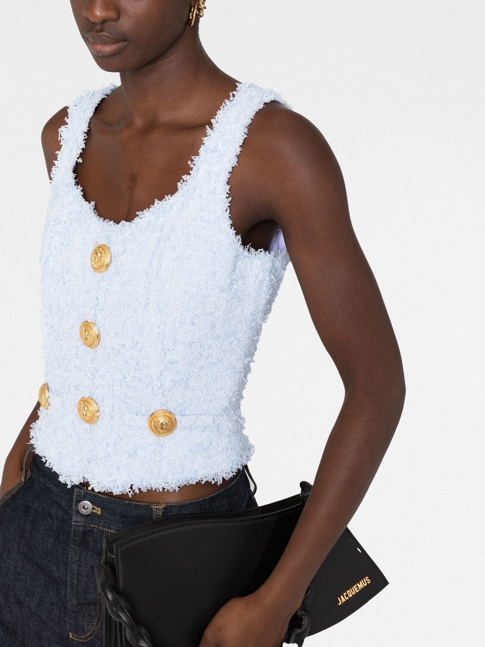 Balmain creates designs with a bold sense of elegance. This is showcased on the decorative button detailing across the front of this sleeveless tweed top, which stands out even more on the garment's tonal colourway.