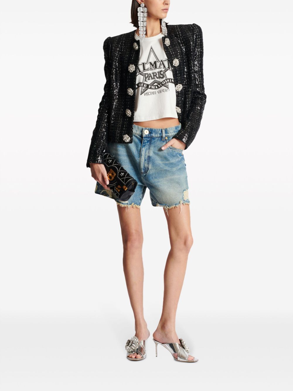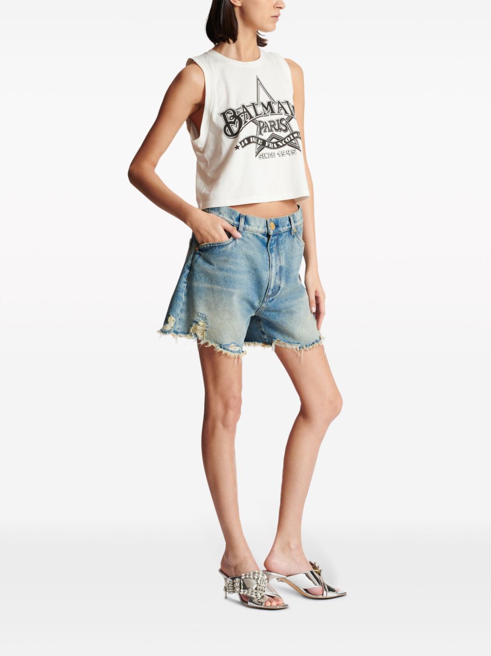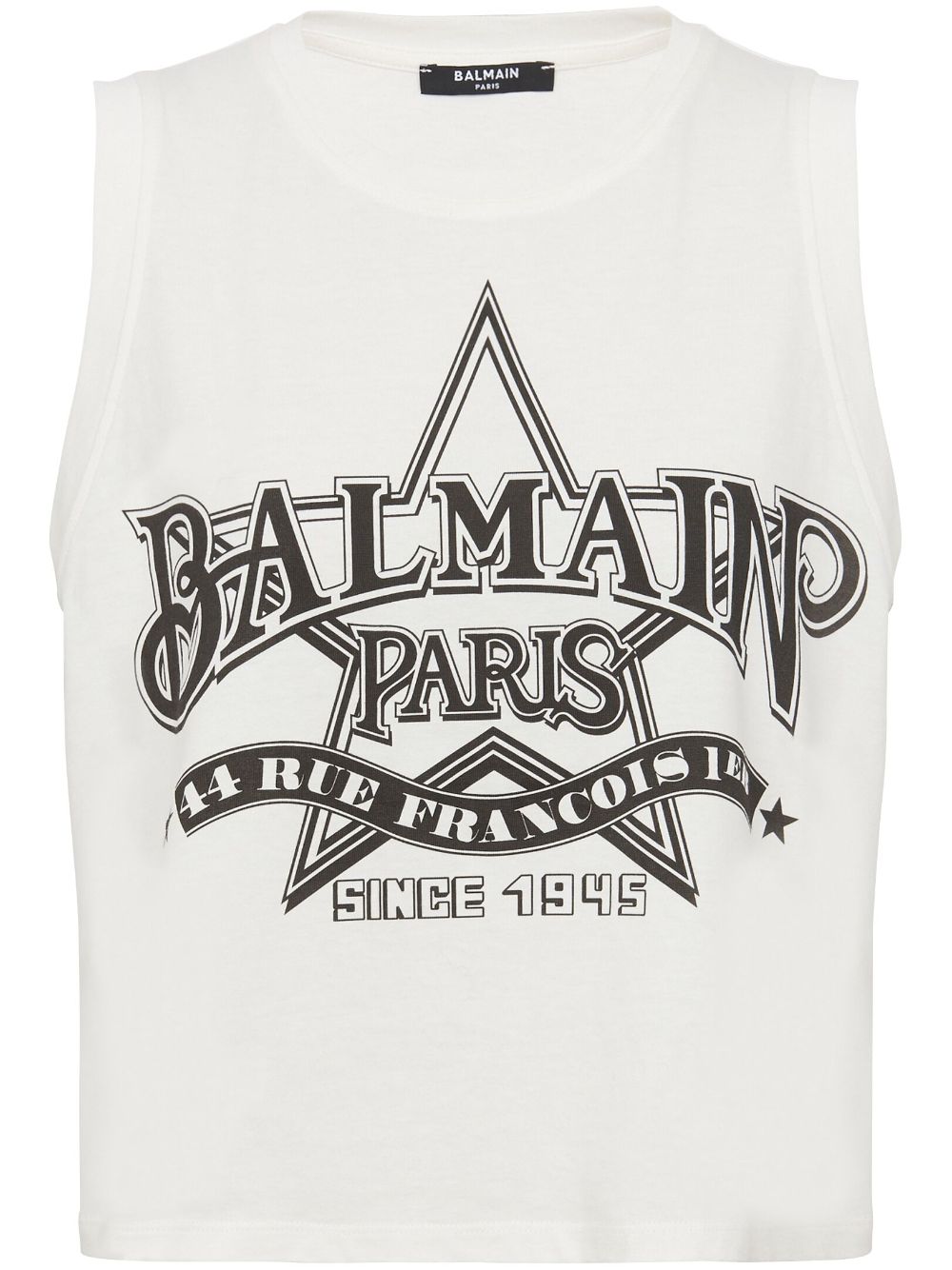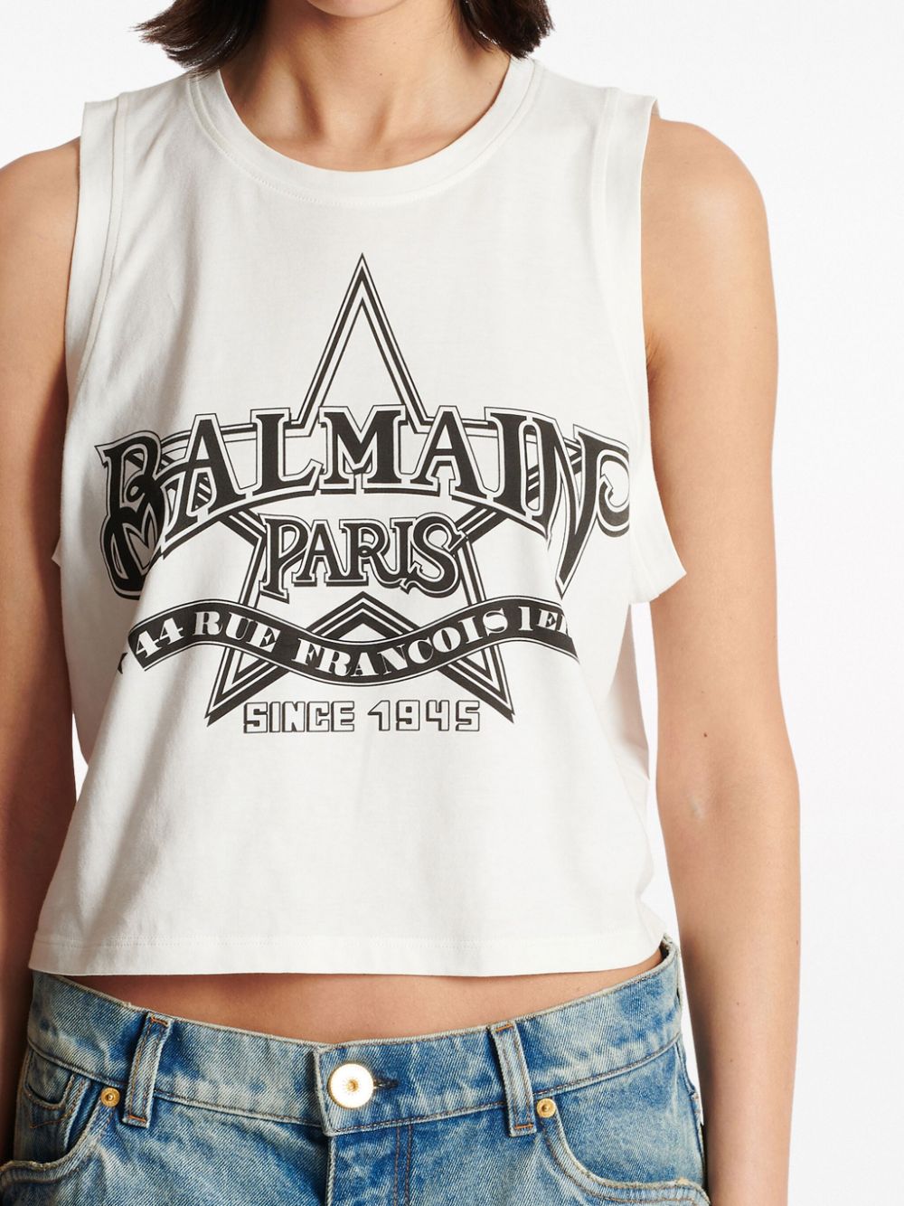 Balmain's Parisian roots are celebrated in this cropped tank top. The maison's founding date and first-ever address are stamped on the front of the design, along with a Western-inspired version of the brand's logo.