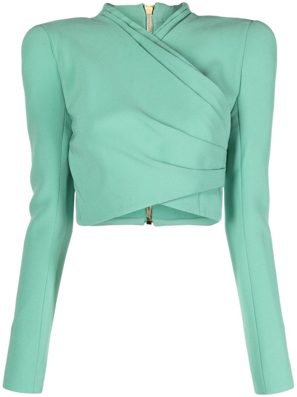 Balmain channels a bold yet refined aesthetic with this top. The piece arrives in a striking mint-green hue and boasts a wrap design while the cropped silhouette lends a distinctly modern feel.