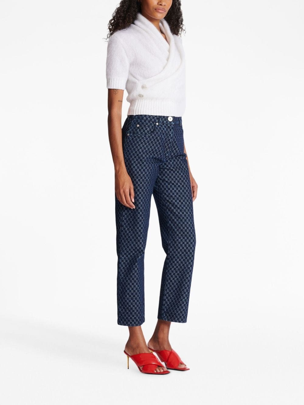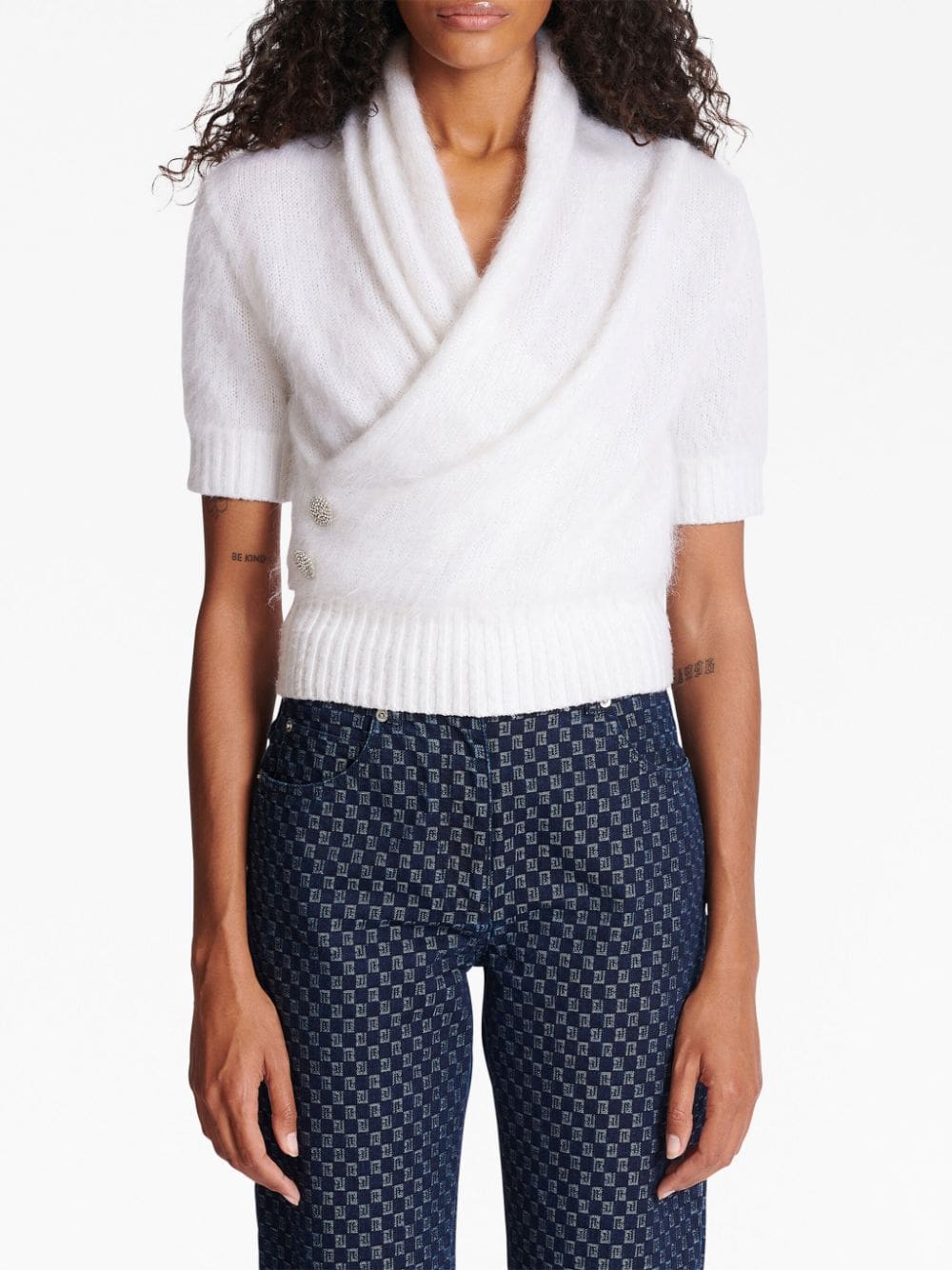 This wrap-style jumper from Balmain boasts a fluffy white knit construction and is made instantly recognisable by the brand's familiar silver-tone embossed button detailing to the side.
