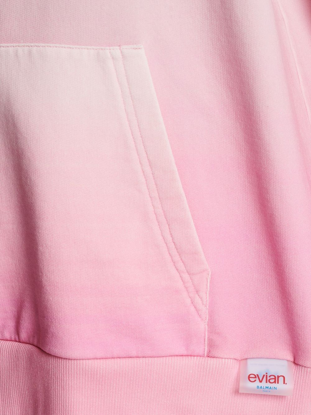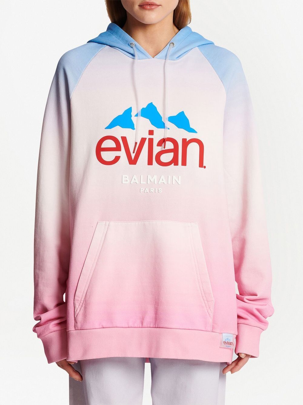 Infused with soft pastel pink, baby blue and lilac purple hues in a gradient effect, this oversized hoodie is a lively addition to Balmain's SS23 collection. Partnered with Evian, the cotton construction boasts a logo print to the front for a branding-focused finish.