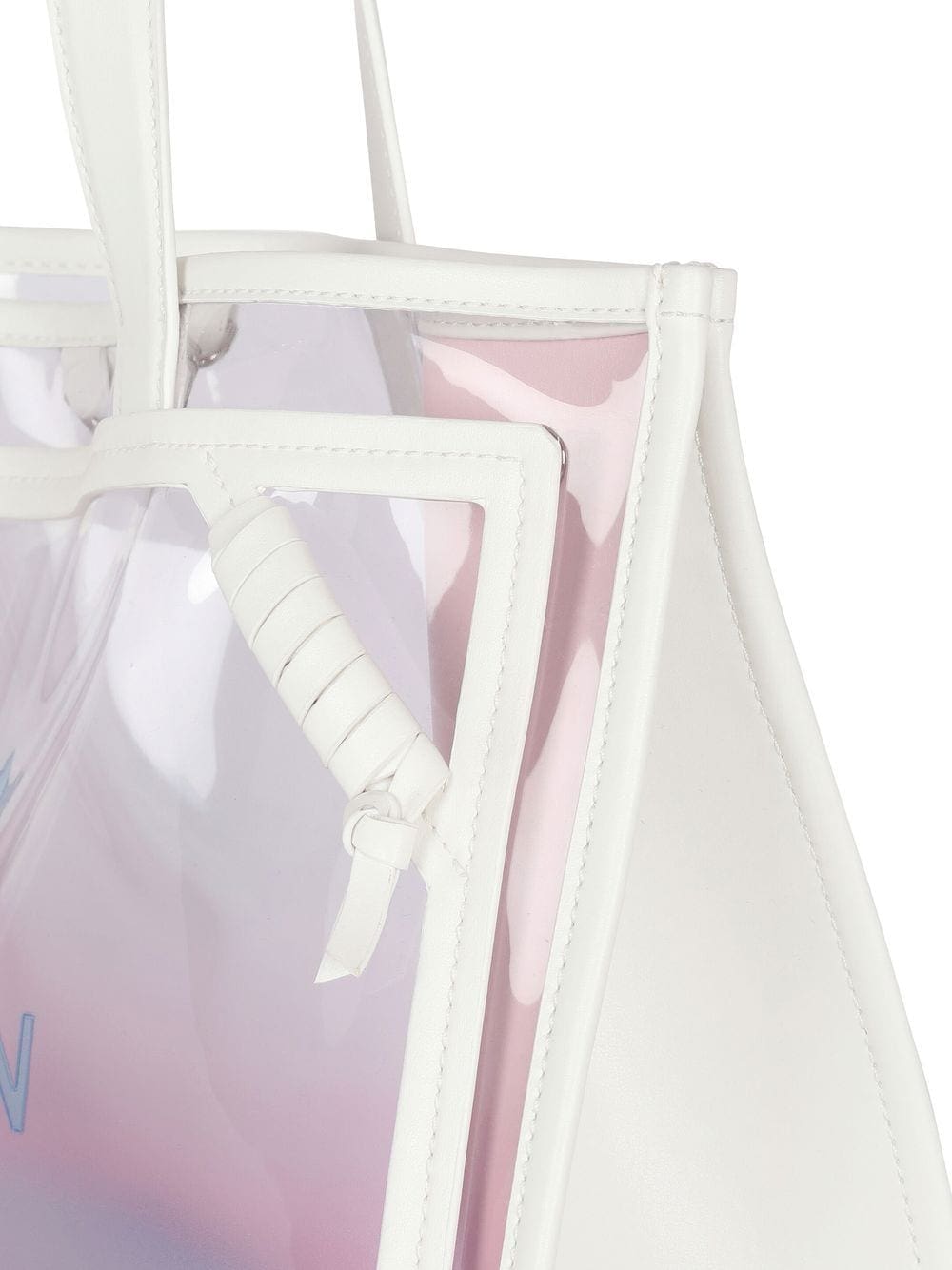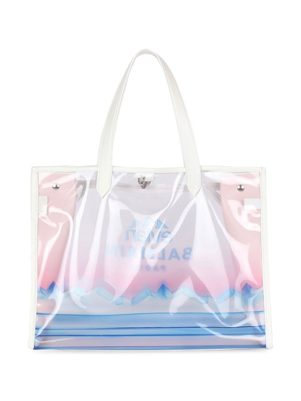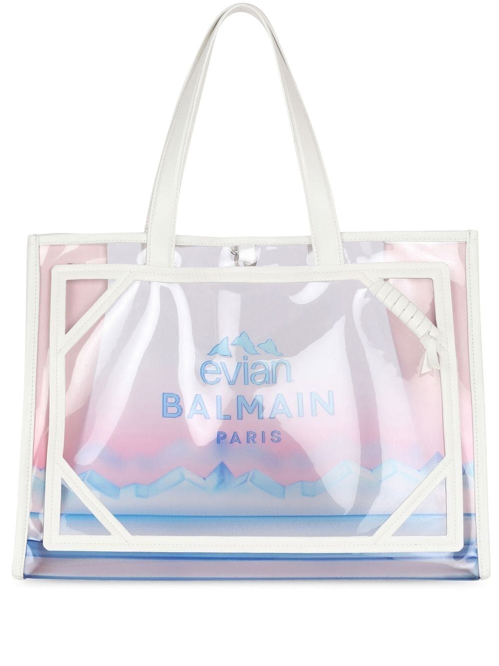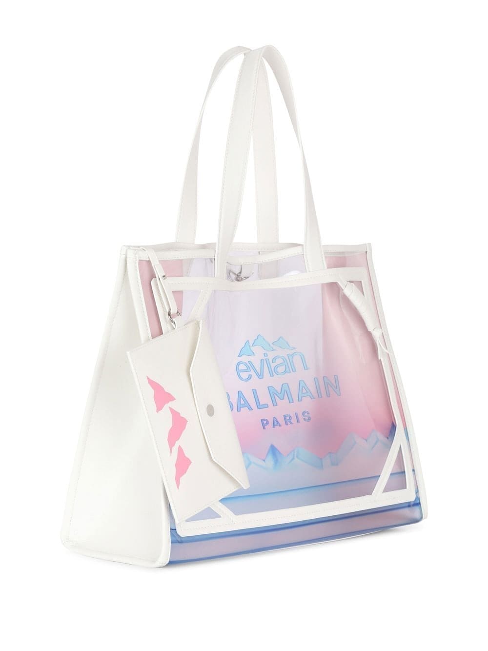 The latest addition to Balmain's B-Army range arrives in the shape of this white shopper bag decorated with gradient-effect logo prints throughout. Partnered with Evian, this transparent piece is suspended from two long top handles.