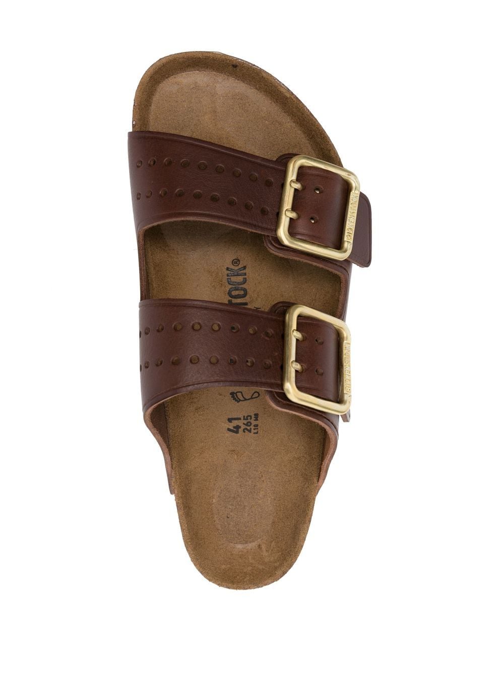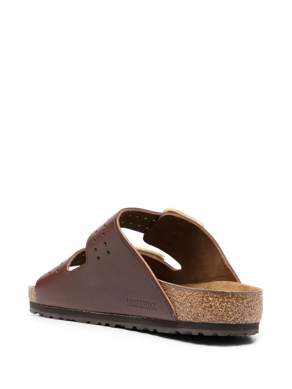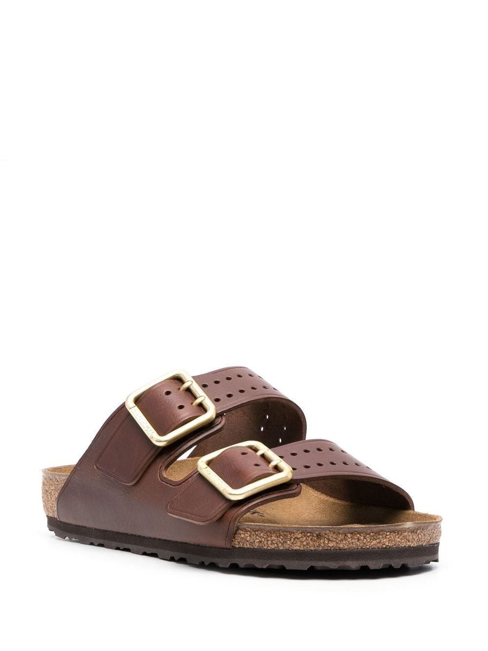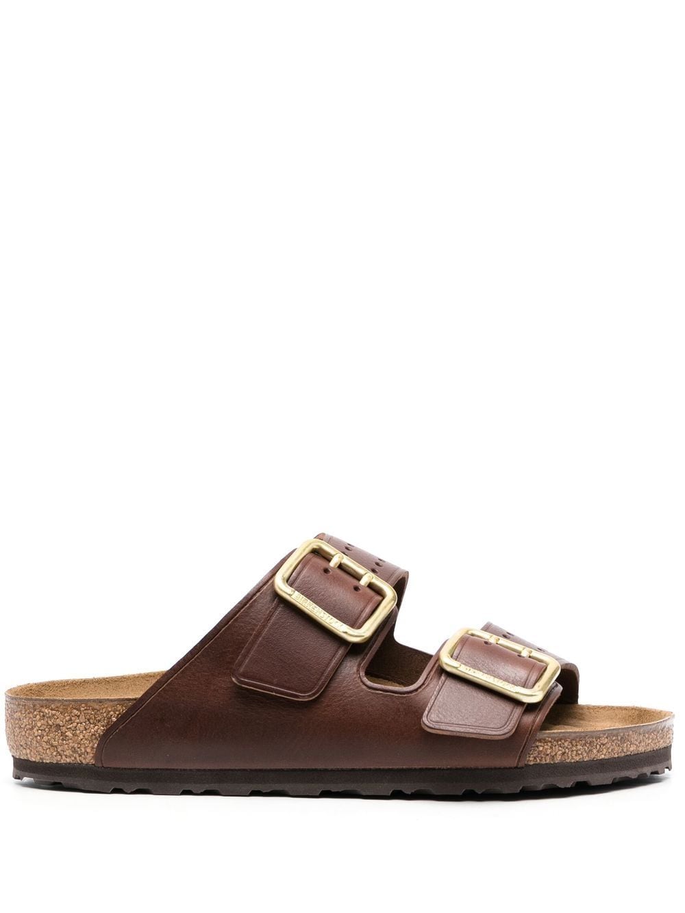 auburn brown calf leather double buckle fastening open toe branded insole flat rubber sole