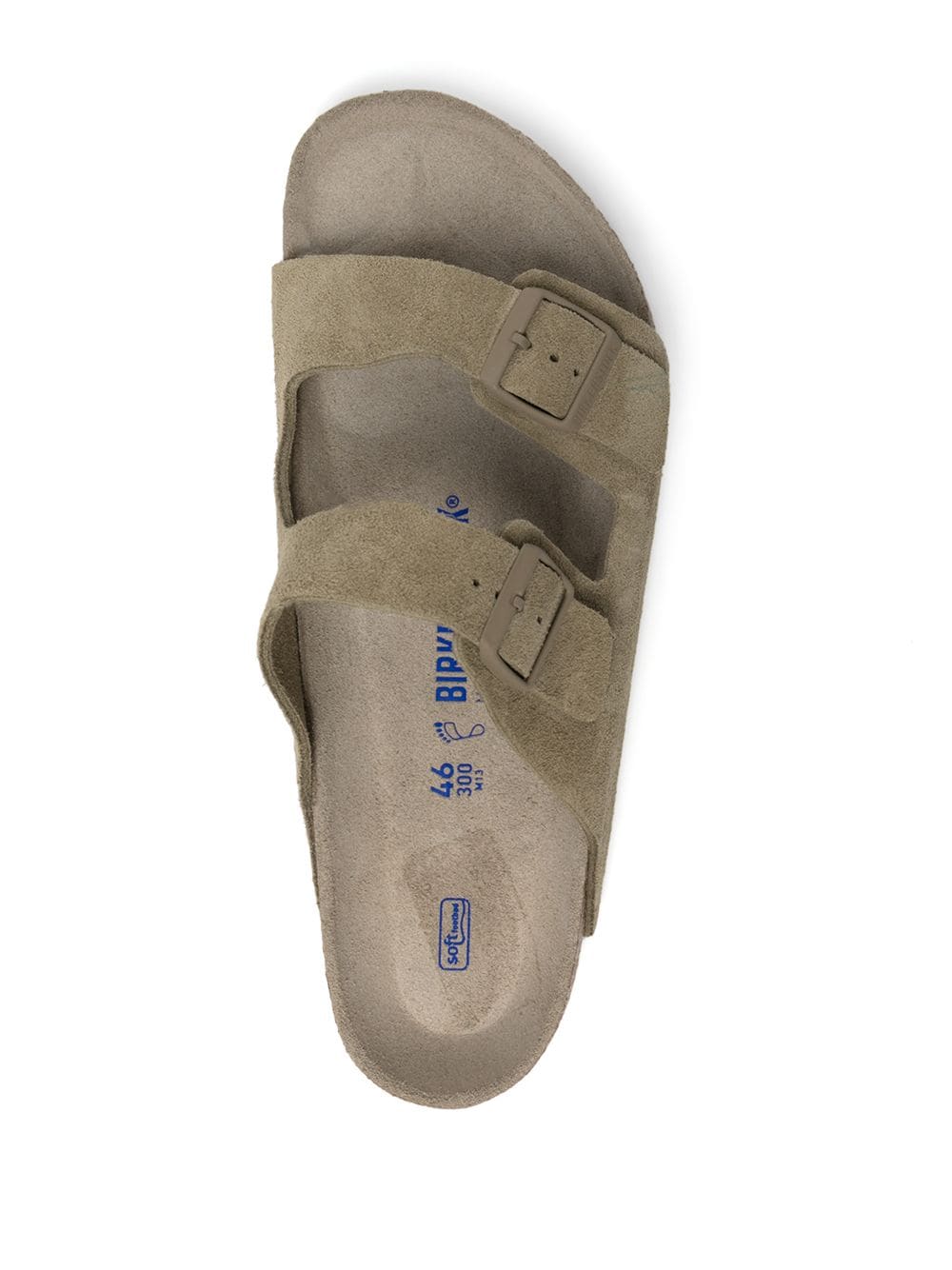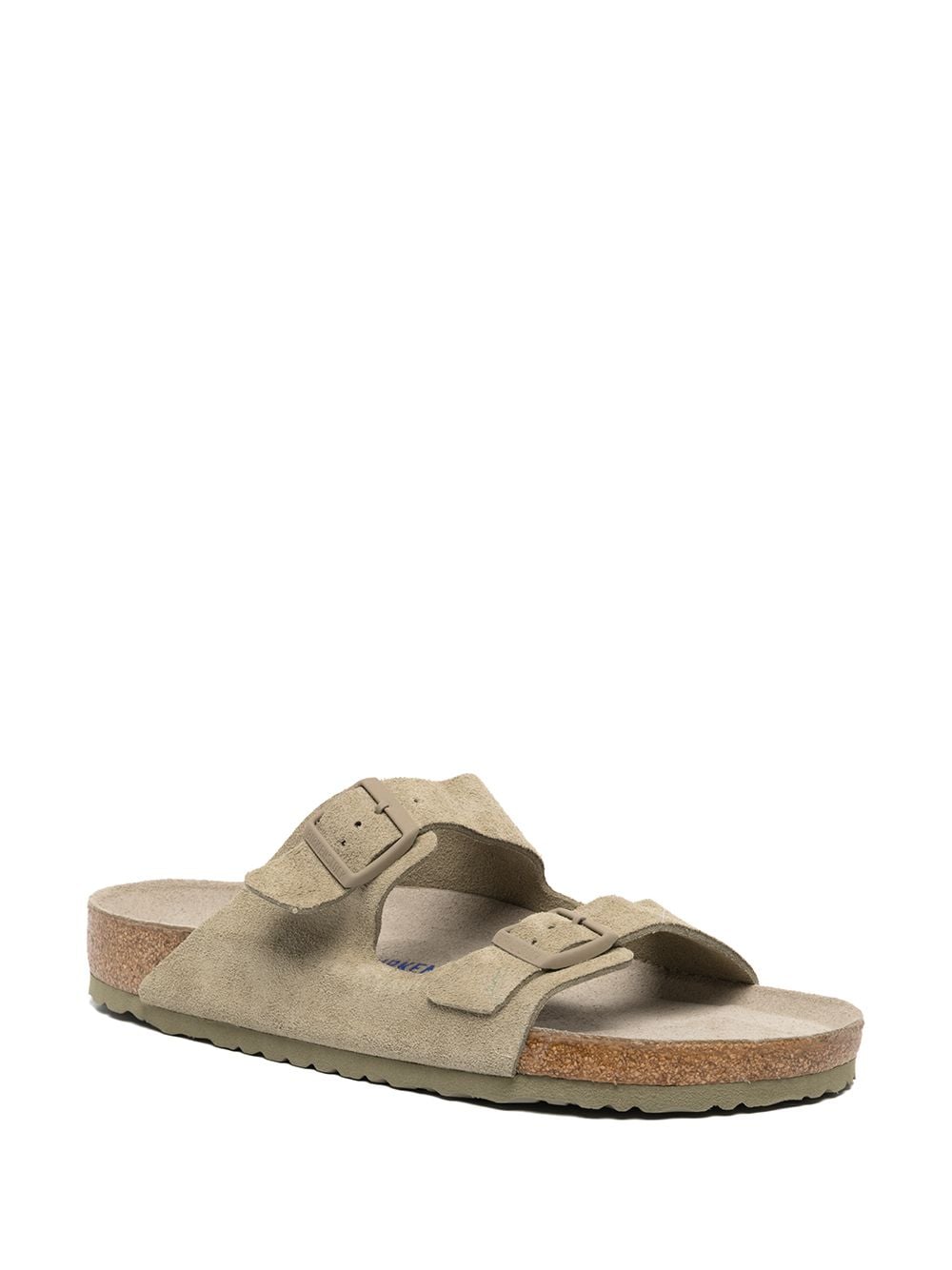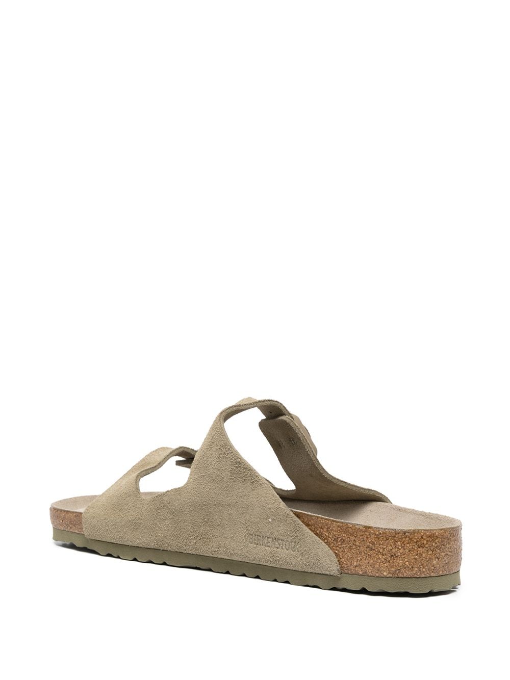 faded khaki suede slub texture cork double buckle fastening engraved logo open toe moulded footbed slip-on style ridged rubber sole