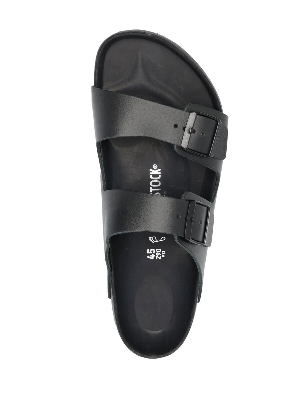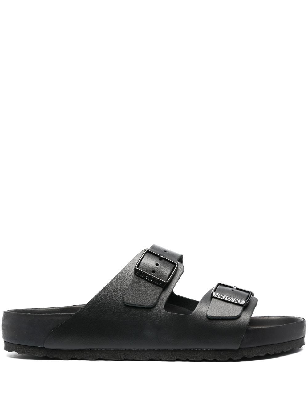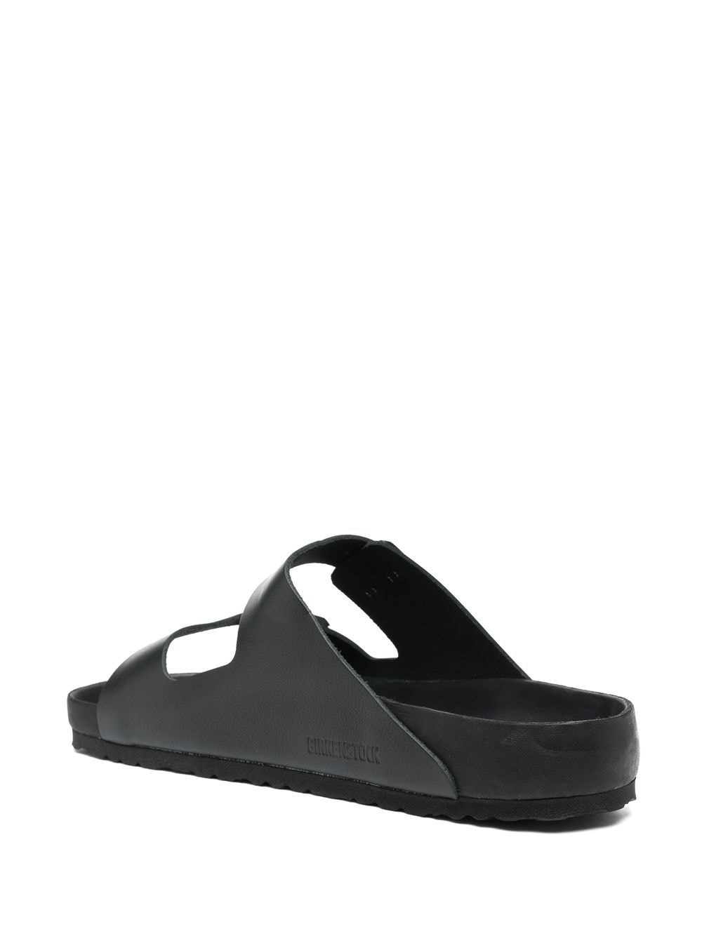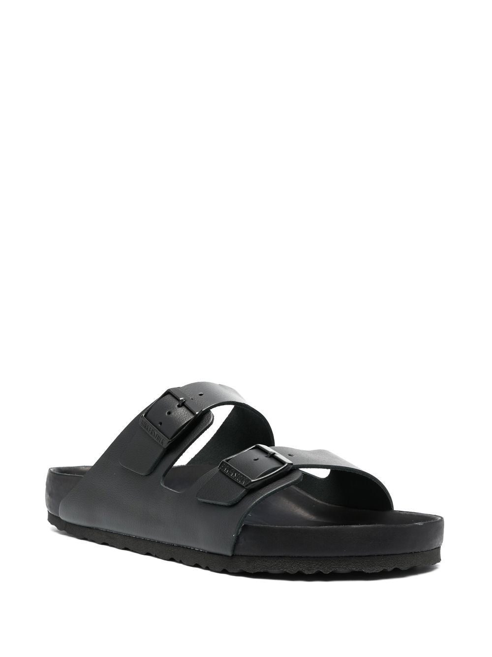 black calf leather tonal design buckle fastening slip-on style open toe moulded footbed flat rubber sole