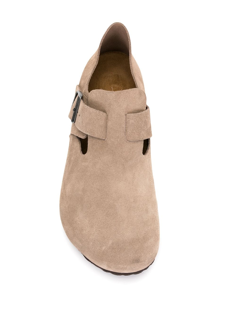 taupe calf leather round toe buckle fastening cut-out detailing flat rubber sole