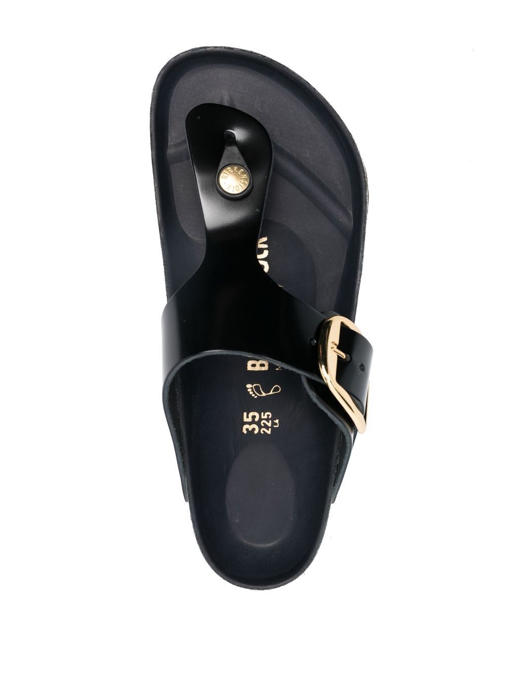 black calf leather patent finish decorative buckle detail open toe moulded footbed EVA midsole rubber outsole