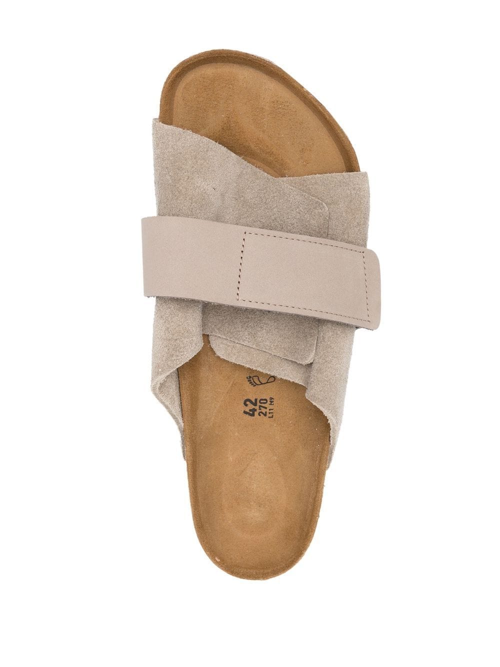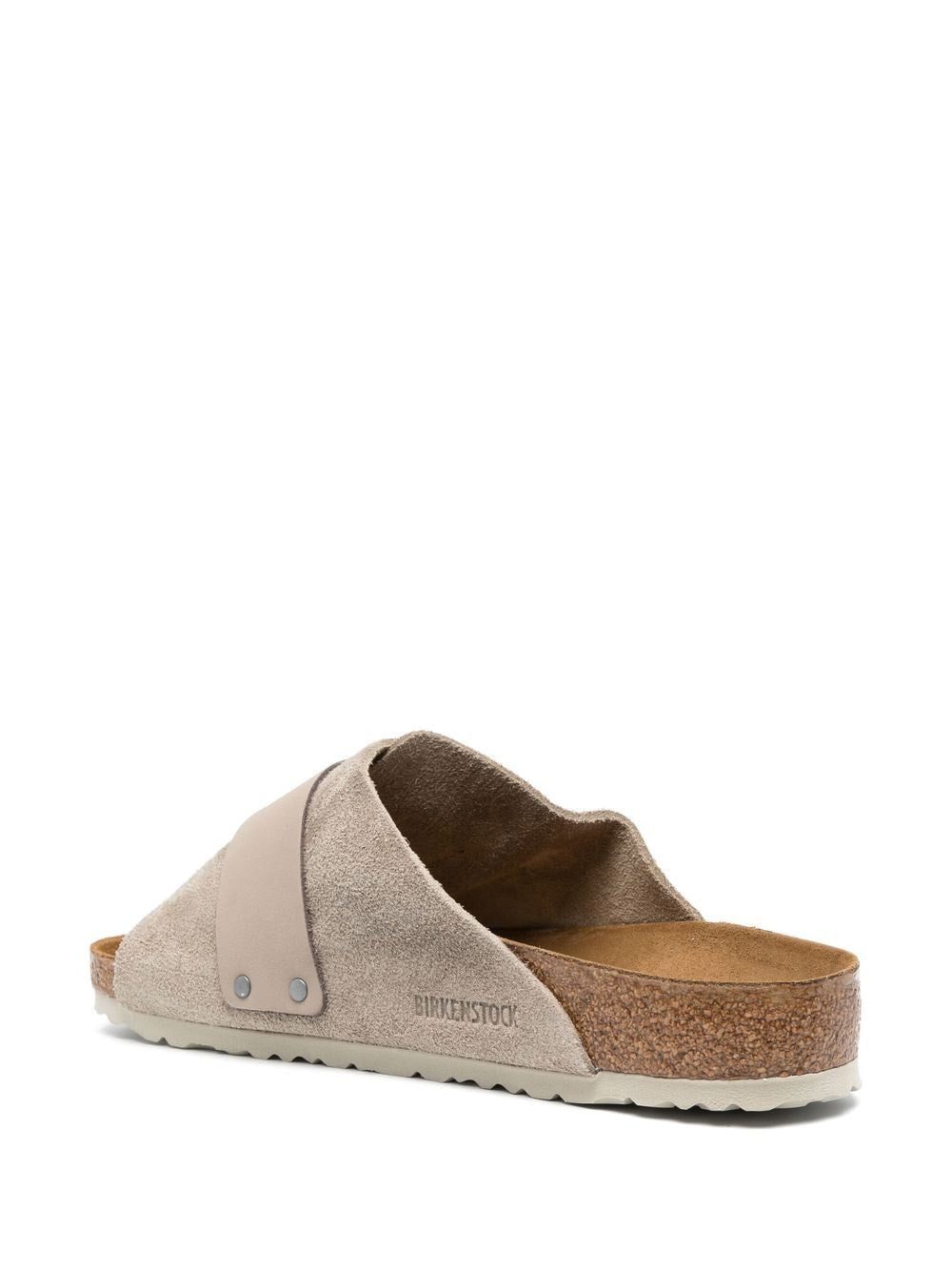 taupe calf leather front touch-strap fastening slip-on style open toe moulded footbed flat rubber sole