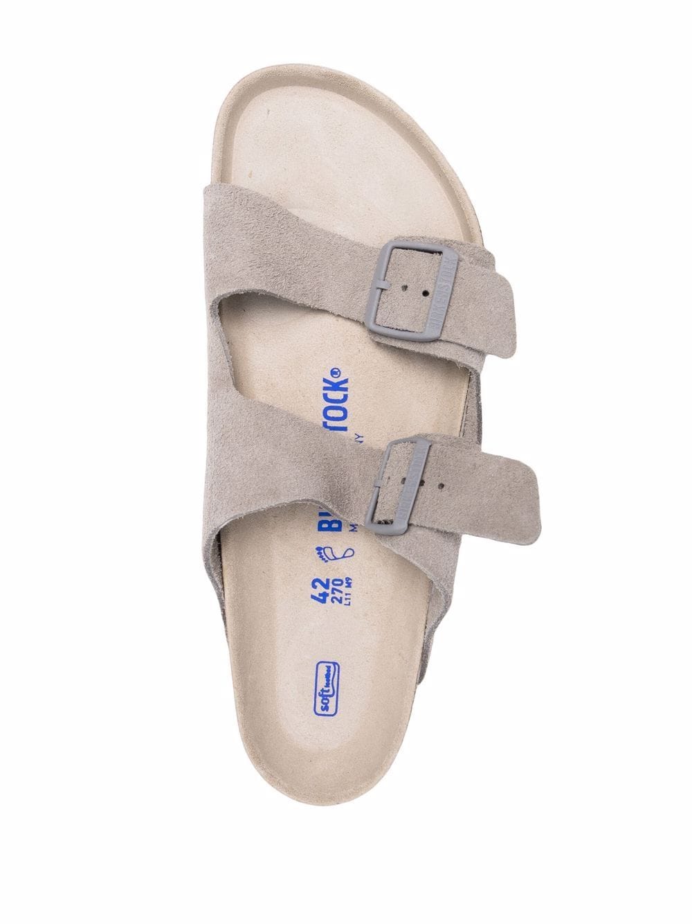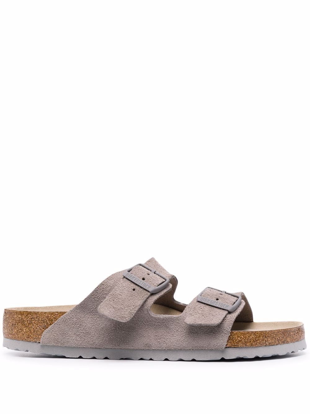 stone grey nubuck leather double-strap design open toe moulded footbed slip-on style