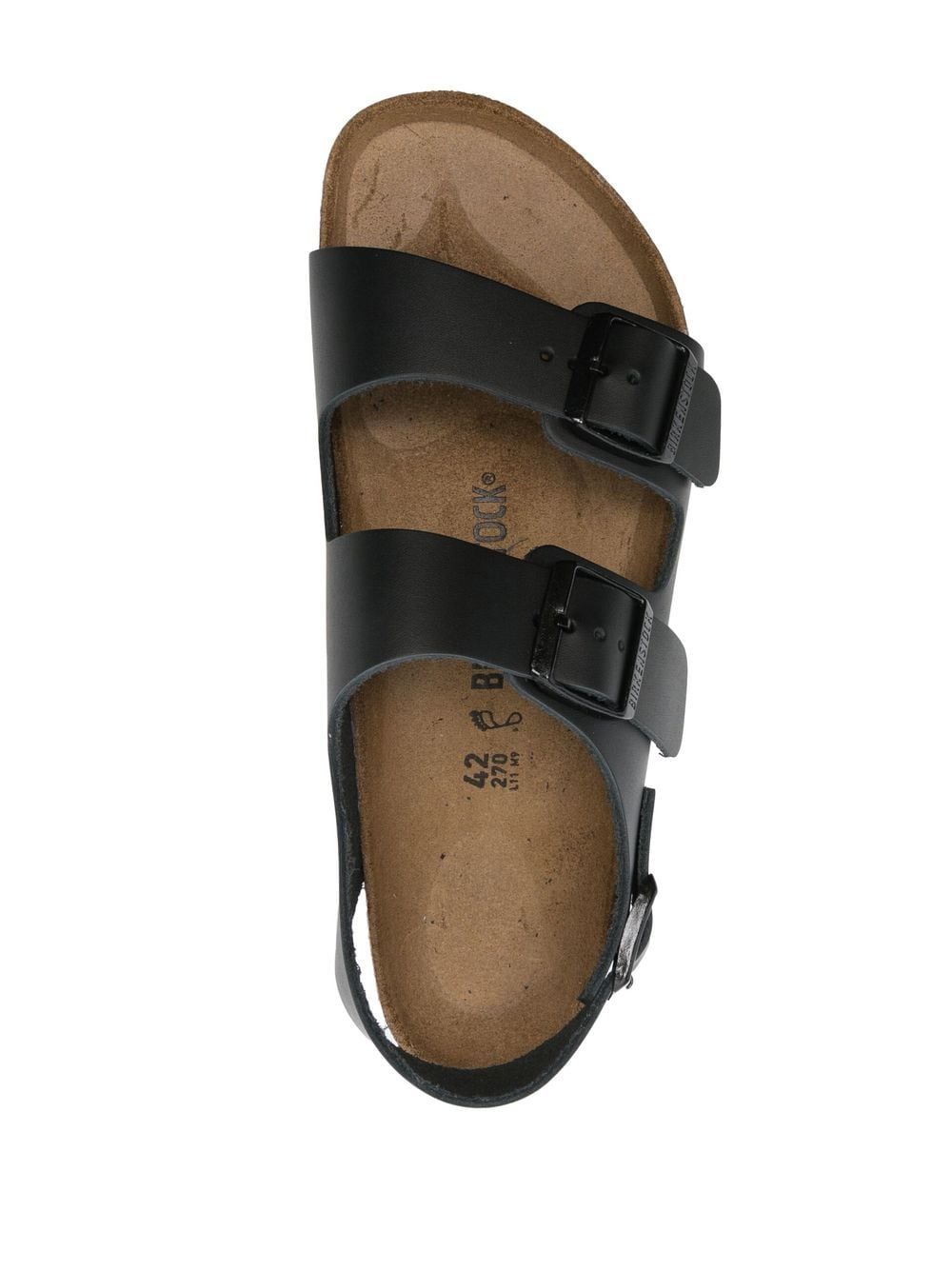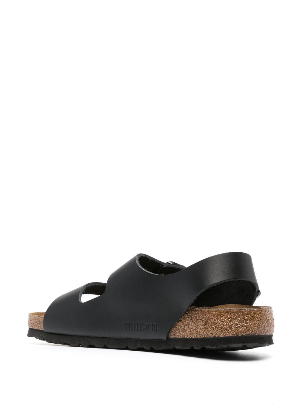 jet black calf leather slingback strap side buckle fastening open toe branded insole flat rubber sole