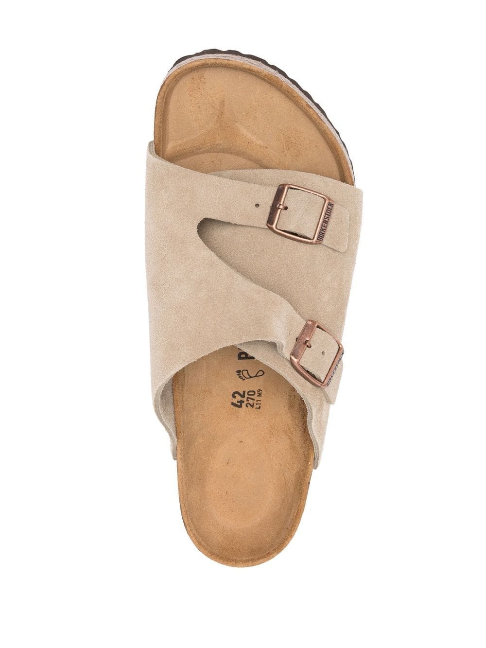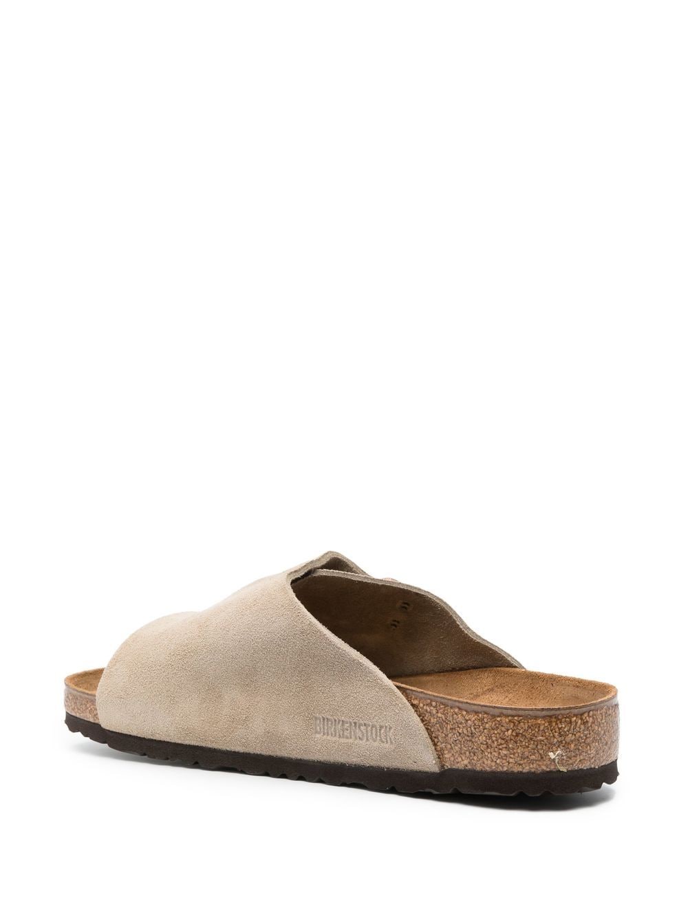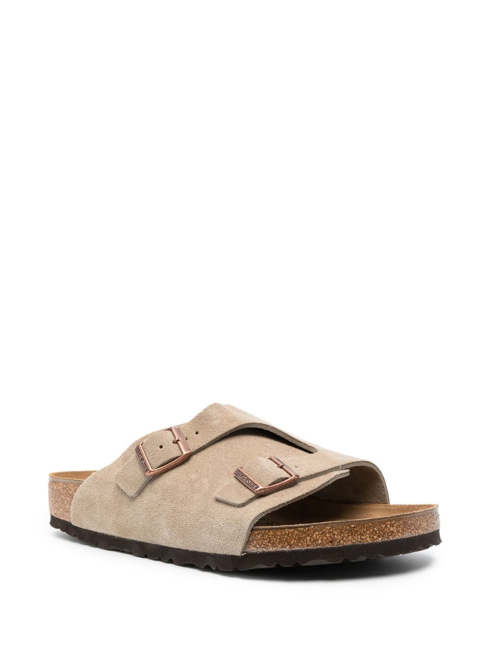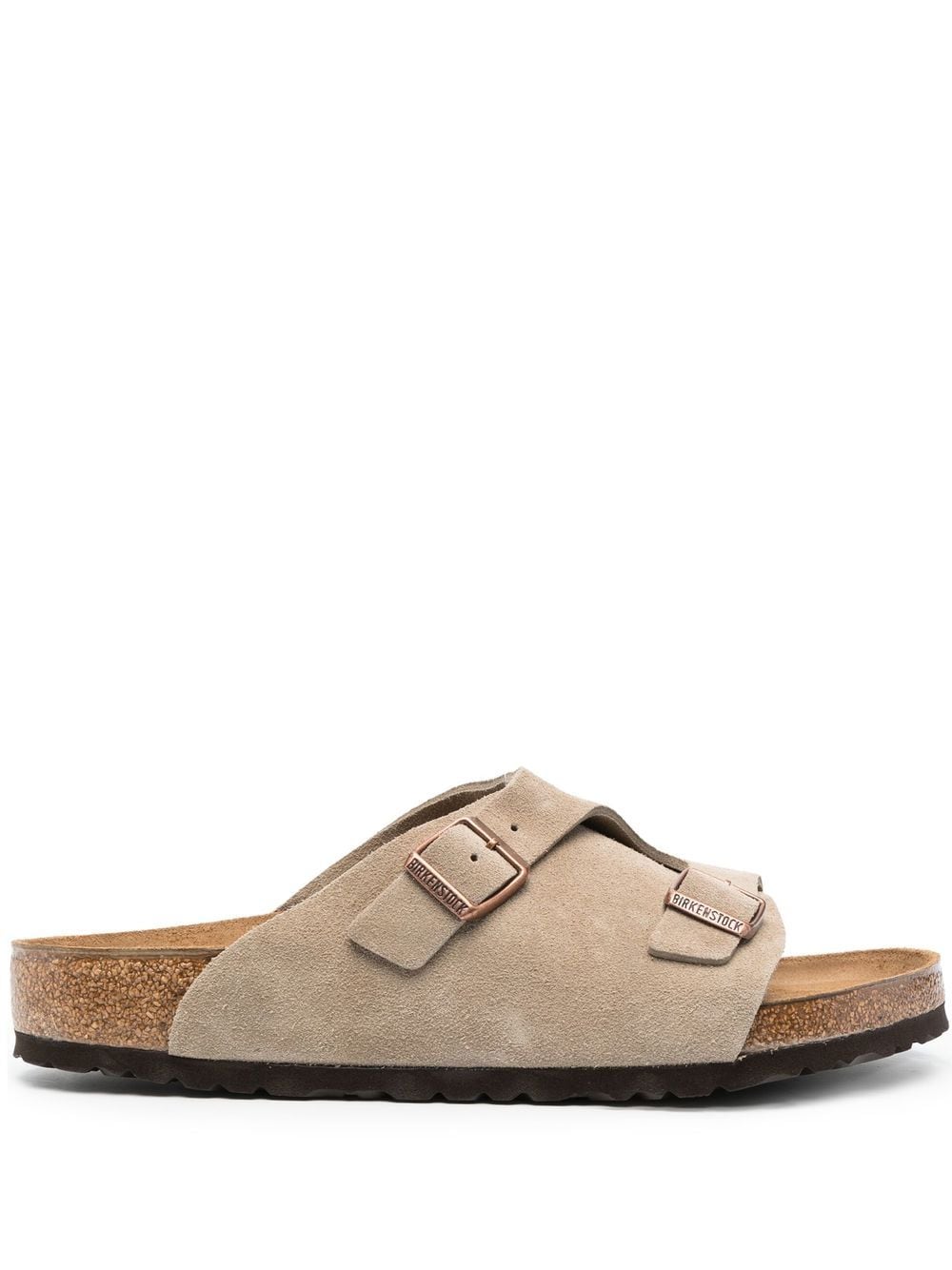 taupe suede buckle fastening slip-on style open toe moulded footbed flat rubber sole