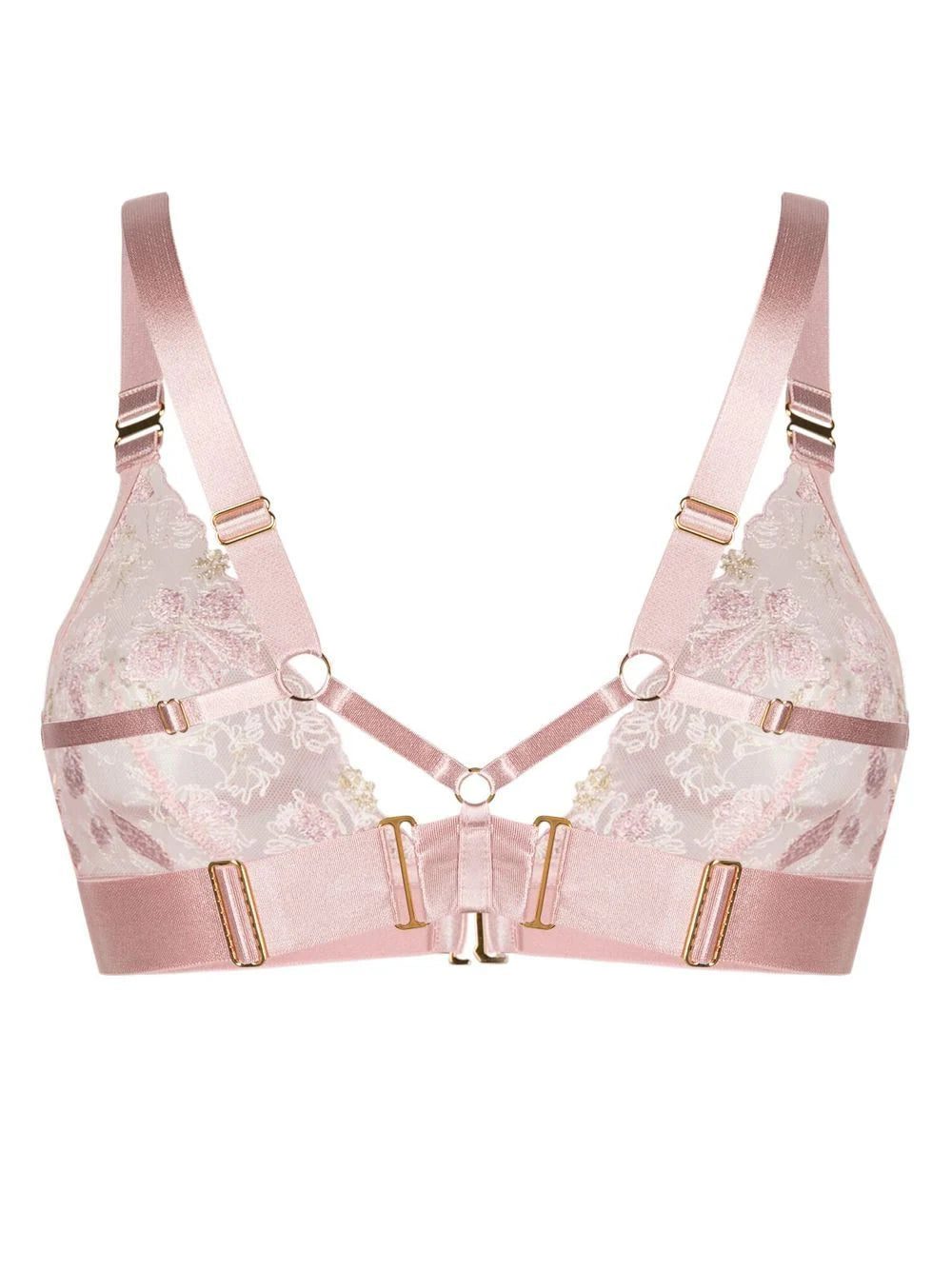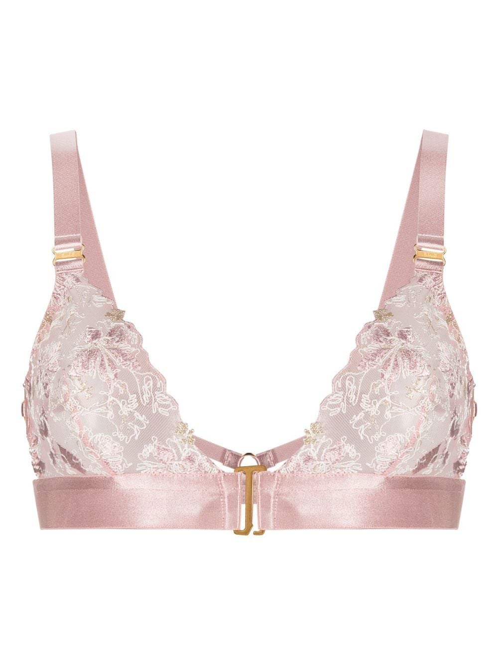 rose pink floral-lace detailing satin trim triangle cup elasticated underband front clasp fastening adjustable shoulder straps gold-tone hardware