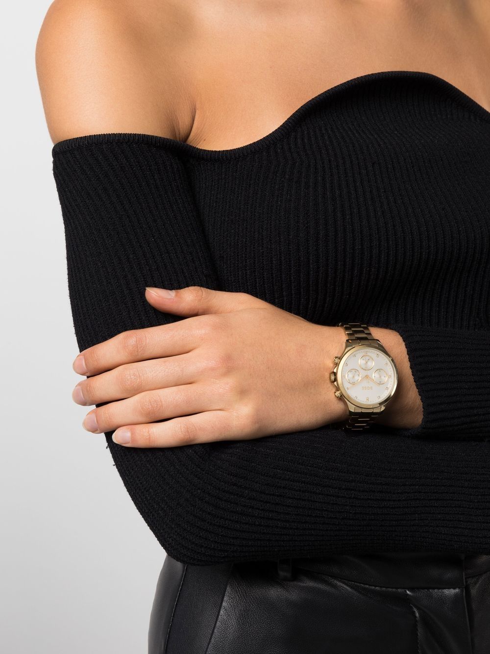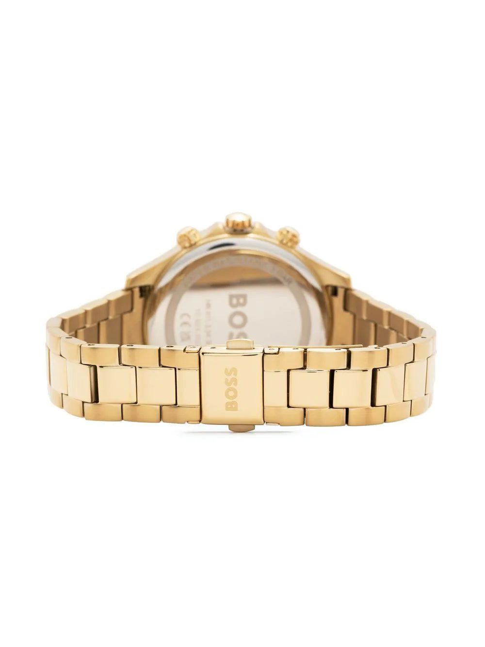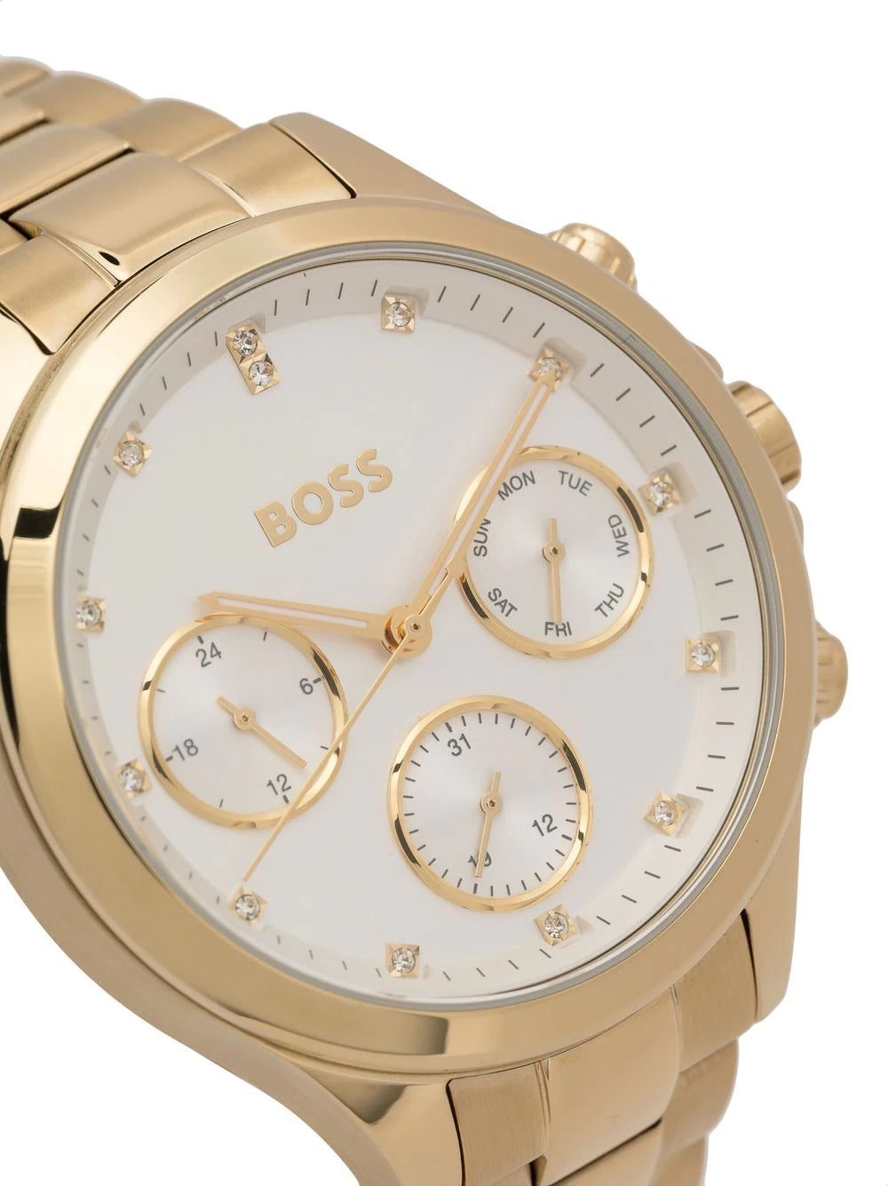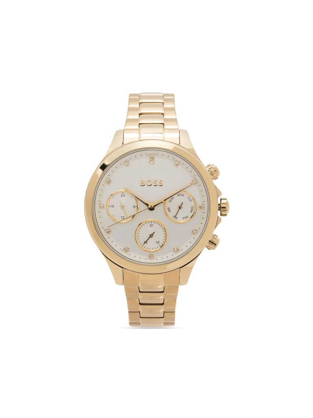 Hera 37mm from BOSS featuring gold-tone, white, chronograph counter, stick hands, quartz movement, round face, deployant-clasp fastening, President bracelet and deployant-clasp fastening.