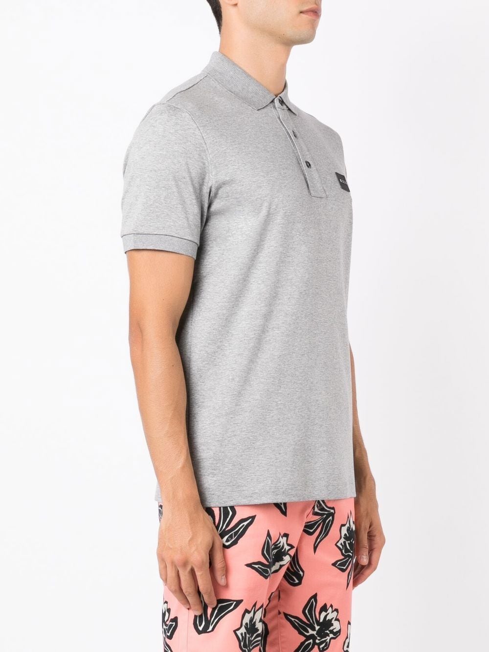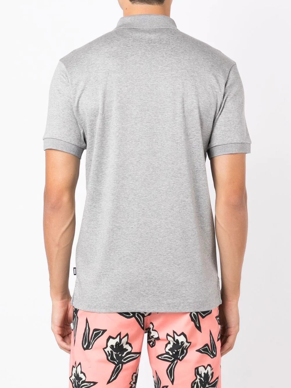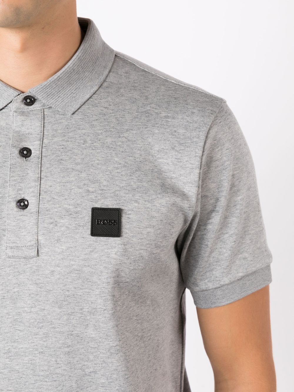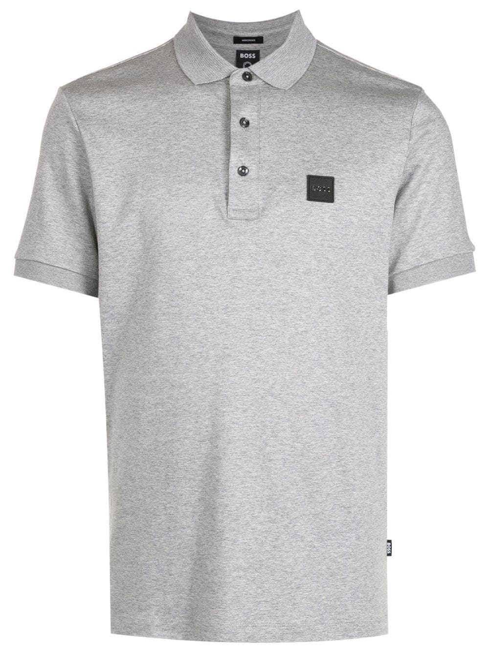 logo-patch short-sleeved polo shirt from BOSS featuring cotton, grey, logo patch to the front, polo collar, front button placket and short sleeves.