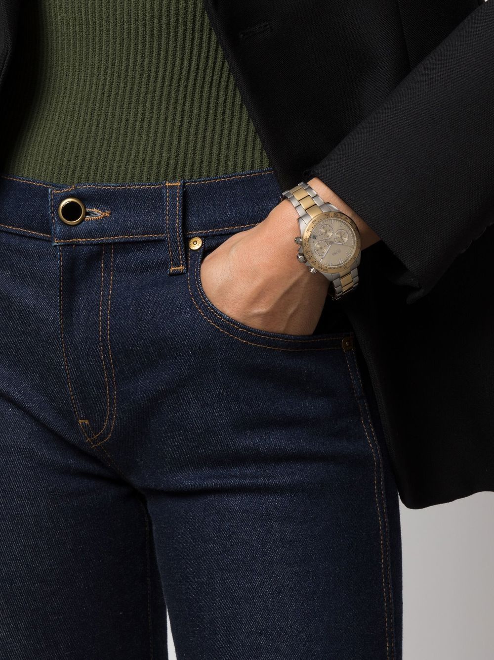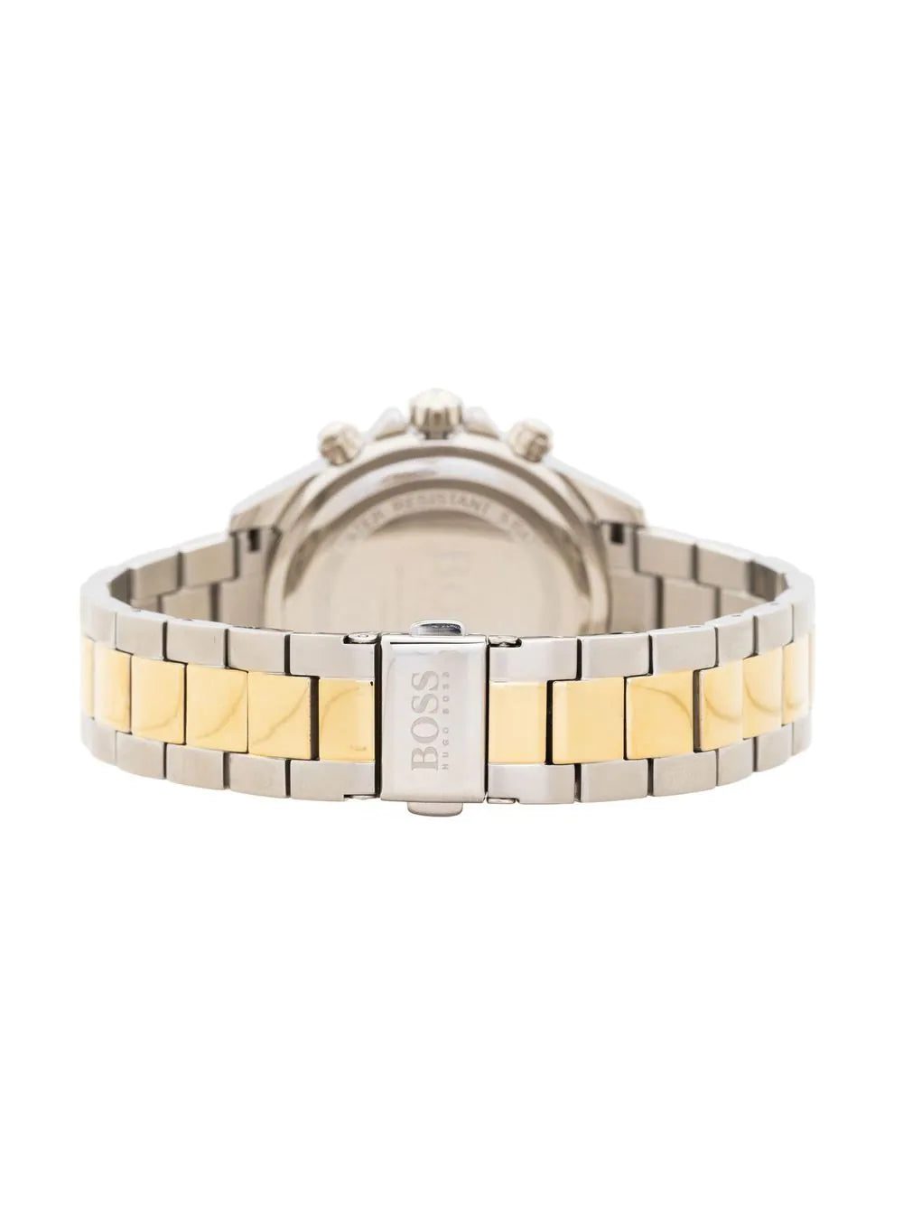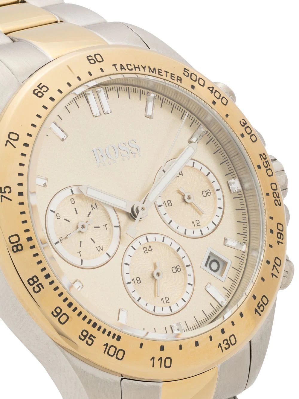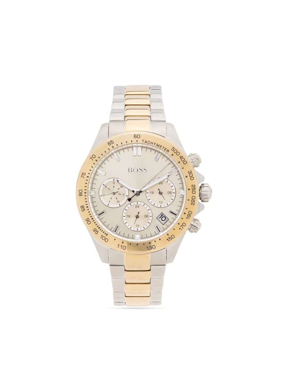 Novia chronograph 38mm from BOSS featuring champagne, stainless steel, round face, quartz movement, adjustable link bracelet, clasp fastening, fixed tachymeter bezel, index dial, baton hands, three chronograph sub-dials, date indication, screw-down crown and two chronograph pushers. This item comes with a standard two-year warranty from the boutique..