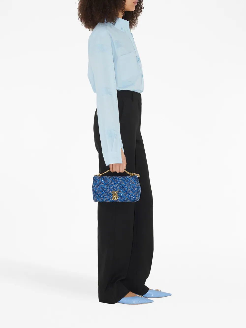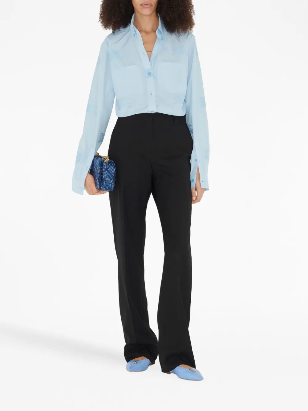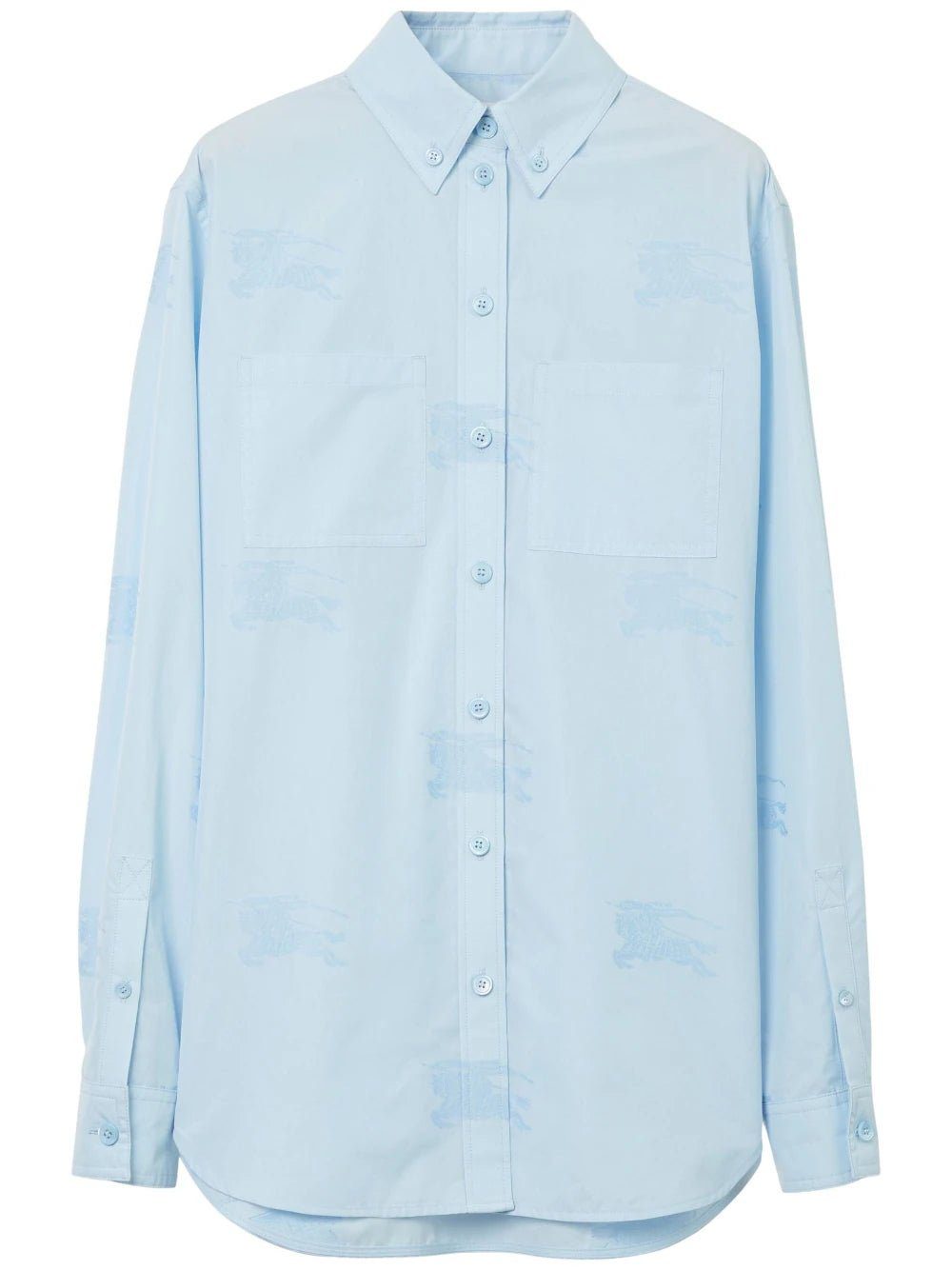 EKD cotton oversized shirt from BURBERRY featuring baby blue, cotton, signature Equestrian Knight motif, classic collar, front button fastening, two chest patch pockets, drop shoulder, long sleeves, buttoned cuffs and curved hem.