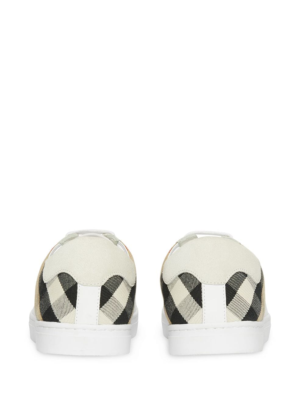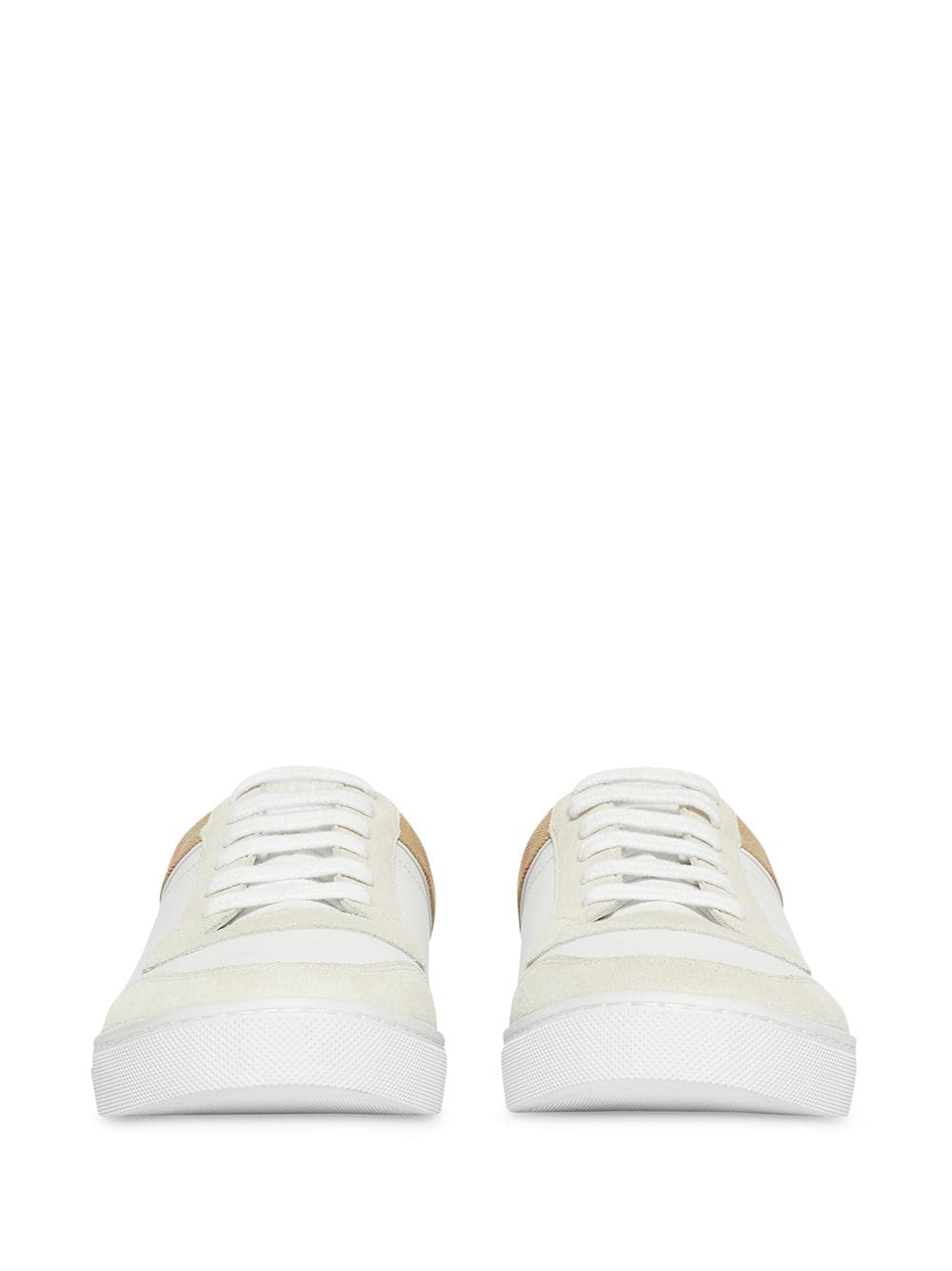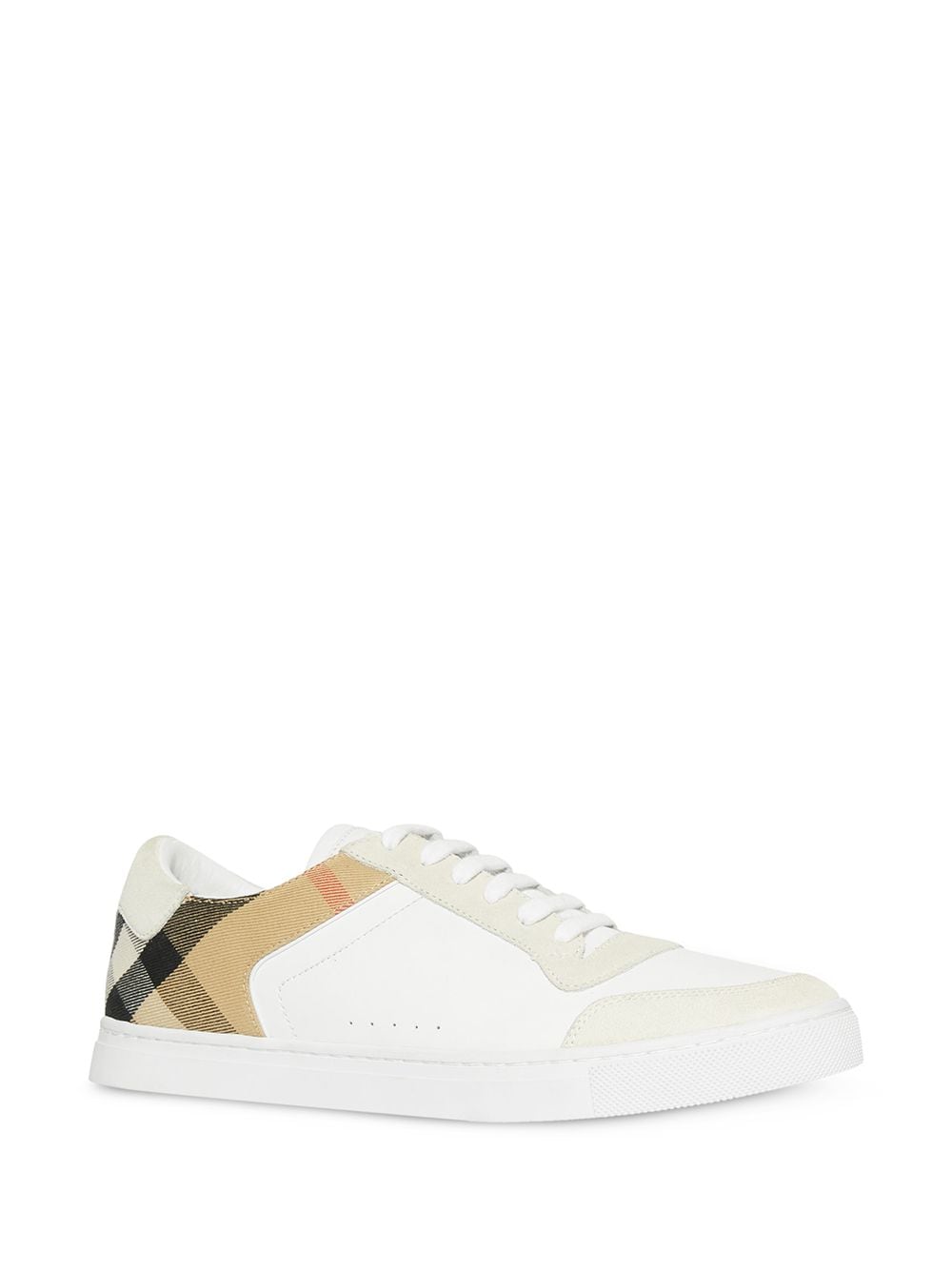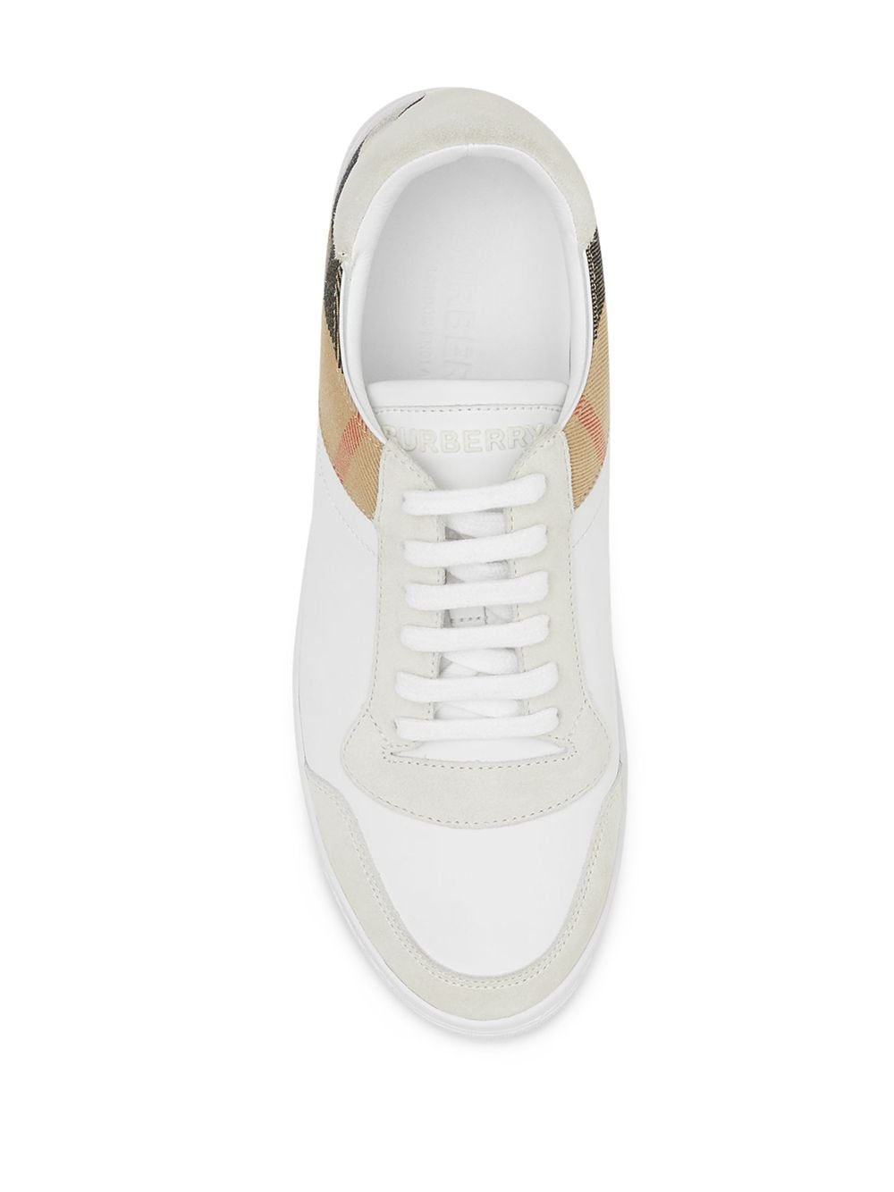 Kickstart your days with these white calf leather, calf suede and sheepskin and Archive beige cotton blend House Check panel sneakers from Burberry. Checkmate. Featuring contrasting panels, a brand embossed tongue, a lace-up front fastening, a perforated detail, a round toe and a flat rubber sole.