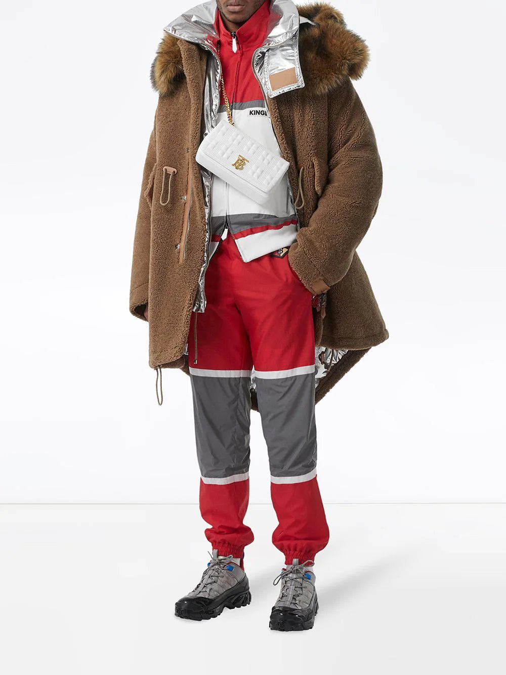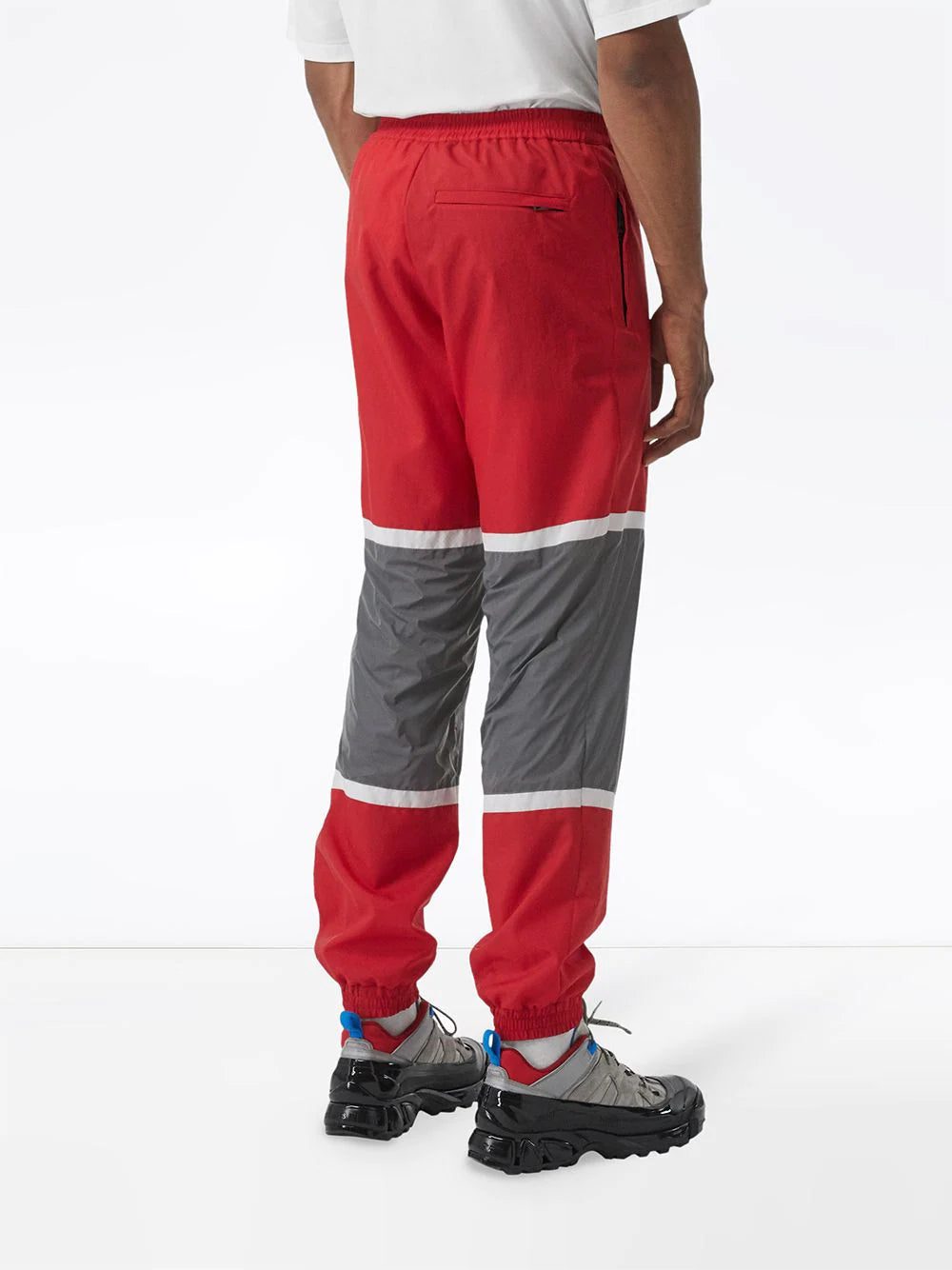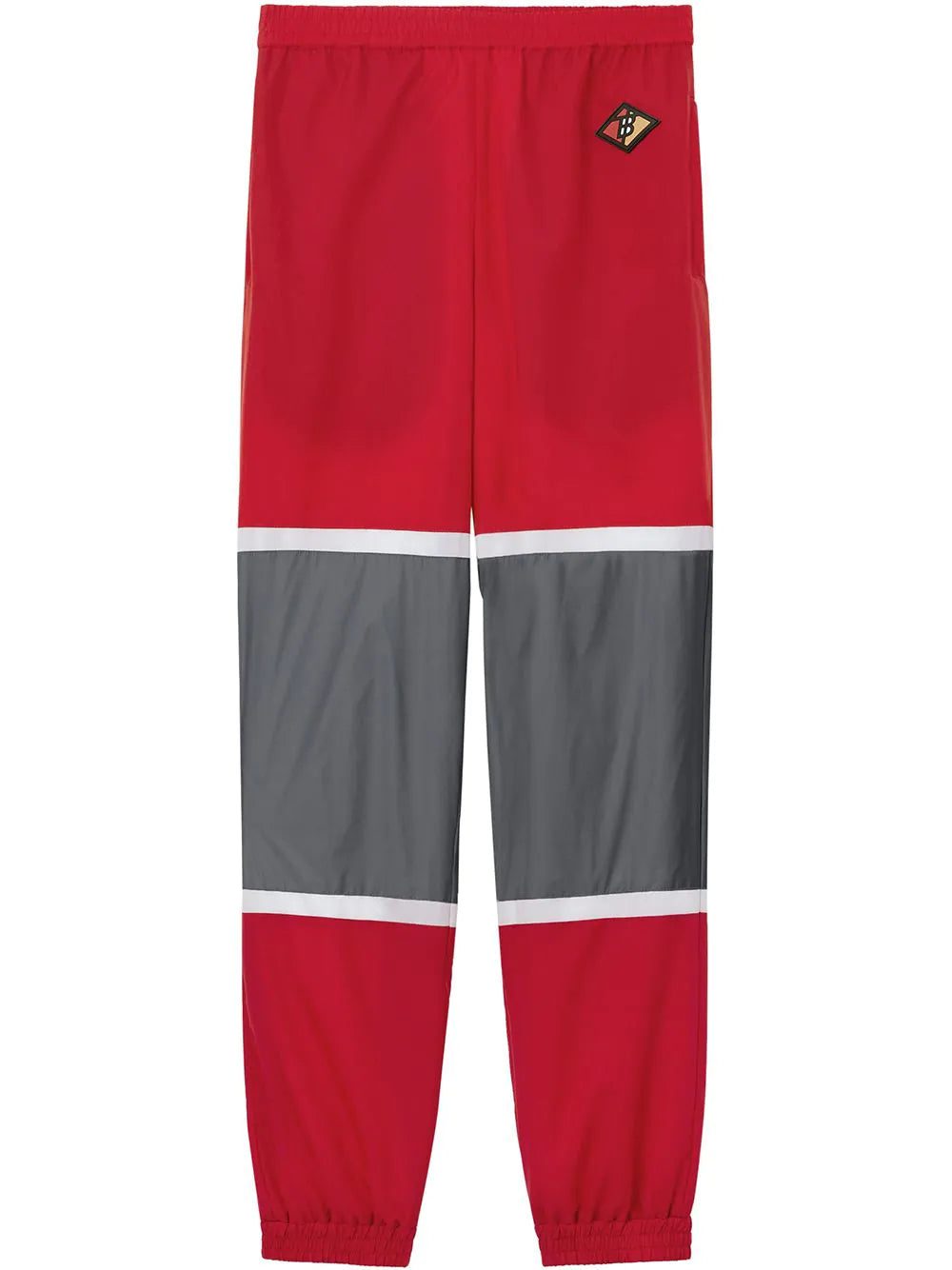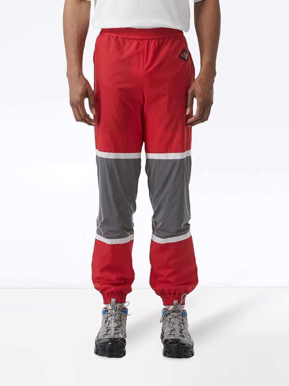 Colour-block trackpants in nylon with contrasting panels, appliquéd with a logo graphic inspired by 1990s British culture.
