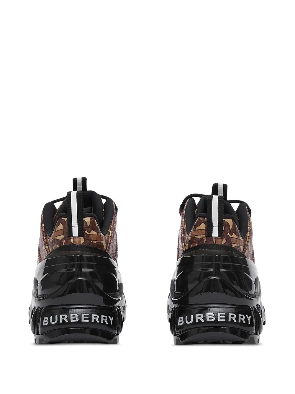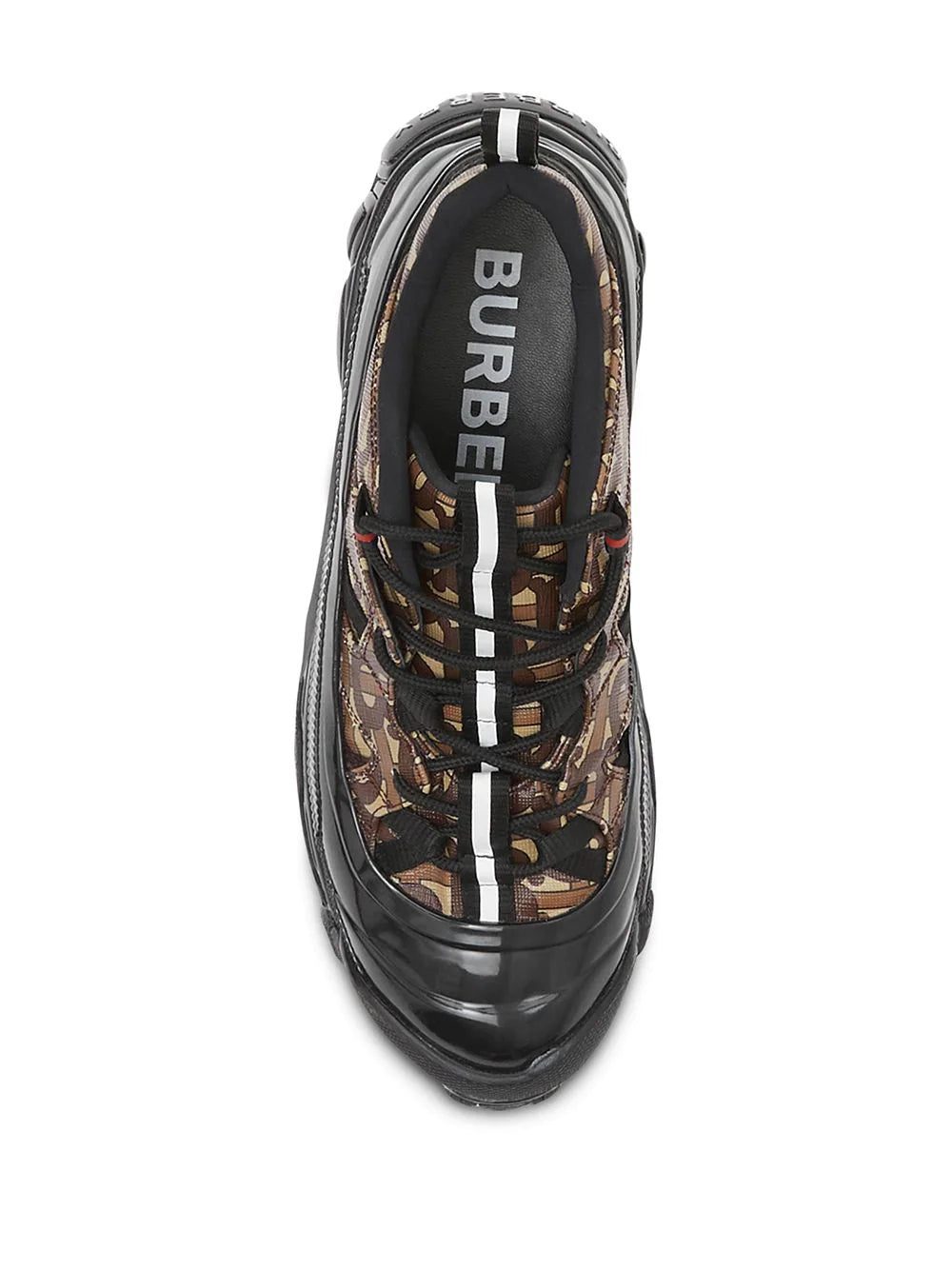 Raining outside? No big deal. Inspired by rain boots, these monogram print Arthur sneakers from Burberry will protect you from bad weather days in style. Stylish and practical. What else? Featuring a round toe, a lace-up front fastening, a monogram print, a pull tab at the rear, a flat rubber sole, a cross-detailed tread and an embossed Burberry lettering at heel.
