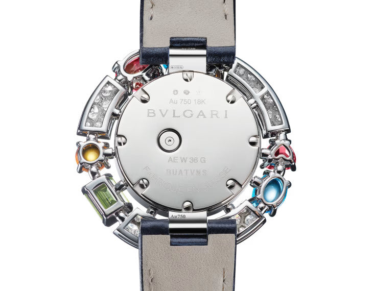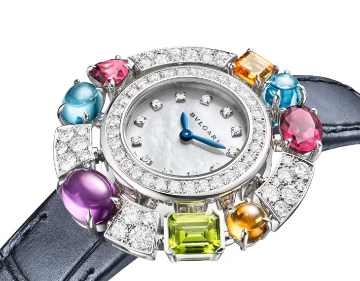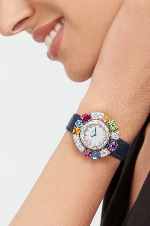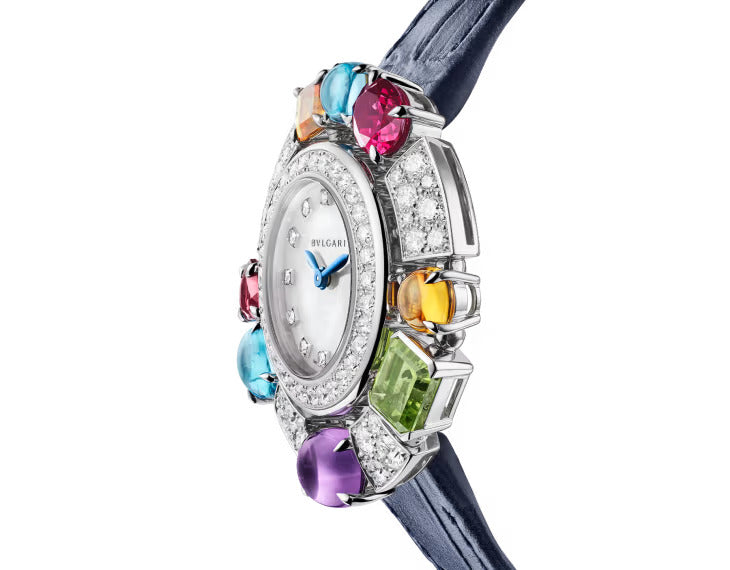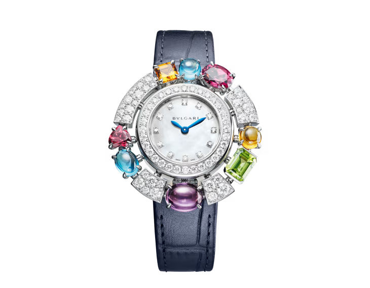 Capturing the joy and exuberance of la Dolce Vita, the Allegra cocktail watch in 18 kt white gold unites irresistible style and jewellery-making expertise into a vivacious and dazzling creation. The mesmerizing mix of faceted and cabochon stones - including diamonds,citrines, amethysts, blue topazes, peridots and rhodolites - celebrates the joy of colour and is matched with a refined mother-of-pearl dial lit by diamond indexes and a blue alligator bracelet, for an elegant yet vibrant effect.