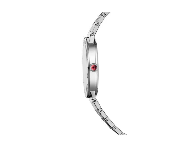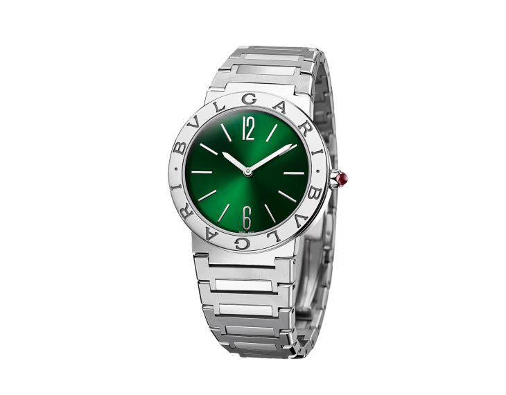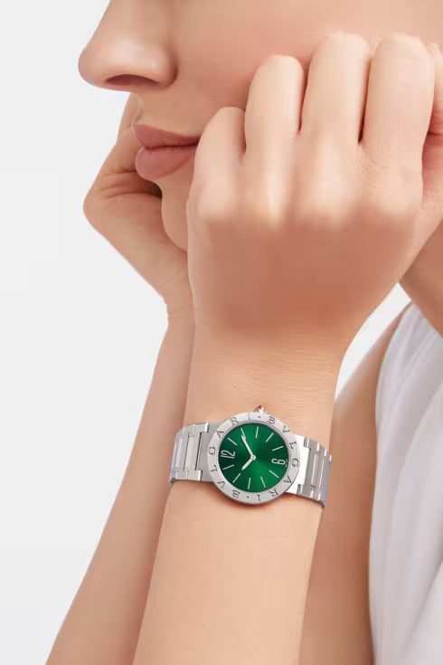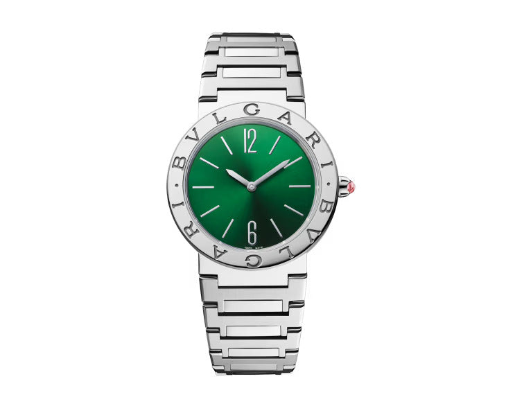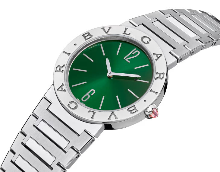 Bvlgari has been reinventing classic inspirations into pioneering designs for over 40 years. Bvlgari Bvlgari was the very first watch to use a logo as an element of design, an exquisite example of the brand’s creativity and craftsmanship. A front runner in today’s “logomania” movement; the distinctive double circular engraving was initially inspired by the curved inscriptions on ancient coins, growing from the Roman roots of the brand into an elegant fusion of culture and modernity, a true representation of everyday glamour. Bvlgari Bvlgari Lady watch with quartz movement, 33 mm stainless steel case, stainless steel bezel with logo, stainless steel crown set with synthetic cabochon-cut rubellite, green sun-brushed dial, date window and stainless steel bracelet.