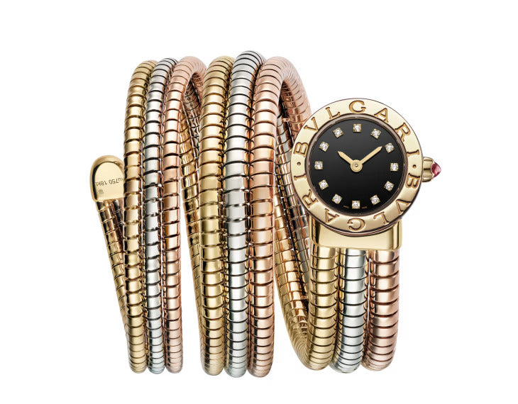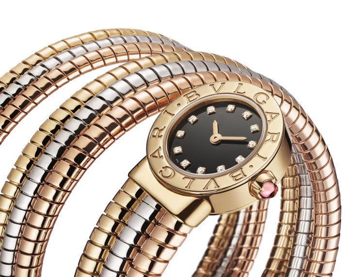 Bvlgari Bvlgari Tubogas watch with quartz movement, hours and minutes functions, 21 mm 18 kt yellow gold case, 18 kt yellow gold bezel engraved with double logo, black lacquered dial, 12 round brilliant-cut diamond indexes, 18 kt yellow gold crown set with a cabochon-cut pink rubellite, double-spiral mini Tubogas bracelet in 18 kt yellow, white and rose gold. Water-resistant up to 50 metres.